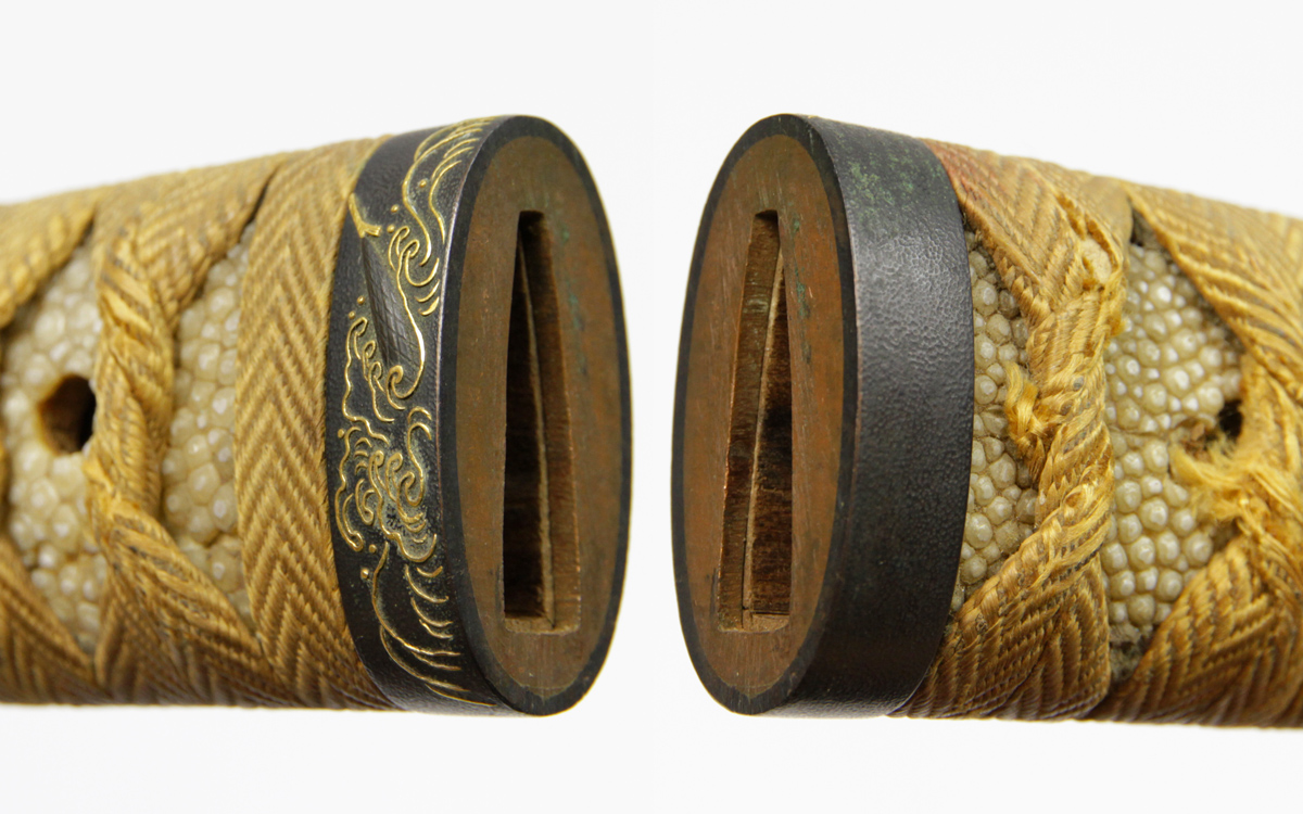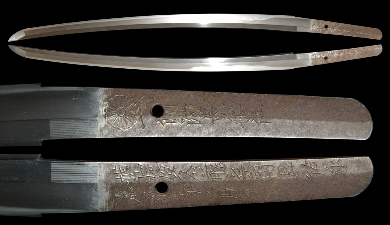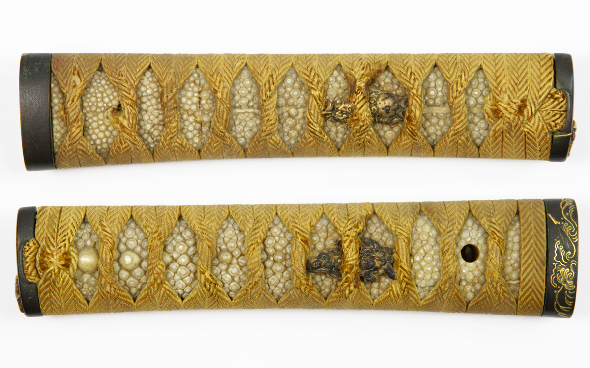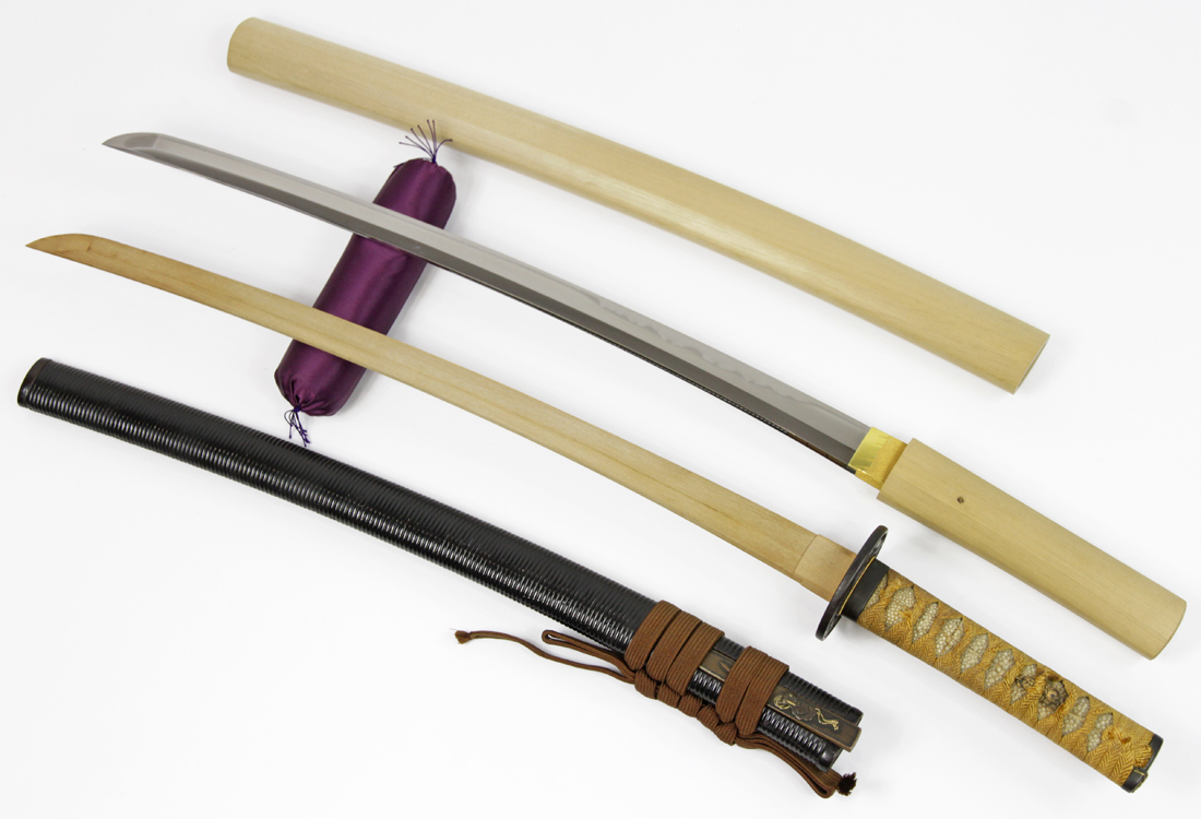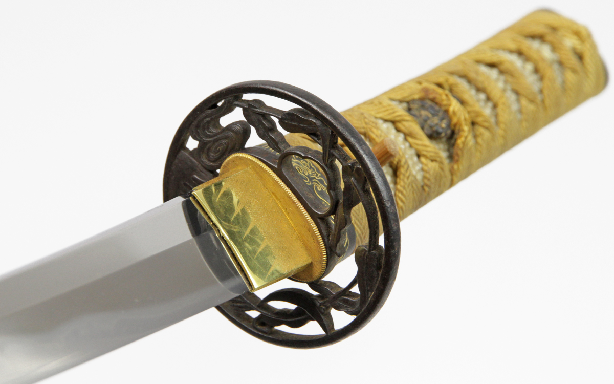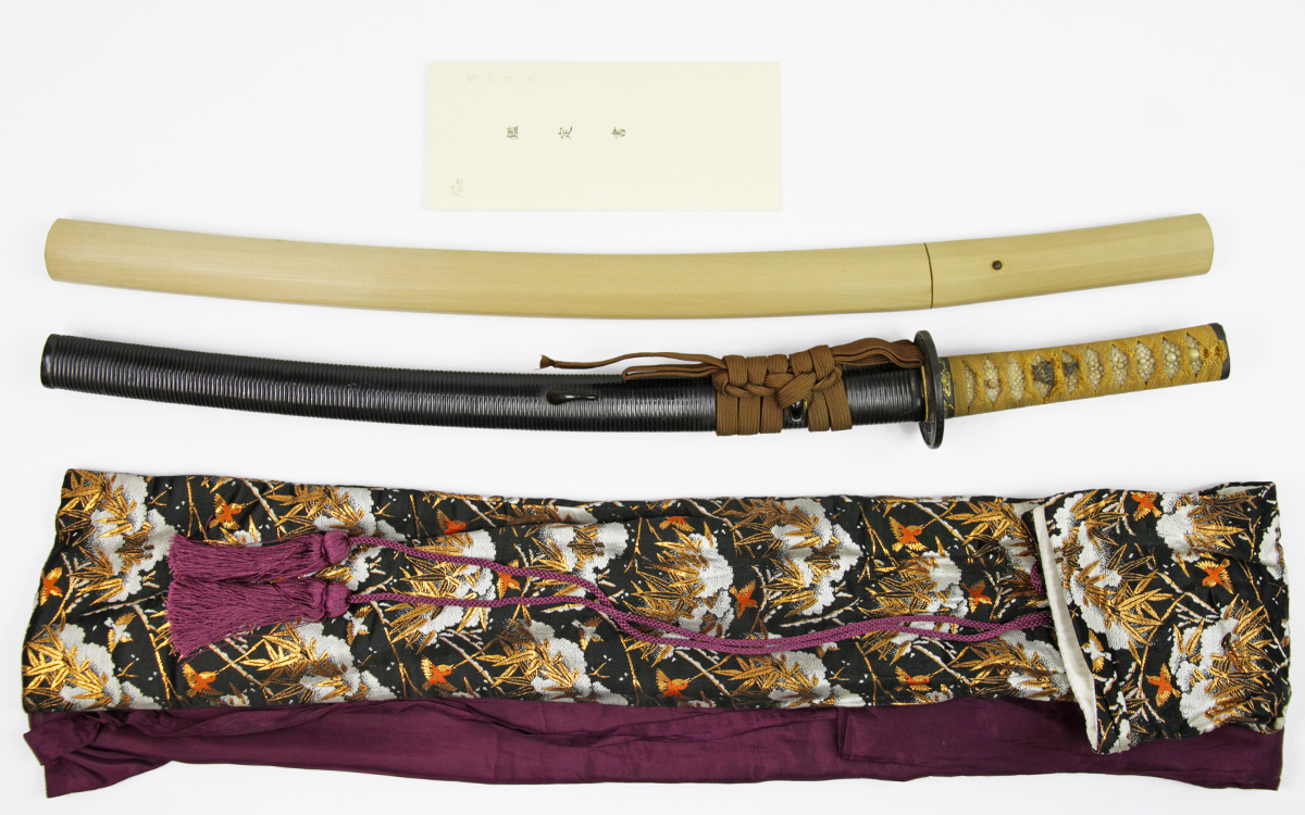 11/21/17 – Late Edo Wakizashi with a highly coveted Nihonto Origami (Japanese Sword Authentication Paper) from the Society for the Preservation of the Japanese Sword (NTHK). The certificate grades the blade as Kanteisho (Important Work) and is very difficult to achieve. The Nakago (tang) is completely unaltered and signed Ichi Yokoyama Kaga no Suke Fujiwara Ason Sukenaga Biyo Osafune Ju, Kaei Third Year, Second Month, which translates to “Number one honorary Lord of Yokoyama Ason Sukenaga, resident of Osafune, February 1849.” The royal Chrysanthemum with number one denotes that Sukenaga achieved imperial recognition as the top smith in the Yokoyama School of Bizen, the highest possible distinction. He worked exclusively in Osafune during the period 1830 – 1851, his production being cut short by a premature death. Sukenaga is included in Fujishiro’s Nihon Toko Jiten (1935) which rates 1,500 swordsmiths; his work is evaluated as Jo Saku (Superior Made). The workmanship exhibited in this Wakizashi is exceptional; the length of the blade remains unaltered with a cutting edge of 50.7 cm / 20 inches. The Hamon (tempered cutting edge) is a combination of Sugu-ha (straight) and Gunome Choji (wave of clove shapes). The Tsuba (handguard) and other metal furniture date to the same period. A rare opportunity to purchase a collector-grade Samurai sword with NTHK papers from a smith recognized by the Emperor of Japan!
