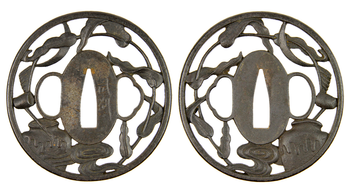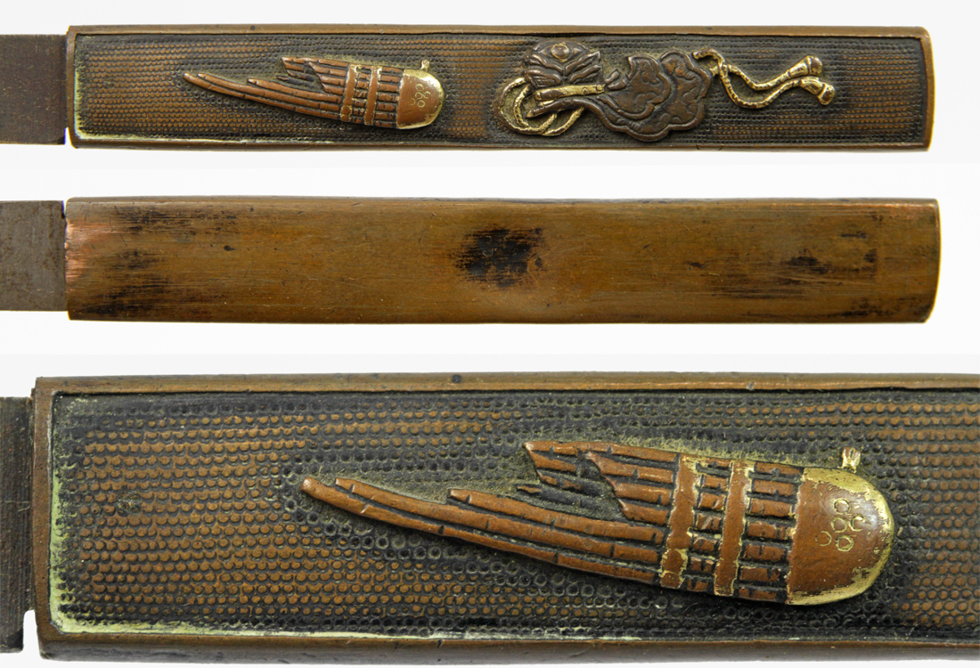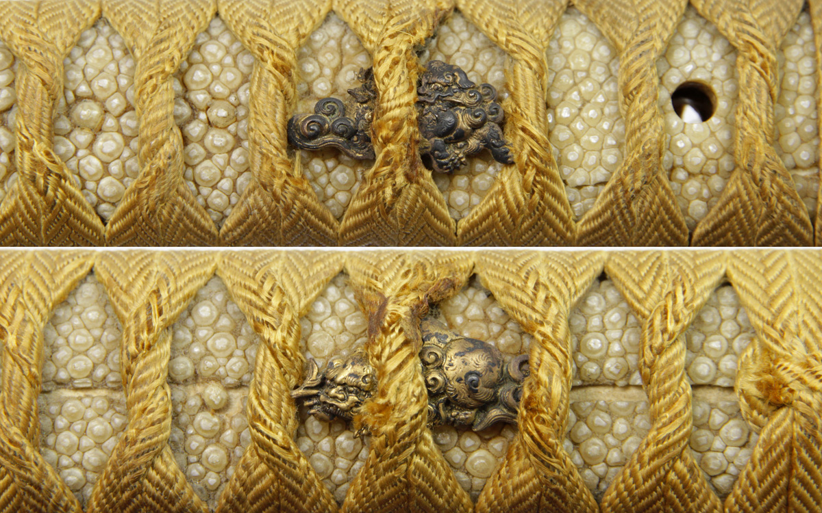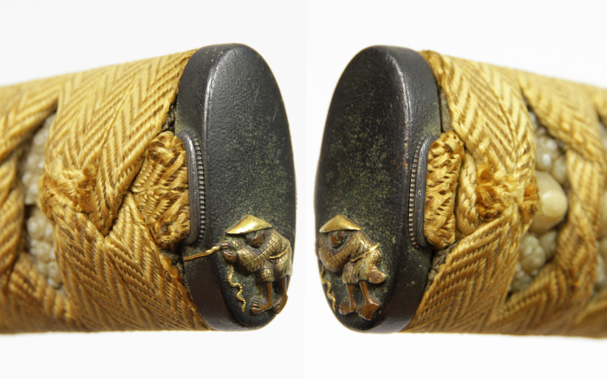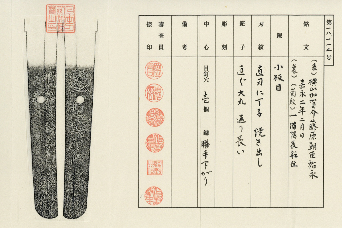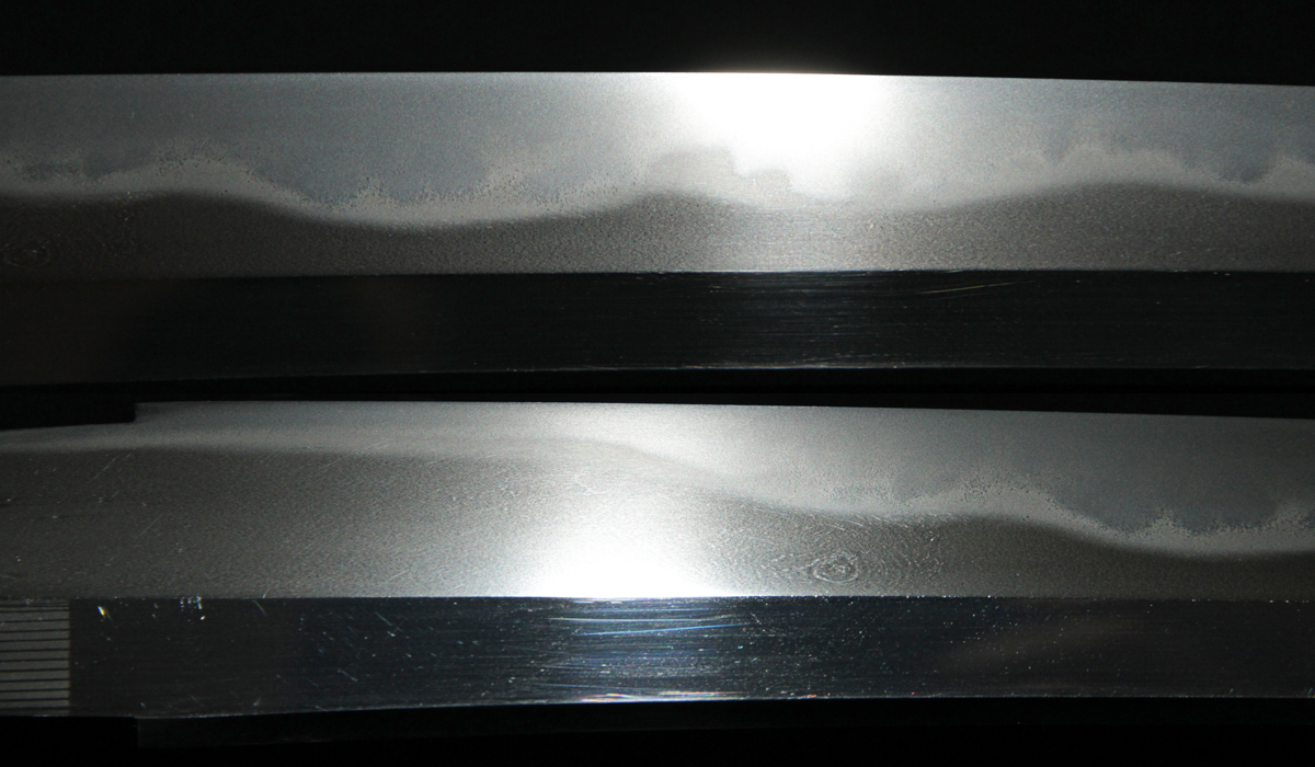 11/21/17 – Late Edo Wakizashi with a highly coveted Nihonto Origami (Japanese Sword Authentication Paper) from the Society for the Preservation of the Japanese Sword (NTHK). The certificate grades the blade as Kanteisho (Important Work) and is very difficult to achieve. The Nakago (tang) is completely unaltered and signed Ichi Yokoyama Kaga no Suke Fujiwara Ason Sukenaga Biyo Osafune Ju, Kaei Third Year, Second Month, which translates to “Number one honorary Lord of Yokoyama Ason Sukenaga, resident of Osafune, February 1849.” The royal Chrysanthemum with number one denotes that Sukenaga achieved imperial recognition as the top smith in the Yokoyama School of Bizen, the highest possible distinction. He worked exclusively in Osafune during the period 1830 – 1851, his production being cut short by a premature death. Sukenaga is included in Fujishiro’s Nihon Toko Jiten (1935) which rates 1,500 swordsmiths; his work is evaluated as Jo Saku (Superior Made). The workmanship exhibited in this Wakizashi is exceptional; the length of the blade remains unaltered with a cutting edge of 50.7 cm / 20 inches. The Hamon (tempered cutting edge) is a combination of Sugu-ha (straight) and Gunome Choji (wave of clove shapes). The Tsuba (handguard) and other metal furniture date to the same period. A rare opportunity to purchase a collector-grade Samurai sword with NTHK papers from a smith recognized by the Emperor of Japan!