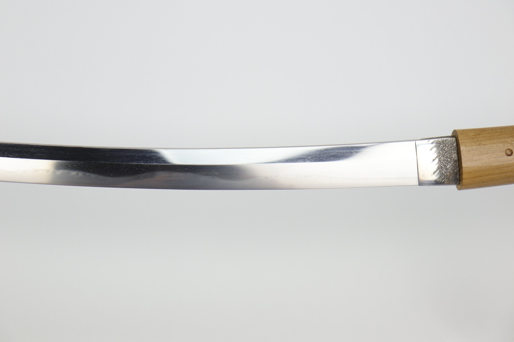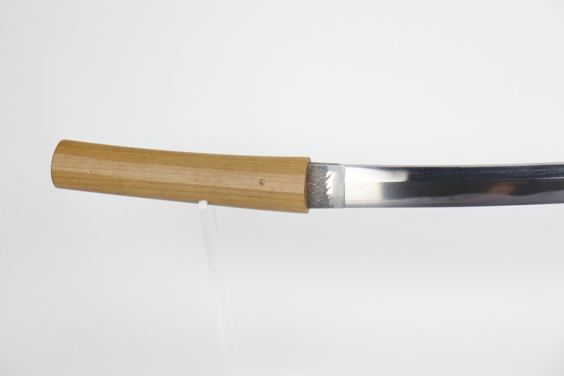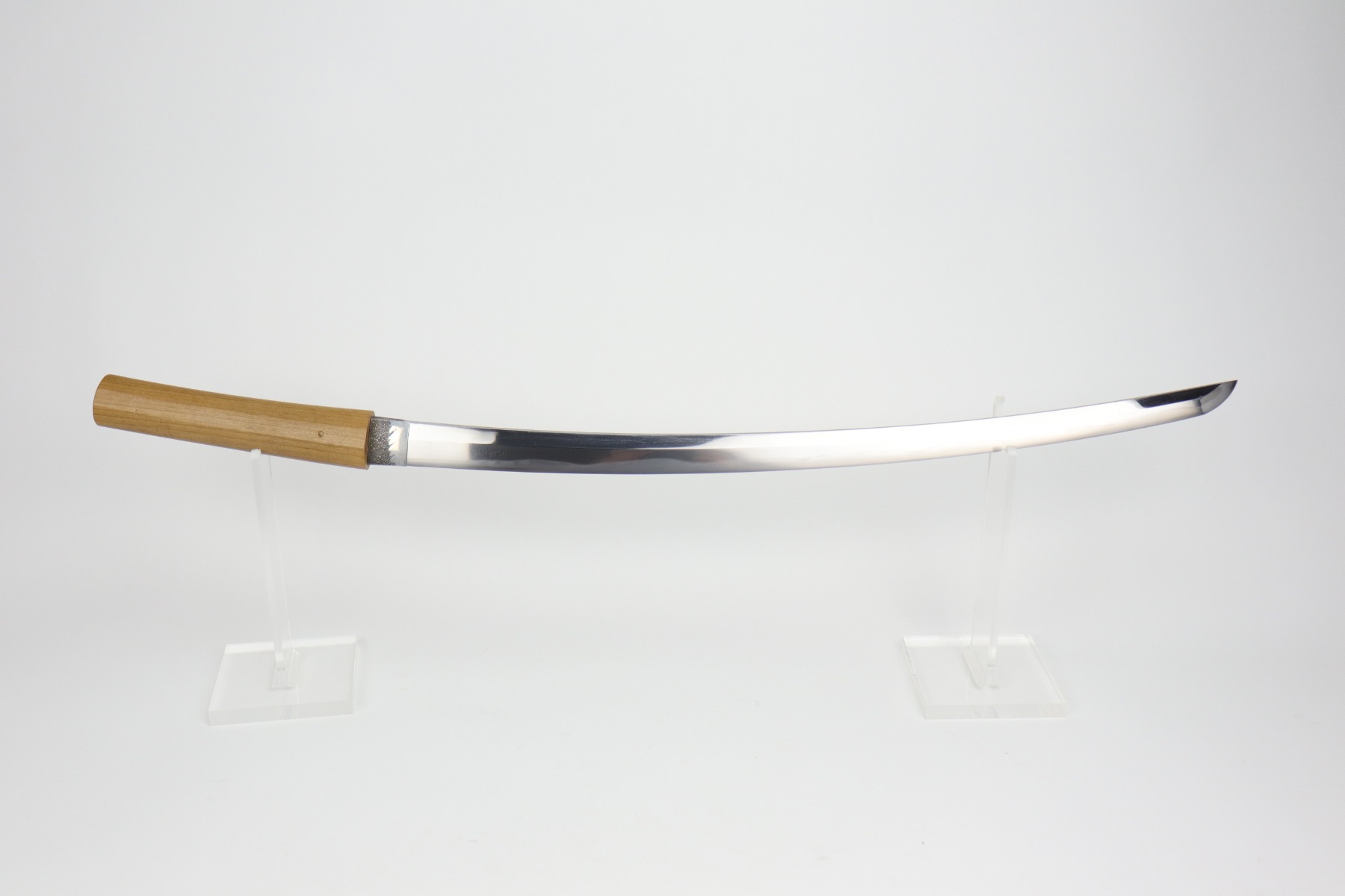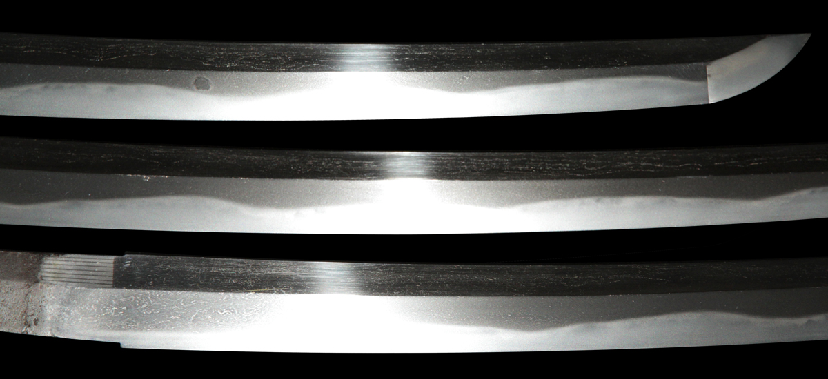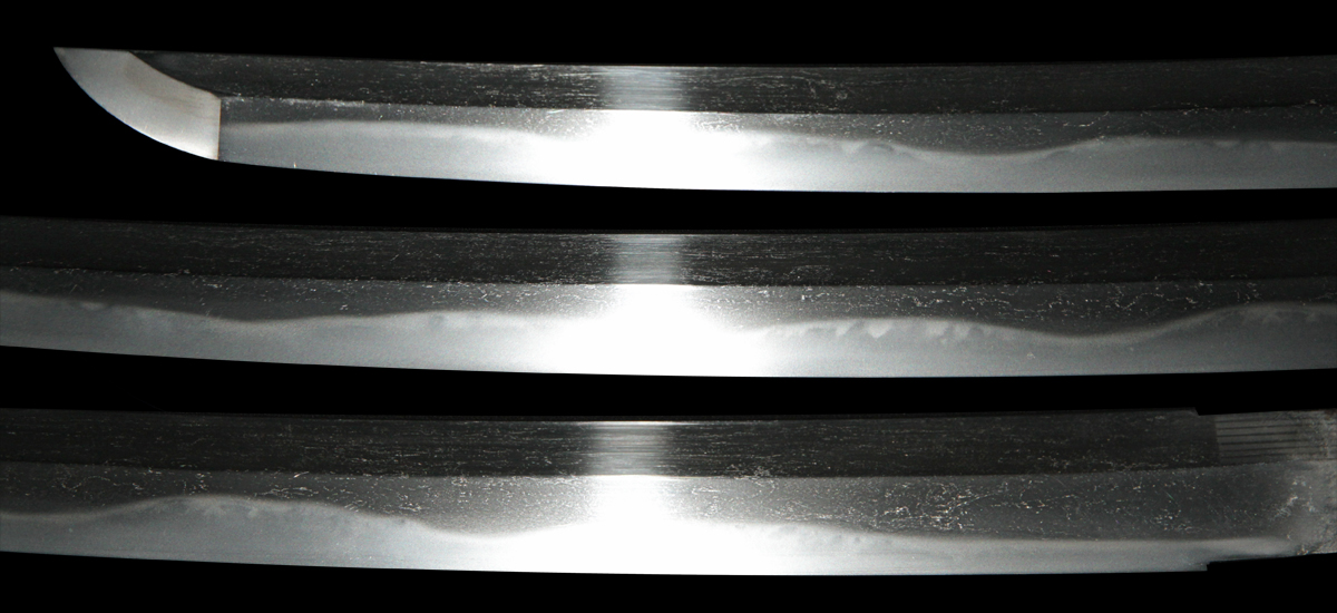Muneshige, a student of Tsuda Sukehiro, worked in Settsu (Osaka) during the period 1661 – 1673. He appears in the Kaiho Kenjaku (1797) listing of superior swordsmiths with a sharpness rating of Wazamono (Good). Muneshige is also included in Fujishiro’s Nihon Toko Jiten (1935) listing which rates 1,500 swordsmiths; his work is evaluated as Chu-jo saku (Above Average). The workmanship exhibited in this blade is exceptional with no forging flaws and the curvature is unusually pronounced (measuring 2.2 cm / 0.9 inches). The length of the blade remains unaltered with a cutting edge of 60.6 cm / 23.9 inches. The Hamon (tempered cutting edge)