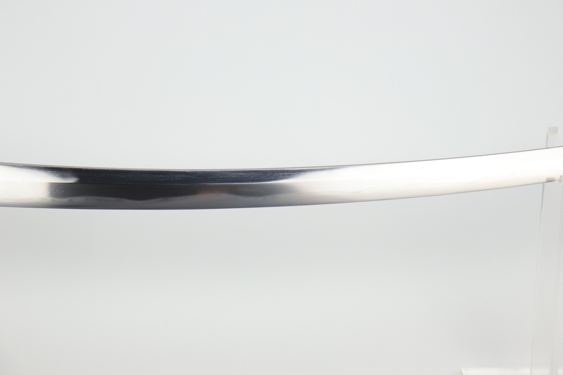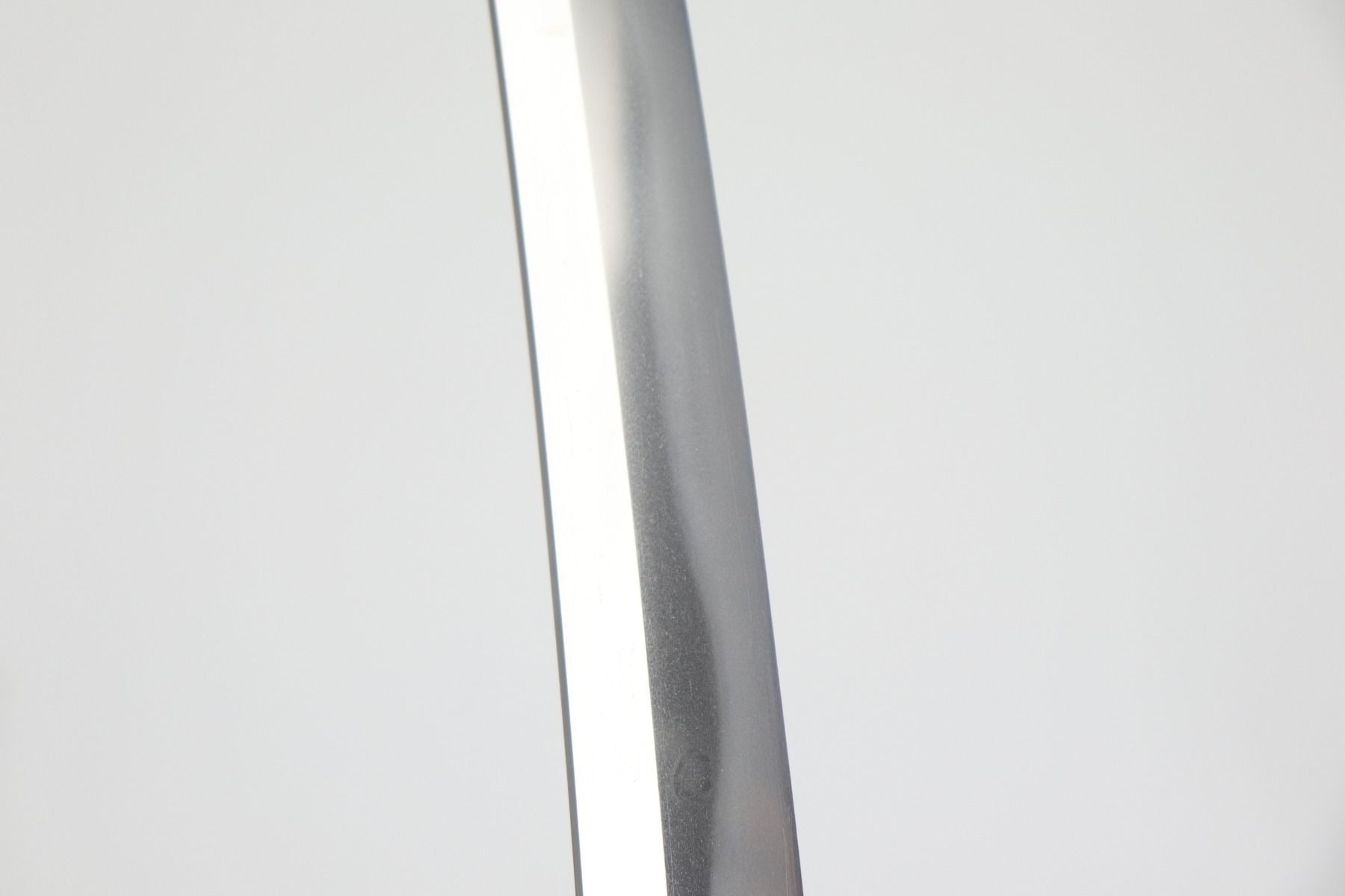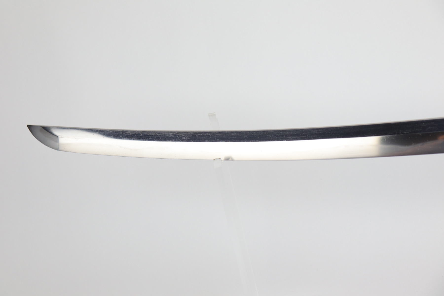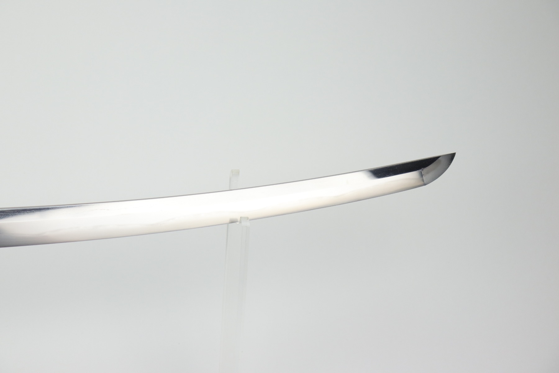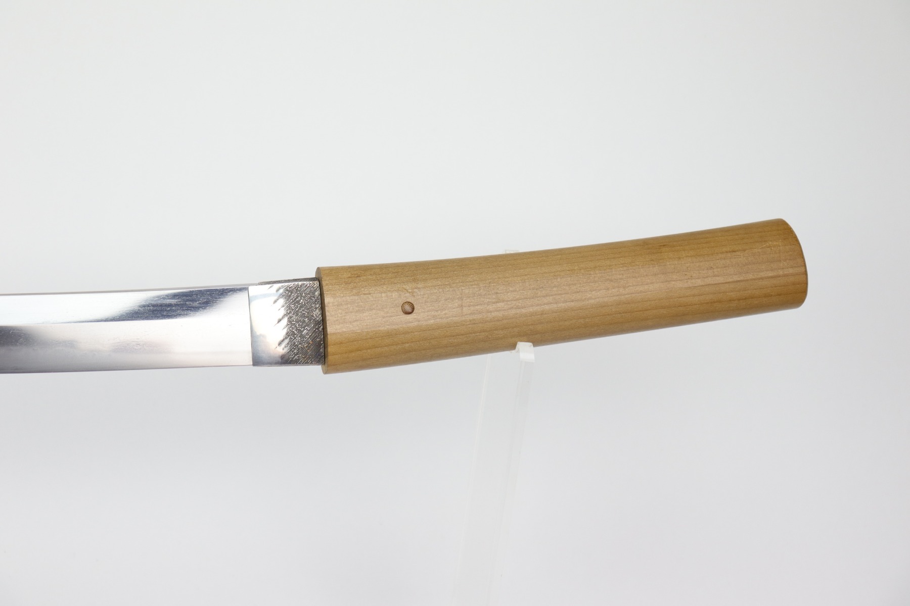 Muneshige, a student of Tsuda Sukehiro, worked in Settsu (Osaka) during the period 1661 – 1673. He appears in the Kaiho Kenjaku (1797) listing of superior swordsmiths with a sharpness rating of Wazamono (Good). Muneshige is also included in Fujishiro’s Nihon Toko Jiten (1935) listing which rates 1,500 swordsmiths; his work is evaluated as Chu-jo saku (Above Average). The workmanship exhibited in this blade is exceptional with no forging flaws and the curvature is unusually pronounced (measuring 2.2 cm / 0.9 inches). The length of the blade remains unaltered with a cutting edge of 60.6 cm / 23.9 inches. The Hamon (tempered cutting edge)