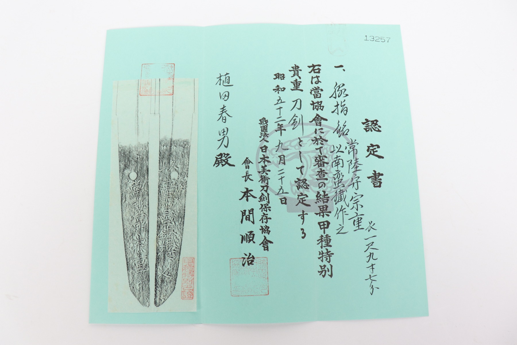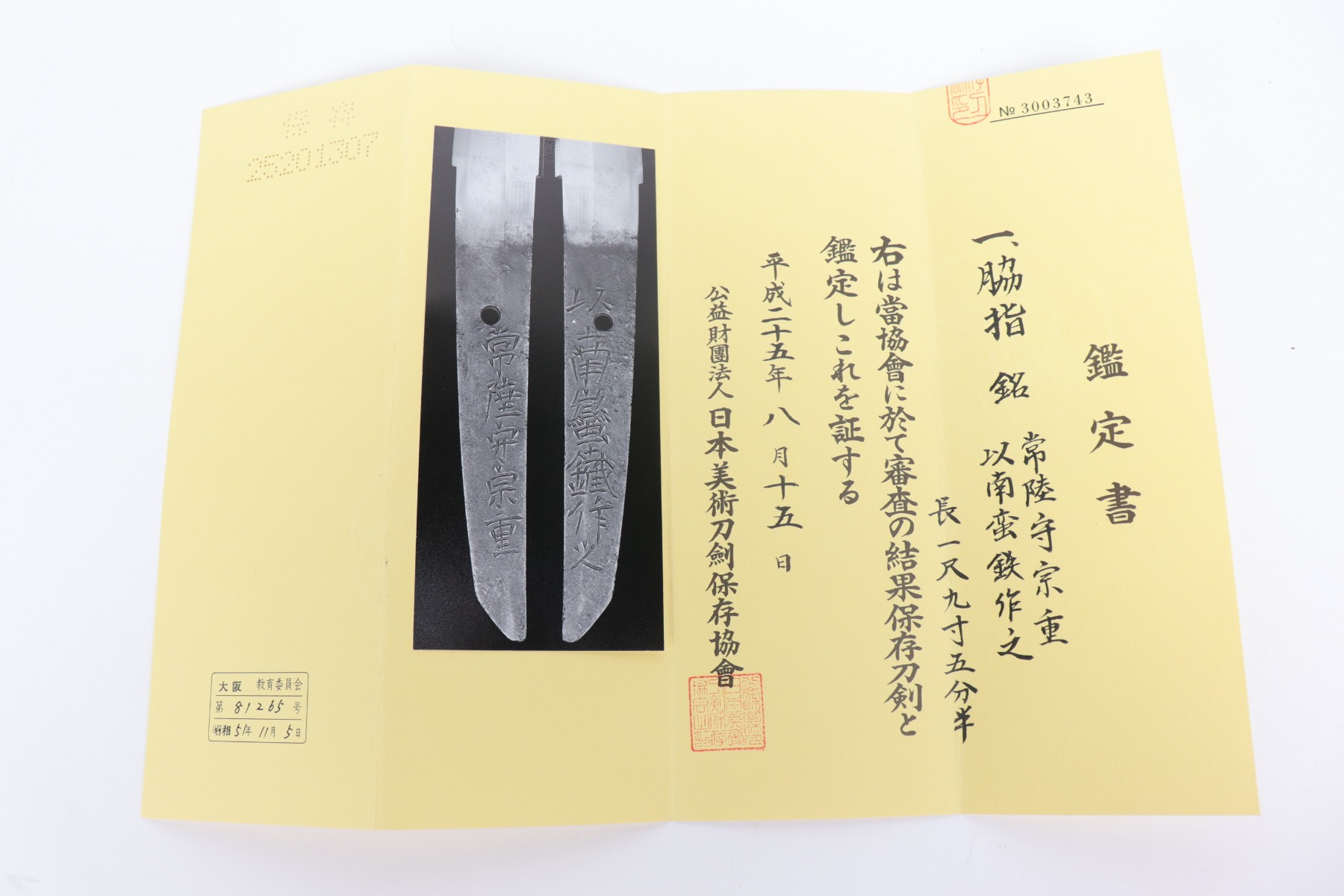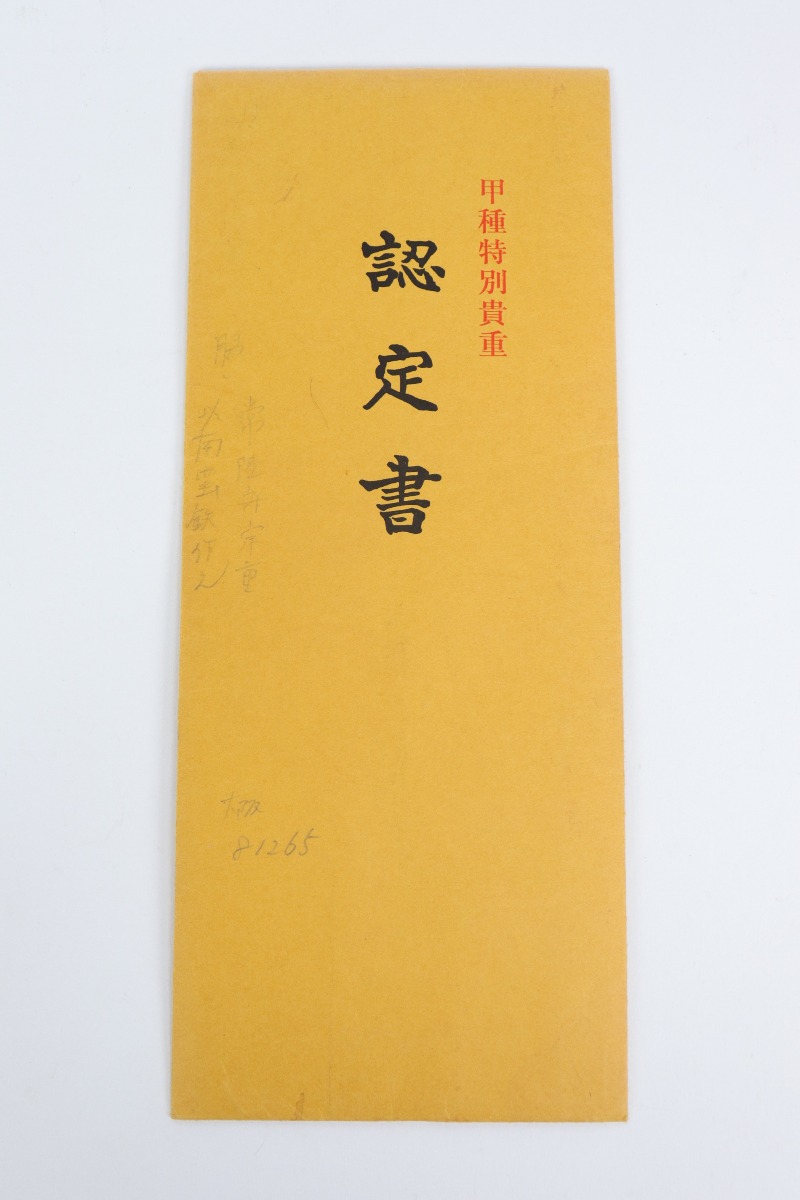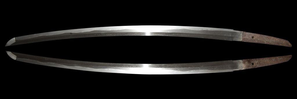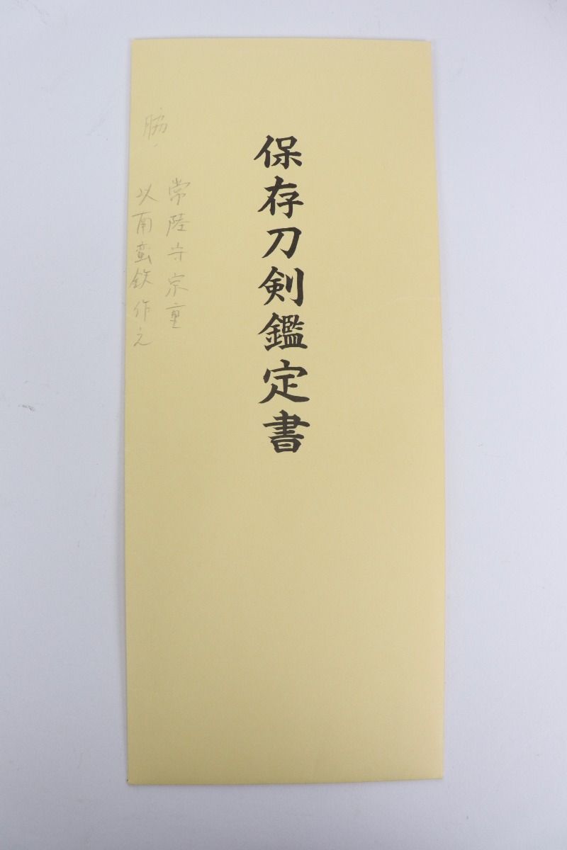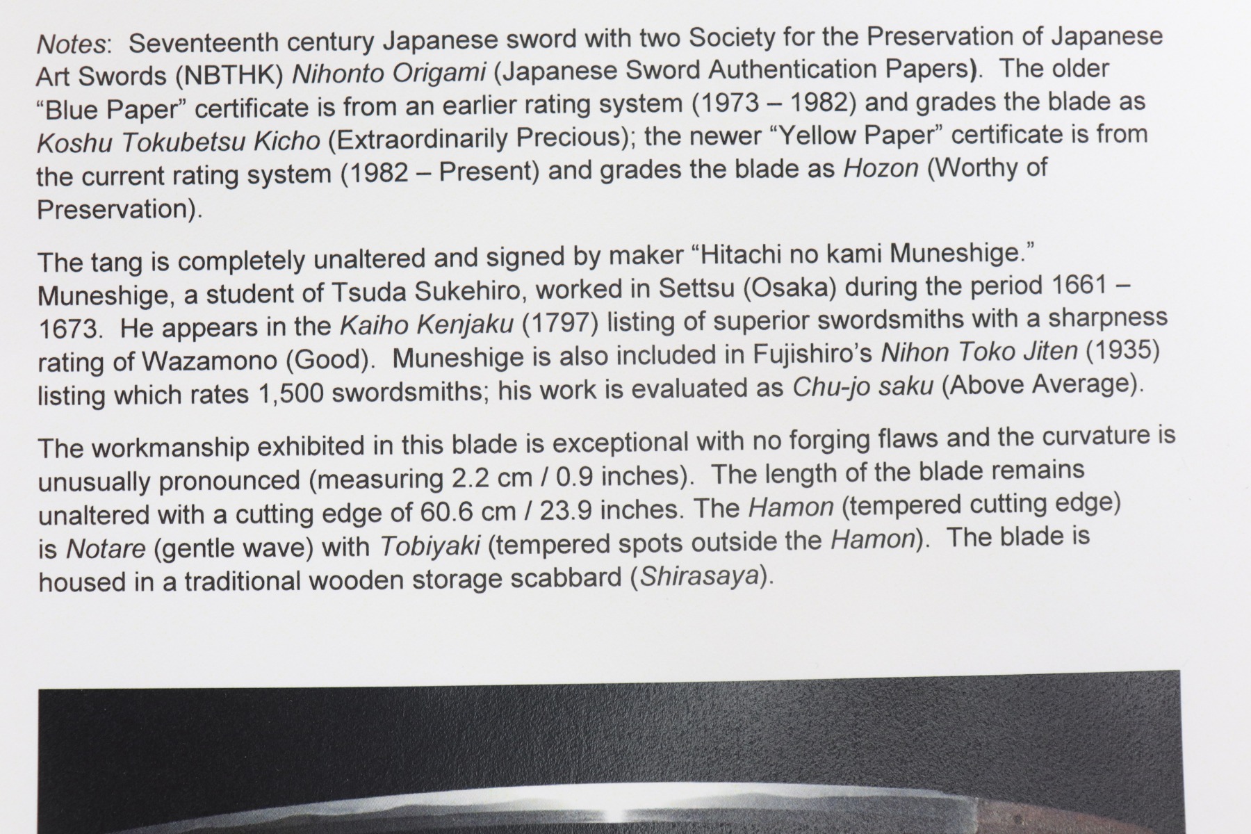 12/16/20 – This is an absolutely stunning example of a Japanese sword made between 1661-1673. The sword comes with two sets of certification paperwork – one is older and the other is done under the new Japanese system. Seventeenth century Japanese sword with two Society for the Preservation of Japanese Art Swords (NBTHK) Nihonto Origami (Japanese Sword Authentication Papers). The older “Blue Paper” certificate is from an earlier rating system (1973 – 1982) and grades the blade as Koshu Tokubetsu Kicho (Extraordinarily Precious); the newer “Yellow Paper” certificate is from the current rating system (1982 – Present) and grades the blade as Hozon (Worthy of Preservation). The tang is completely unaltered and signed by maker “Hitachi no kami Muneshige.”