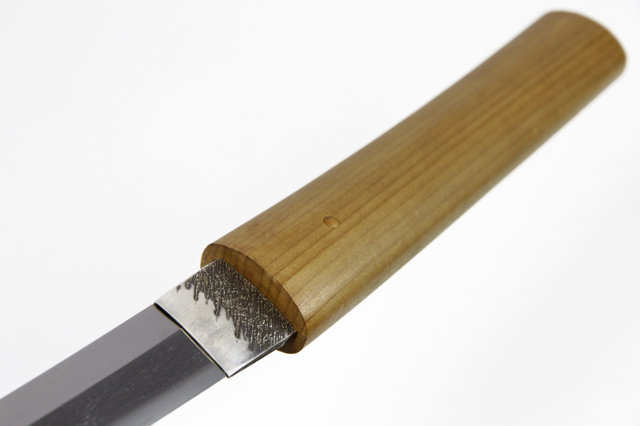 is Notare (gentle wave) with Tobiyaki (tempered spots outside the Hamon). The blade is housed in a traditional wooden storage scabbard (Shirasaya).