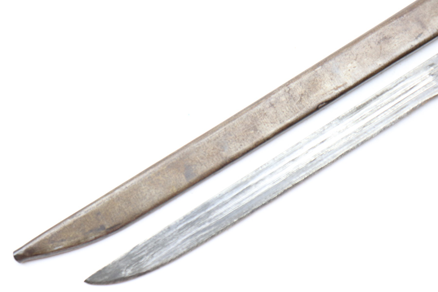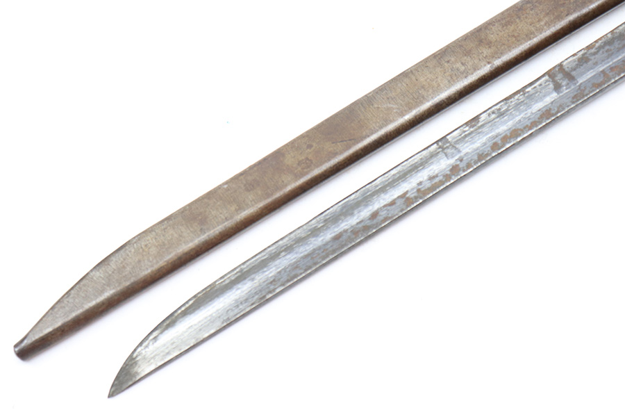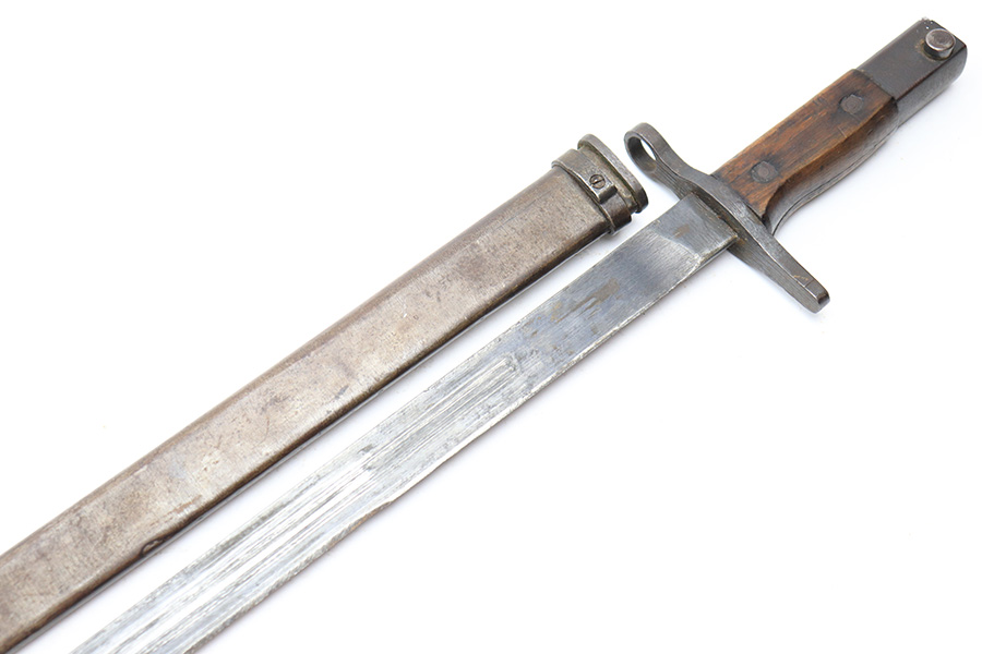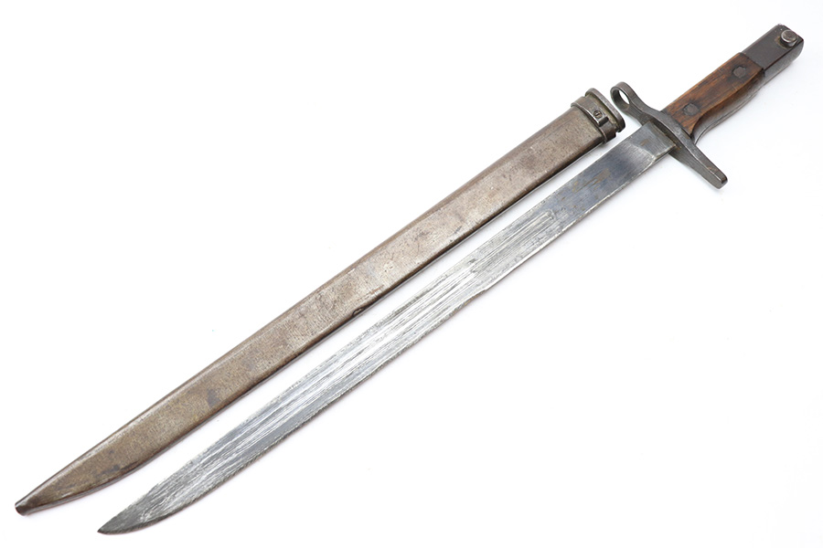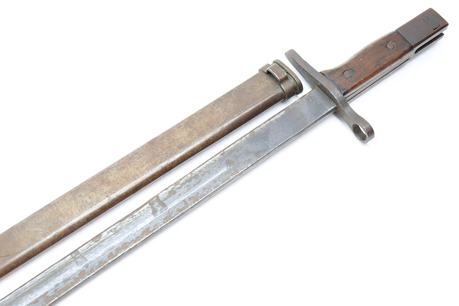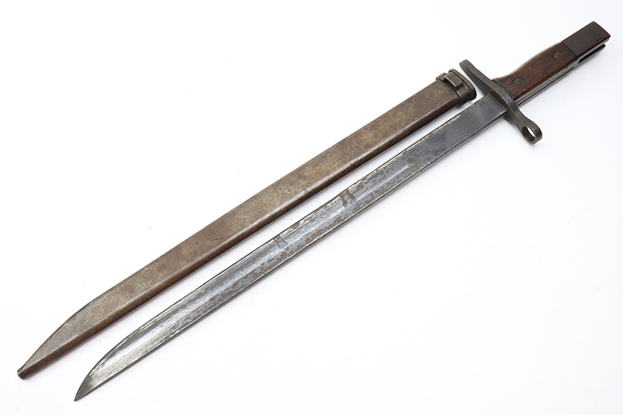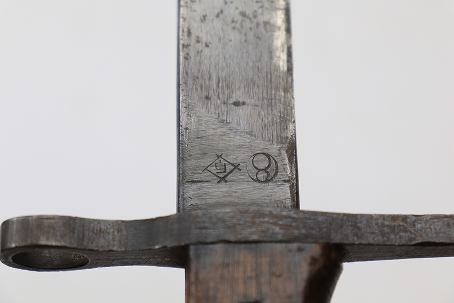 5/2/22 – This is a late / end-of-war example T30 Japanese rifle bayonet. Appropriate for the Type 38 and Type 99 rifles. This example features a straight handguard and a “slab side” or unfullered blade, and steel scabbard. The blade has some light surface rust on each side amongst the original blued finish. Two-thirds of the edge has been sharpened and there are typical signs of patina and aging. The base of the blade is maker stamped as shown. The wood handle is in great shape and the hilt has some light surface patina throughout but no major issues.