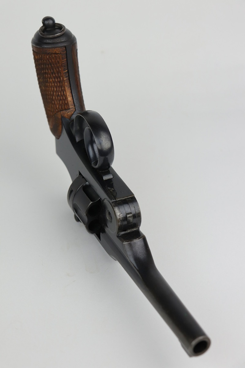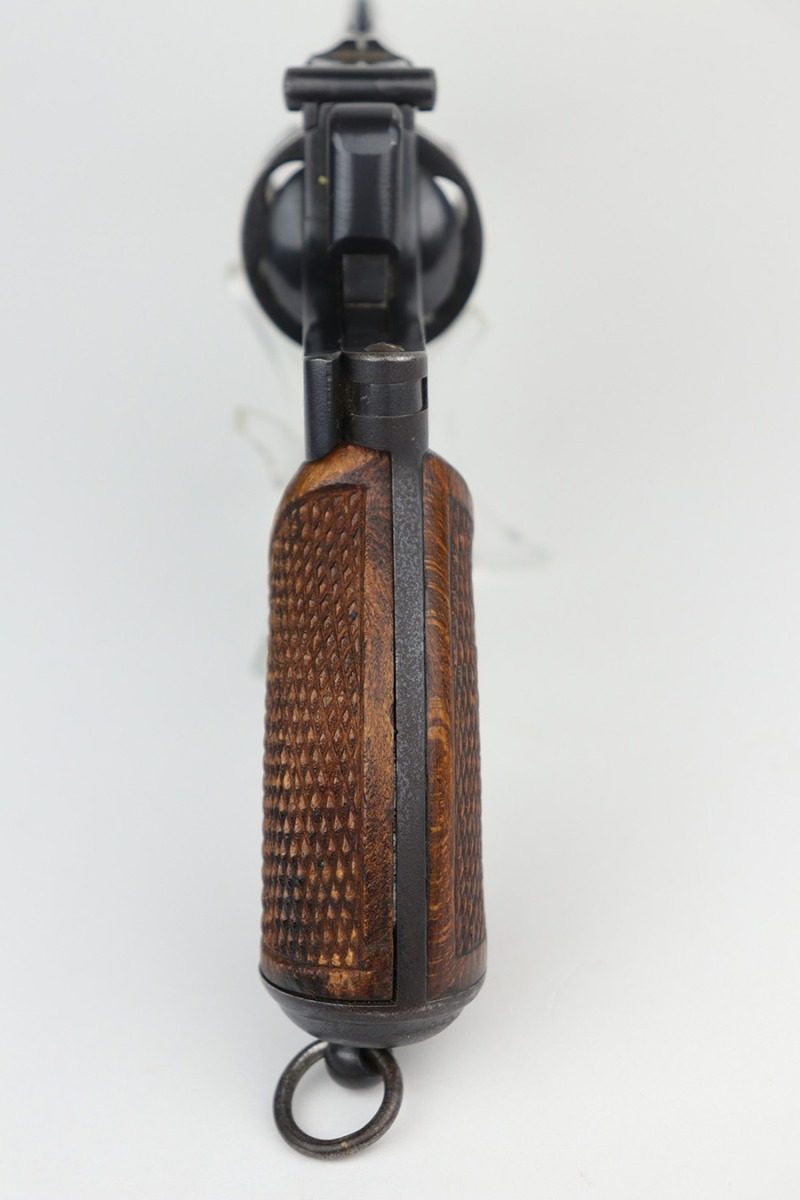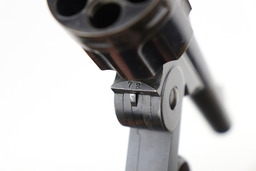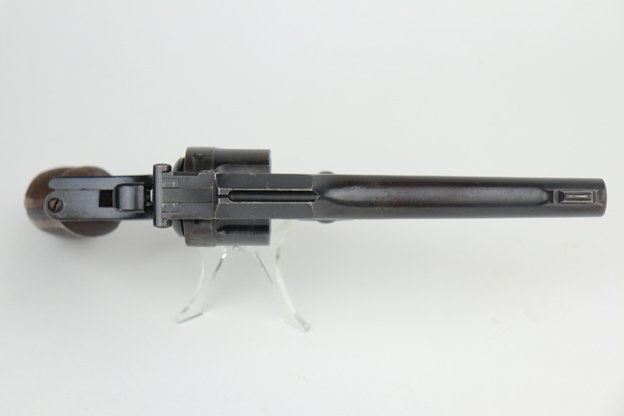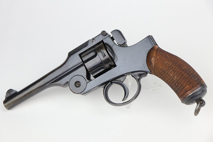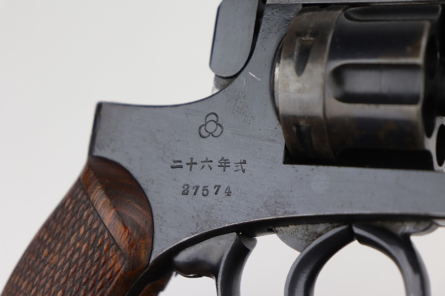 10/14/21 – This is an original example of a Nambu Type 26 revolver. The Type 26 or Model 26 “hammerless” revolver was the first modern revolver adopted by the Imperial Japanese Army. It was developed at the Koishikawa Arsenal and is named for its year of adoption in the Japanese dating system (the 26th year of the reign of the Meiji emperor, i.e., 1893). The revolver saw action in conflicts including the Russo-Japanese War, World War I and World War II. This particular gun has retained roughly 95% of its original finish. Most of the wear is around the cylinder and left side of the barrel, and there is also some oxidation in these areas. Minty bore and excellent grips. Seems to be fully functional, action is smooth.