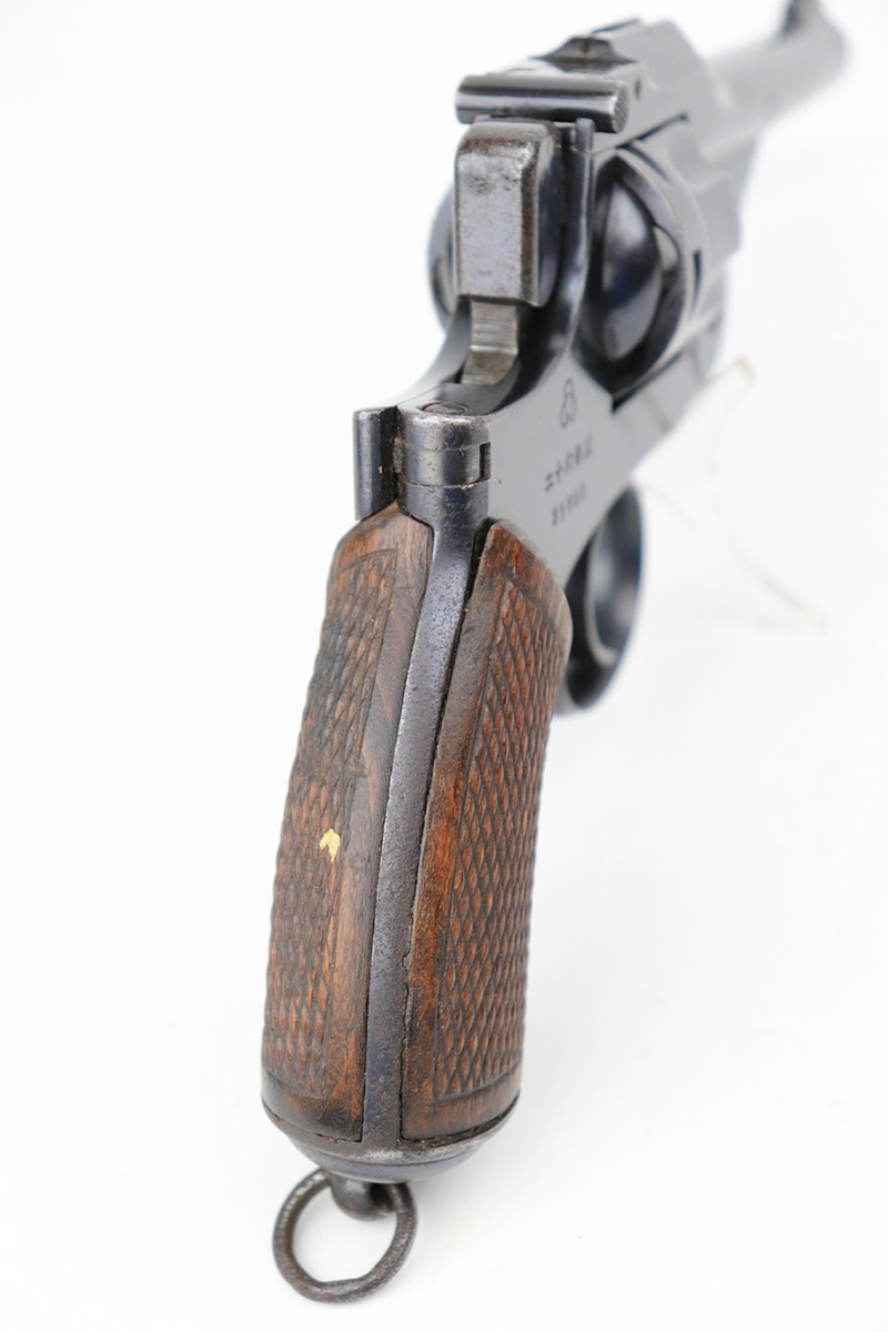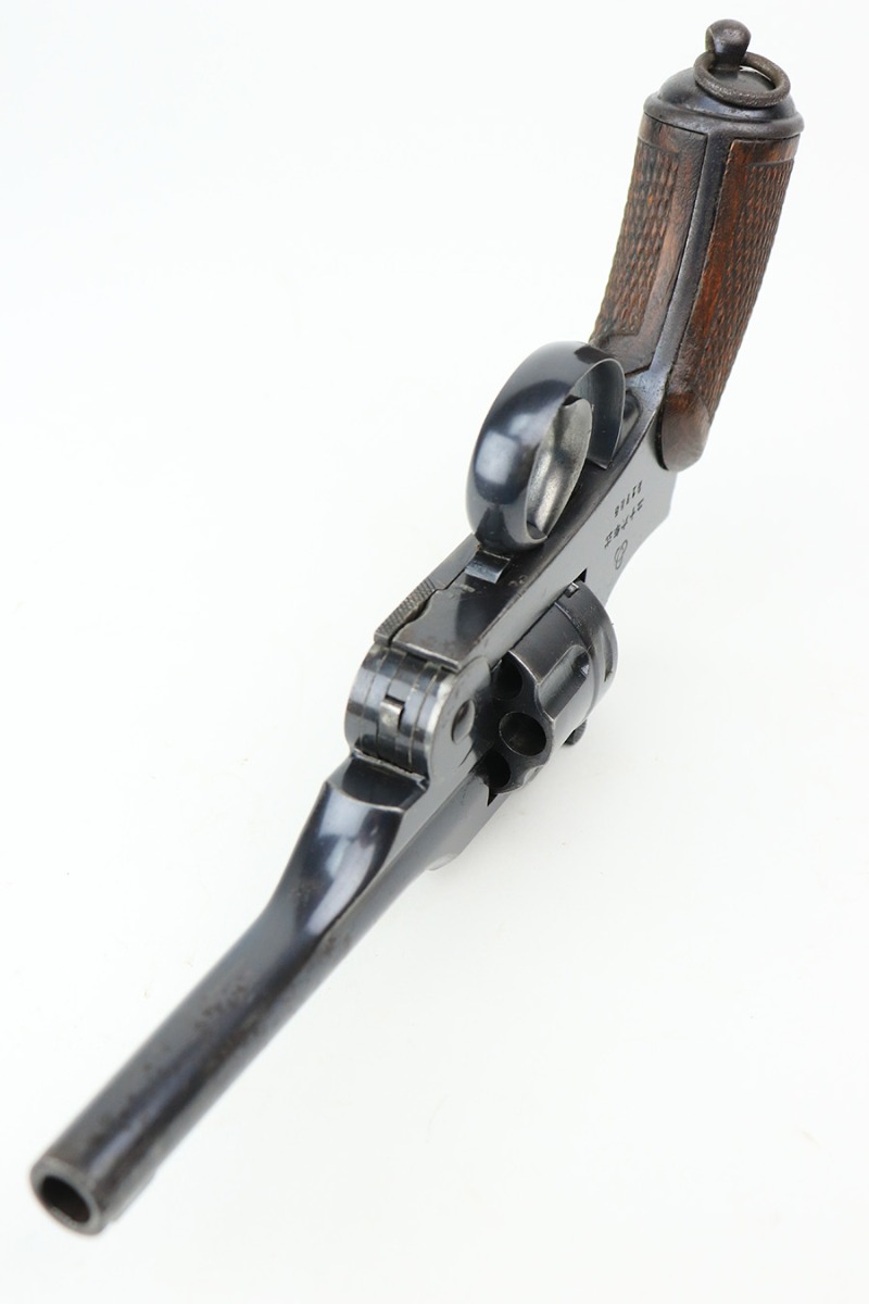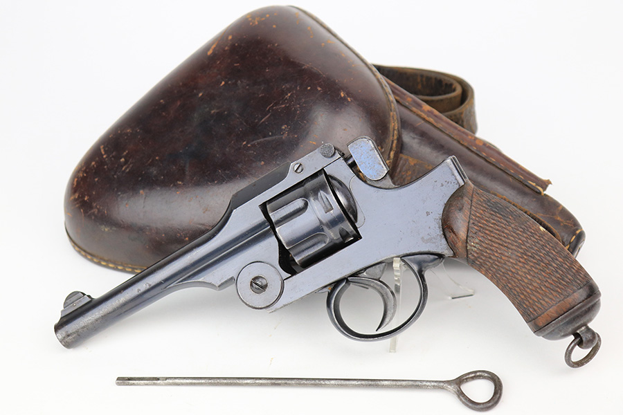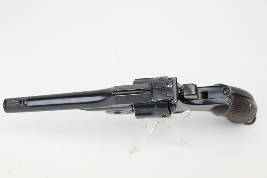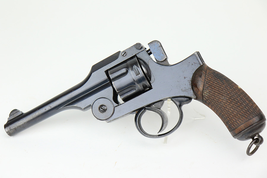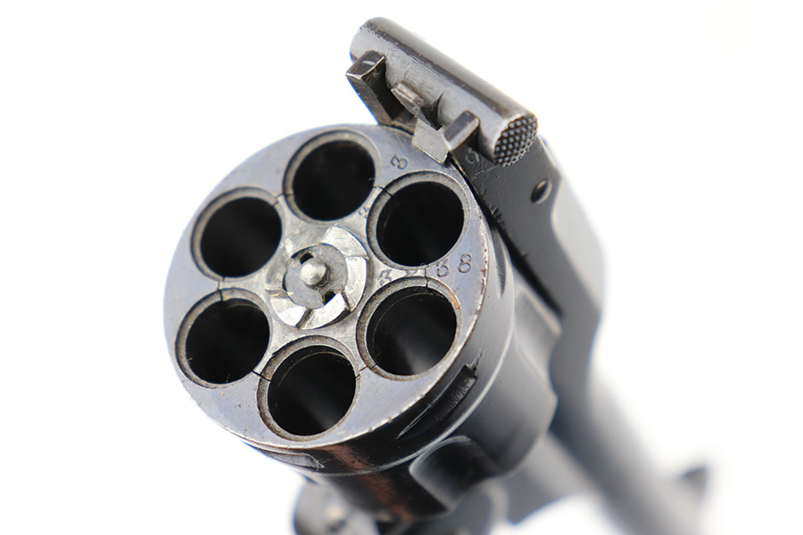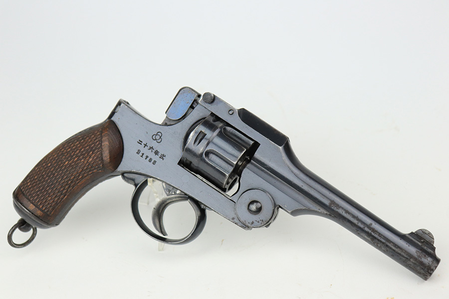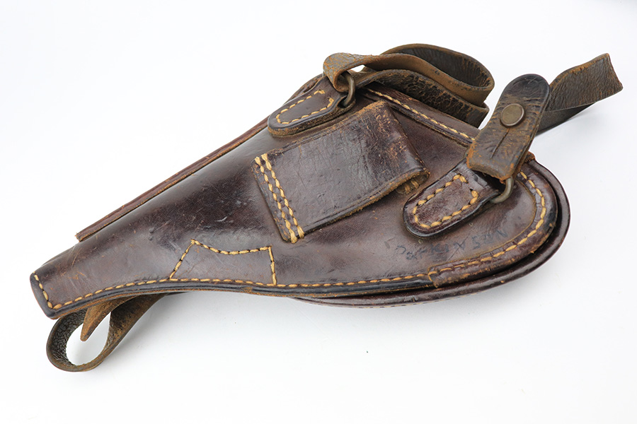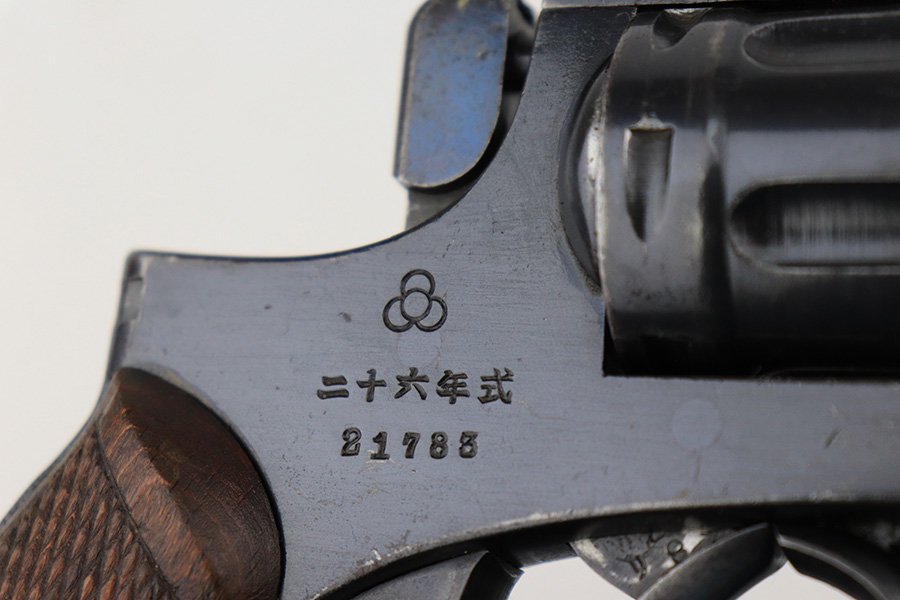 5/4/22 – This is a very example of a Japanese Type 26 revolver. The Type 26 or Model 26 “hammerless” revolver was the first modern revolver adopted by the Imperial Japanese Army. It was developed at the Koishikawa Arsenal and is named for its year of adoption in the Japanese dating system (the 26th year of the reign of the Meiji emperor, i.e., 1893). The revolver saw action in conflicts including the Russo-Japanese War, World War I and World War II. This particular gun comes as a rig with a cleaning rod and a period-correct leather shoulder holster. Written on the side of the holster is the name “Parkinson”. The previous owner purchased this gun directly from the family of the vet who captured this gun in WW2. The family was able to provide a photo of the US Marine, Michael A Parkinson, and a copy of his military records. The gun itself has retained about 95% of its original finish. While there isn’t much actual finish loss, there are areas of spotty oxidation and tiny pitting on the barrel, on the cylinder, on the left side of the frame, and on the grip straps. Comes with nice period-correct wood grips. Minty bore. The action is very smooth.