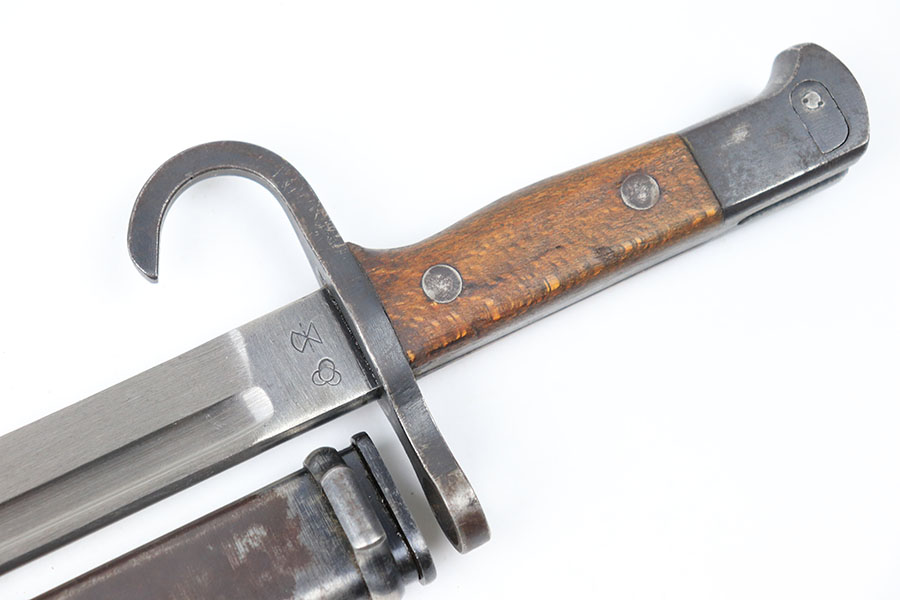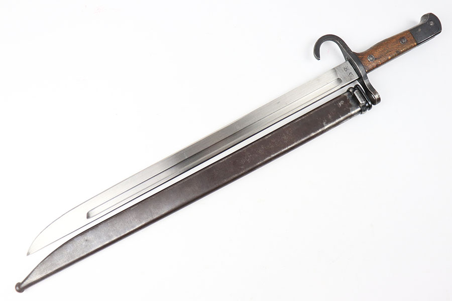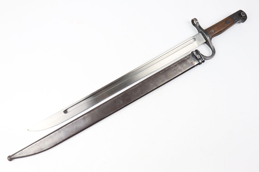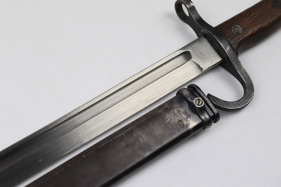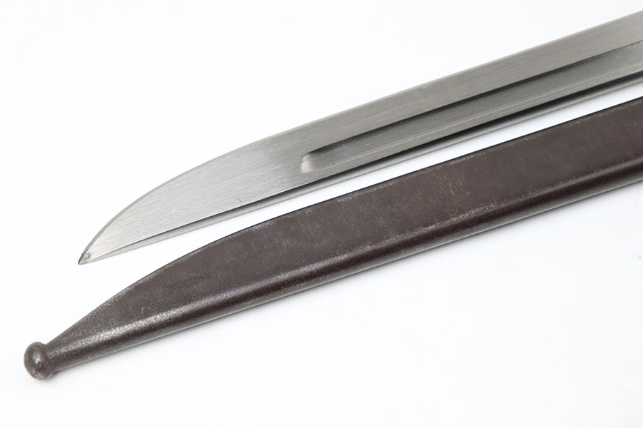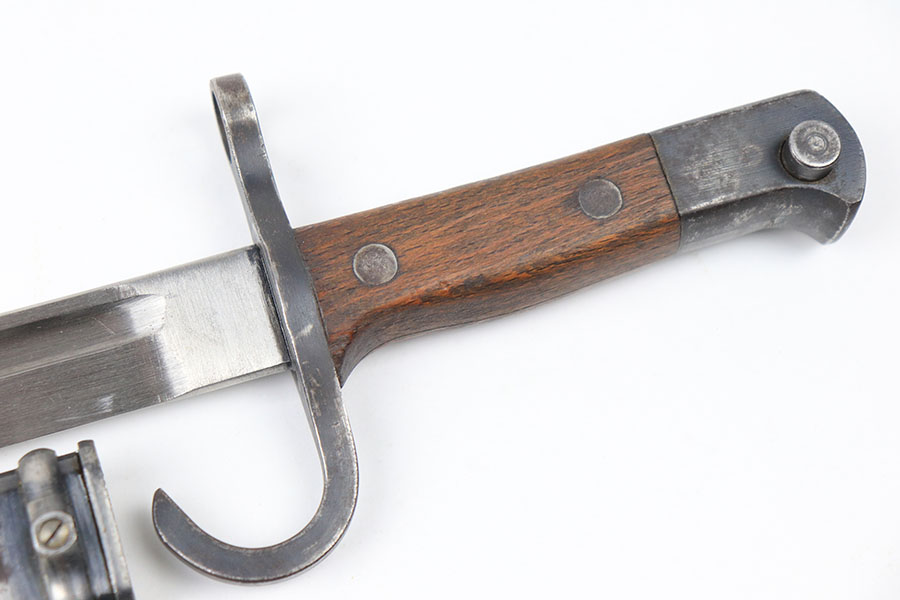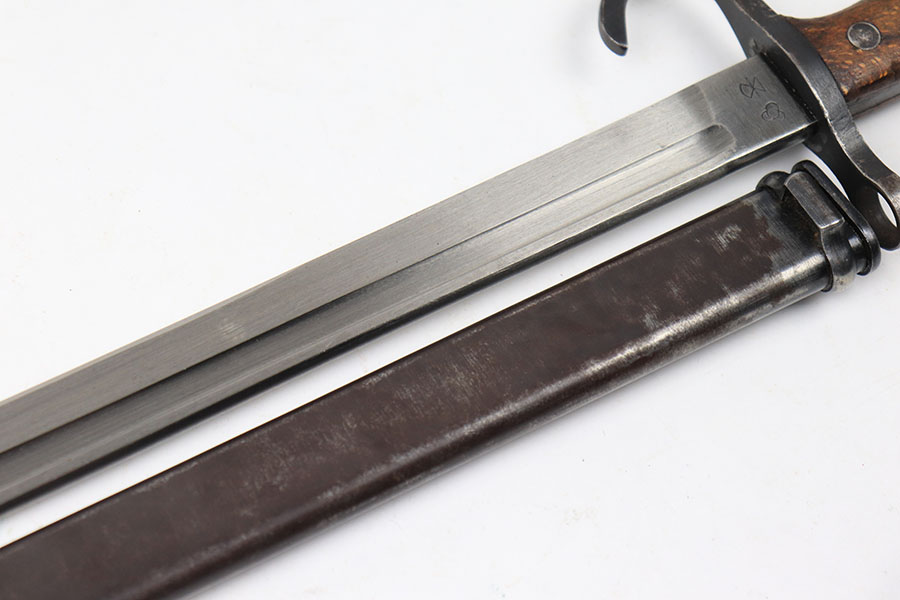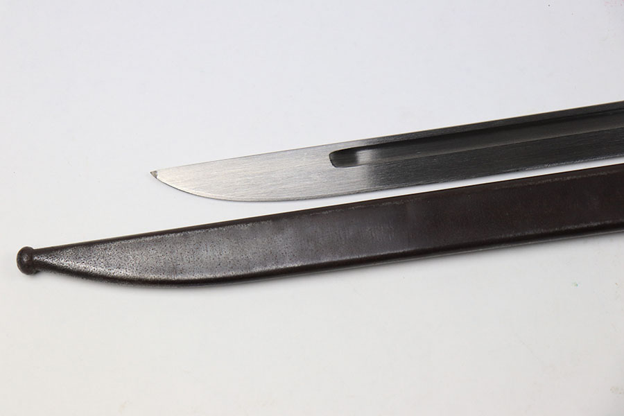 8/3/21 – This is an original Japanese Type 30 rifle bayonet from WW2. The bayonet comes with an original scabbard and is in great overall condition. The blade is very clean with some mild sharpening along about 3/4 of the blade’s edge. There’s arsenal stamps on one side near the base. The wood handles are excellent with some mild patina on the metal parts. the scabbard has brown patina throughout but no major rust or pitting. No dents.