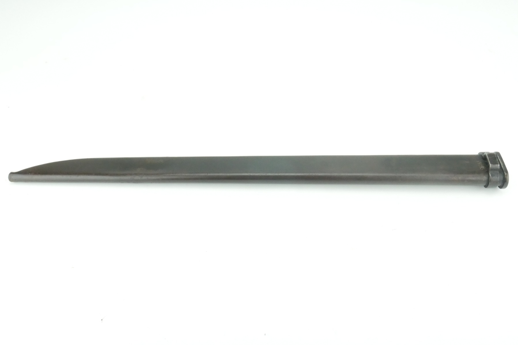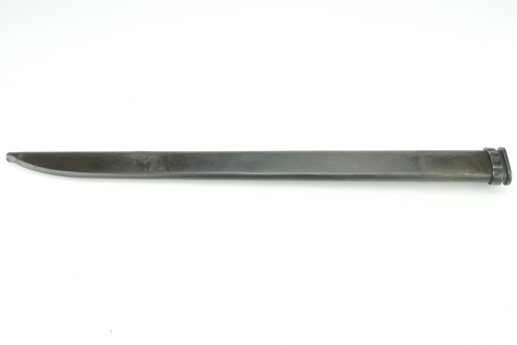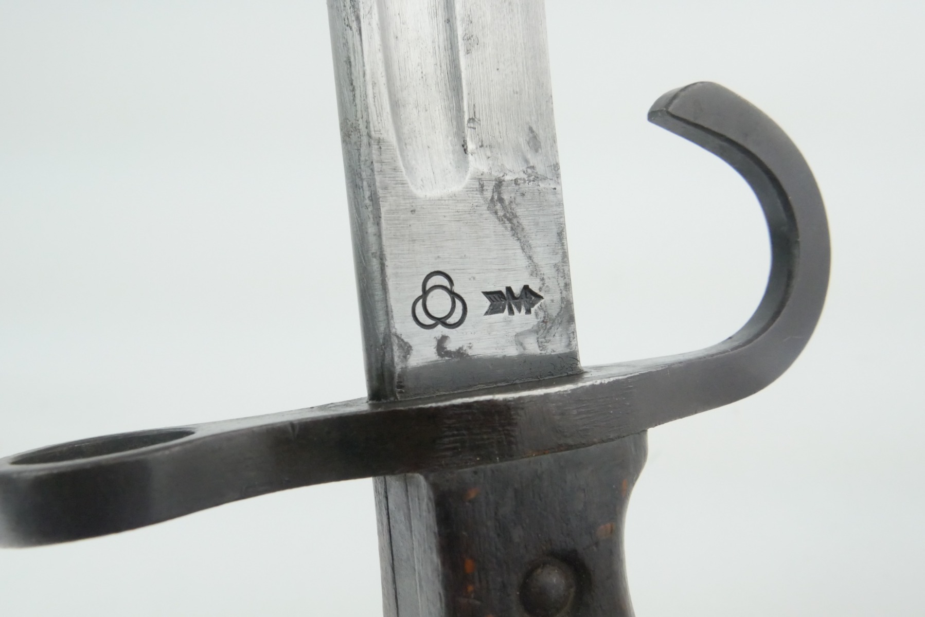 8/27/24 – This is a Japanese Type 30 bayonet made in the Matsushita Kinzoku KK Arsenal commonly known as National Denki Arsenal. The blade of this bayonet has almost none of its original bluing left. The blade does appear to have its original edge, as it is not sharpened, however it does look appear that at some point a wire brush or wheel was used on blade, there are no deep pits on the blade. The blade is maker stamped on one side of the ricasso, as shown. The pommel is serial numbered and proof stamped. The scabbard of this bayonet does have light surface oxidation and a small dent towards the bottom. However this dent does not effect the operation and functionality of the scabbard.