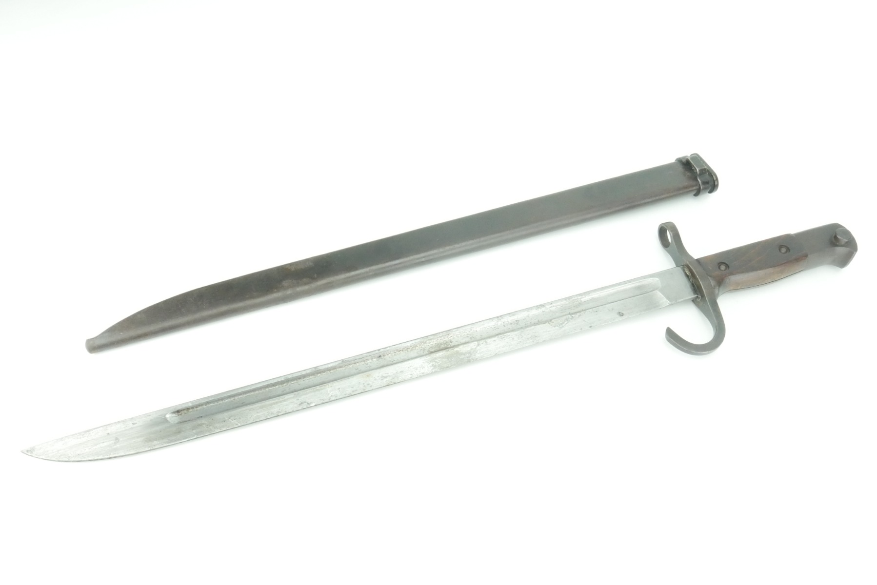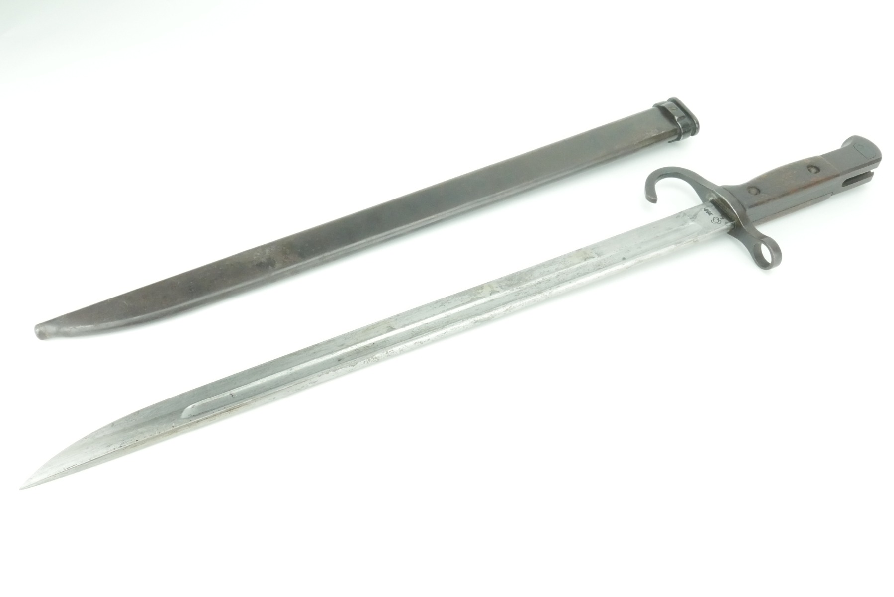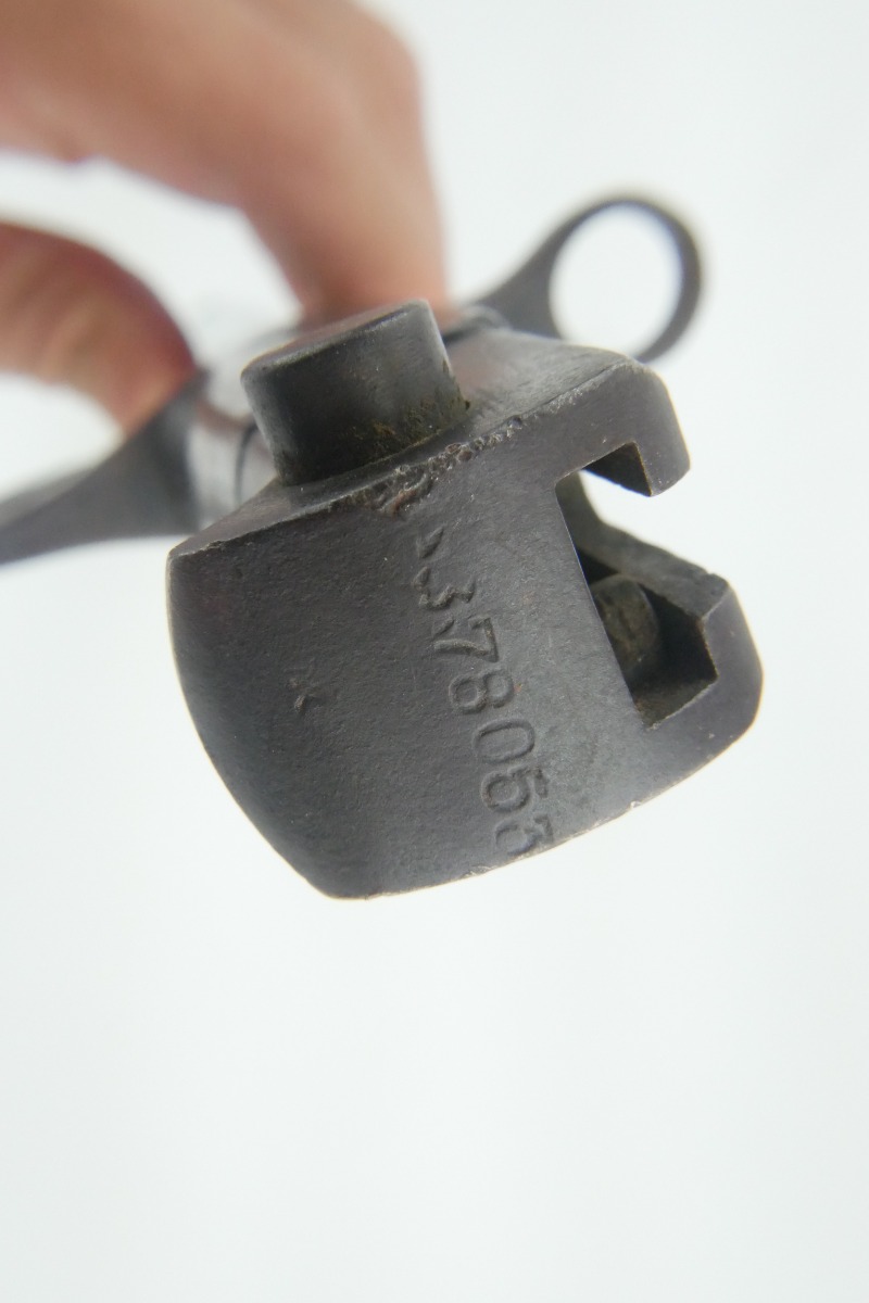 8/27/24 – This is a Japanese Type 30 bayonet made in the Matsushita Kinzoku KK Arsenal commonly known as National Denki Arsenal. The blade of this bayonet has almost none of its original bluing left. The blade does appear to have its original edge, as it is not sharpened, however it does look appear that at some point a wire brush or wheel was used on blade, there are no deep pits on the blade. The blade is maker stamped on one side of the ricasso, as shown. The pommel is serial numbered and proof stamped. The scabbard of this bayonet does have light surface oxidation and a small dent towards the bottom. However this dent does not effect the operation and functionality of the scabbard.