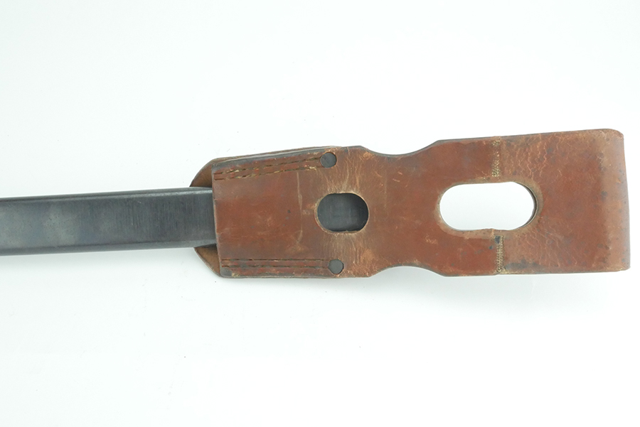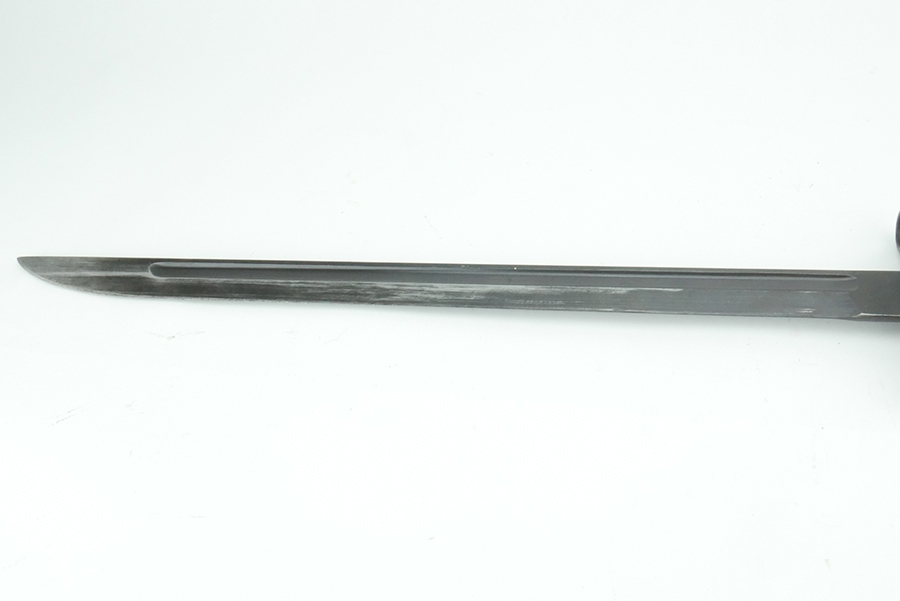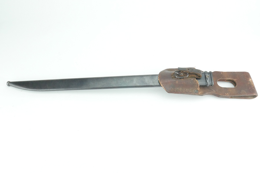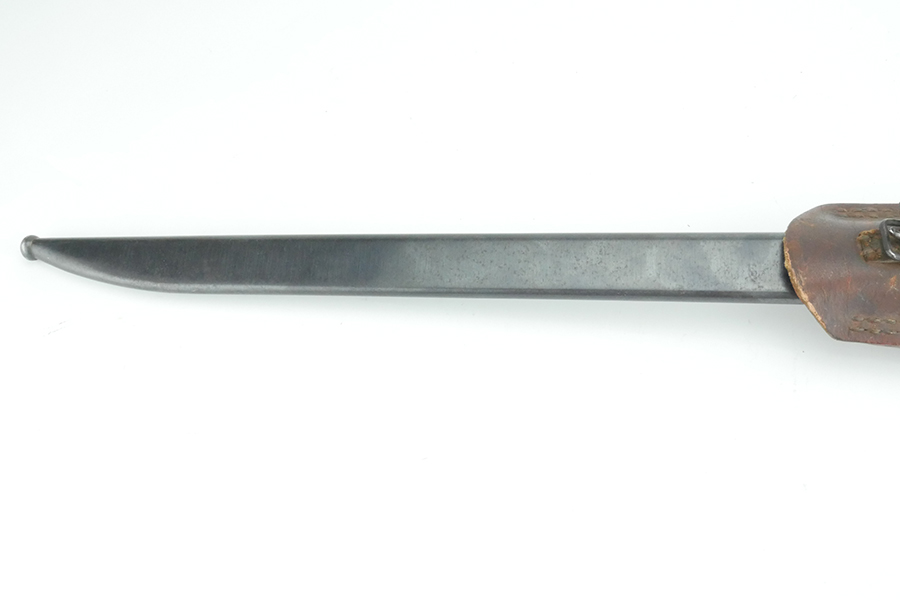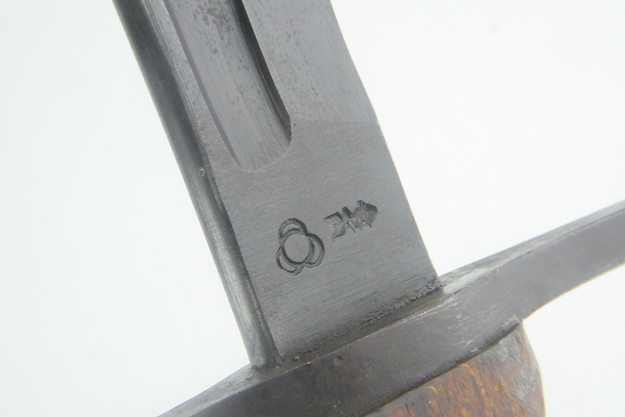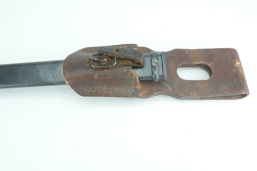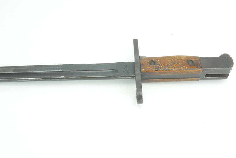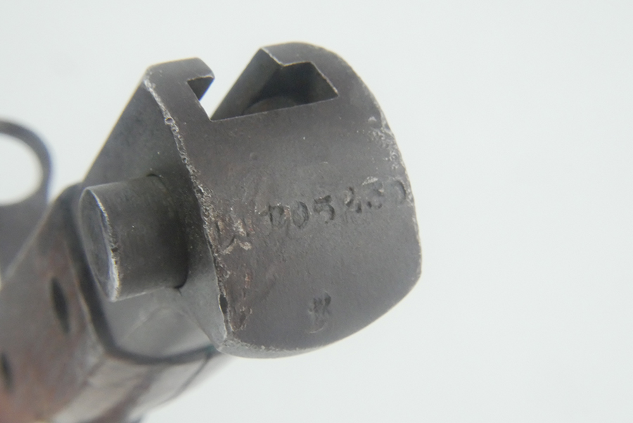 8/27/24 – This is a Japanese Type 30 bayonet made in the Matsushita Kinzoku KK Arsenal commonly known as National Denki Arsenal. The blade of this bayonet has almost all of its original bluing left. The bluing is missing from areas commonly associated with scabbard usage, with the majority found around the tip of the blade. The blade does appear to have its original edge, as it is not sharpened, there is no oxidation or pitting on the blade. The blade is maker stamped on one side of the ricasso, as shown. The pommel is serial numbered and proof stamped. The scabbard of this bayonet is in excellent condition and has all of its original finish. This bayonet also has it’s original scabbard frog made out of rubberized canvas.