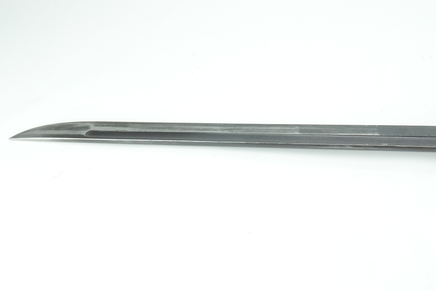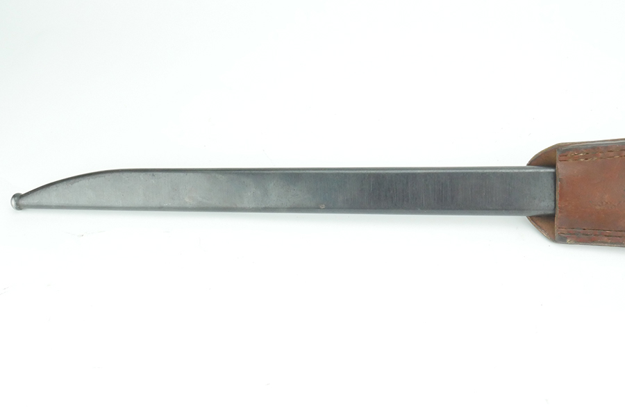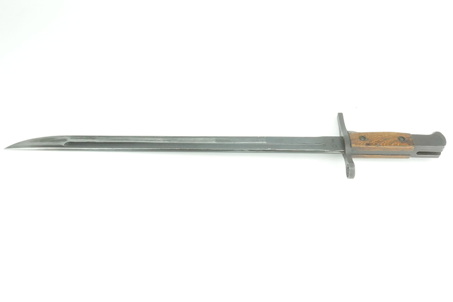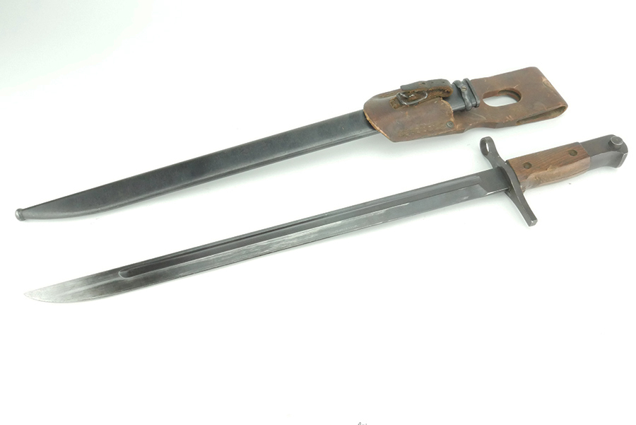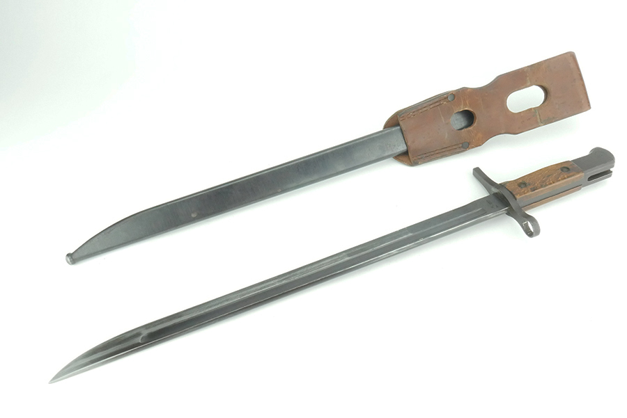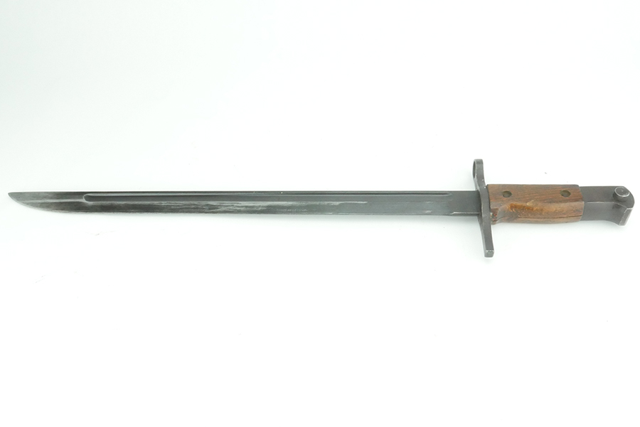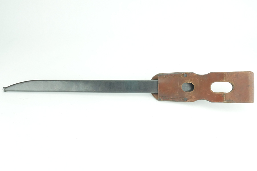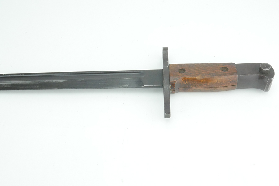 8/27/24 – This is a Japanese Type 30 bayonet made in the Matsushita Kinzoku KK Arsenal commonly known as National Denki Arsenal. The blade of this bayonet has almost all of its original bluing left. The bluing is missing from areas commonly associated with scabbard usage, with the majority found around the tip of the blade. The blade does appear to have its original edge, as it is not sharpened, there is no oxidation or pitting on the blade. The blade is maker stamped on one side of the ricasso, as shown. The pommel is serial numbered and proof stamped. The scabbard of this bayonet is in excellent condition and has all of its original finish. This bayonet also has it’s original scabbard frog made out of rubberized canvas.