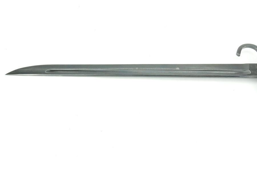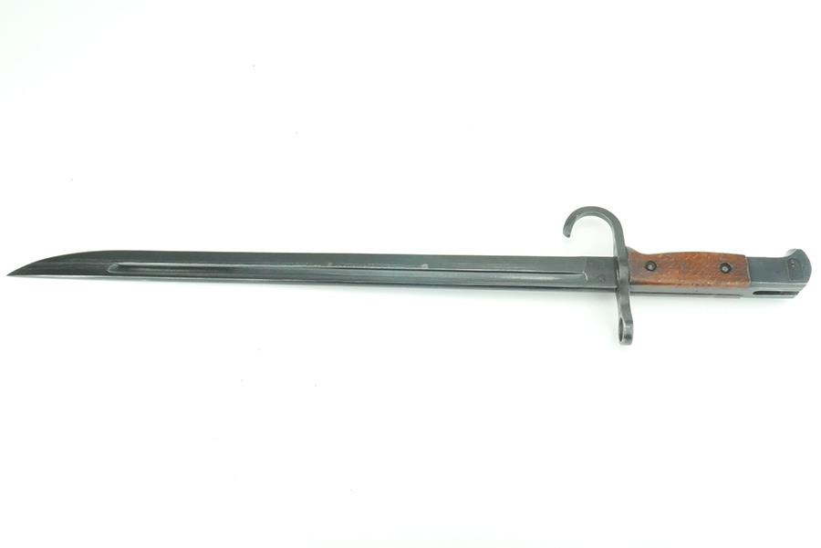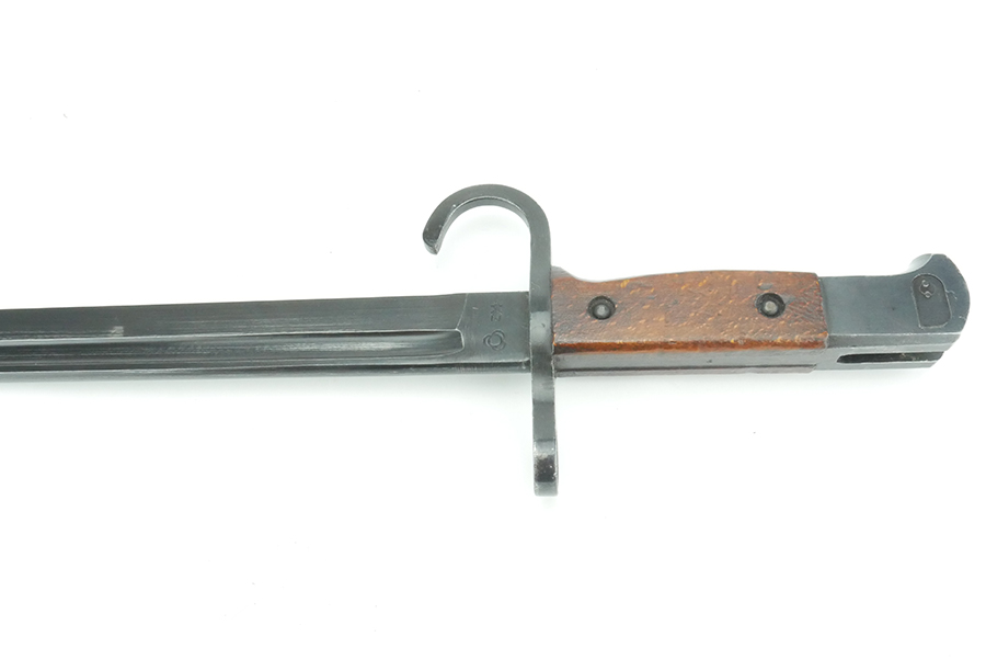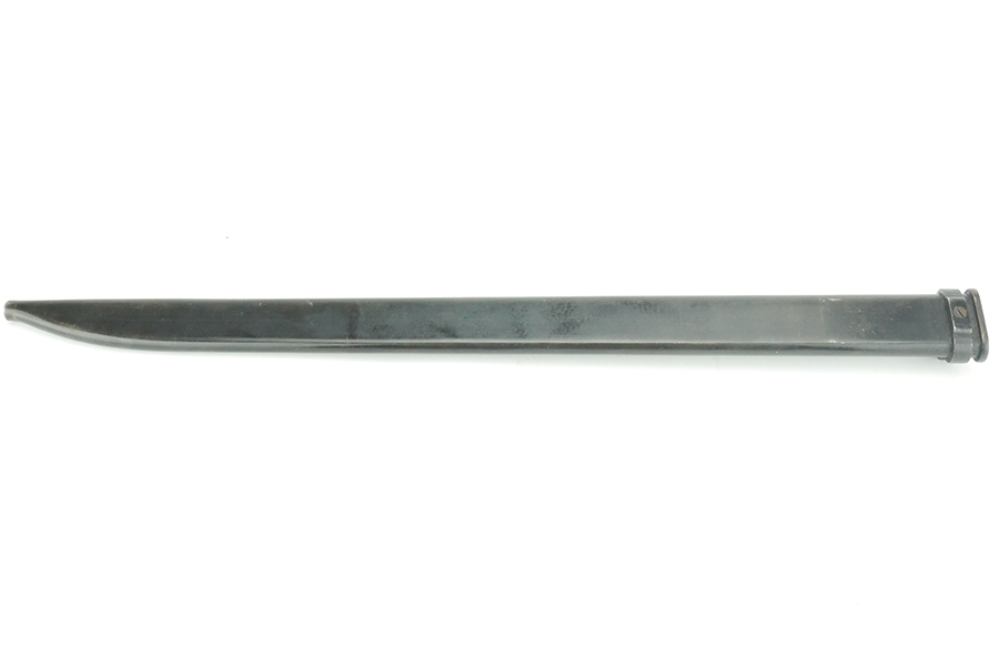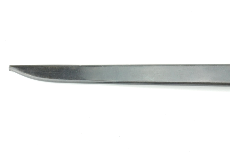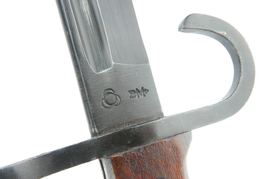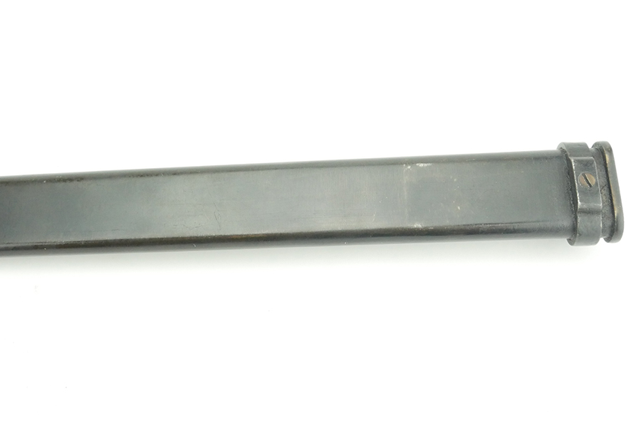 8/27/24 – This is a Japanese Type 30 bayonet made in the Matsushita Kinzoku KK Arsenal commonly known as National Denki Arsenal. The blade of this bayonet has almost all of its original bluing left. The bluing is missing from areas commonly associated with scabbard usage. The blade does appear to have its original edge, as it is not sharpened, there is no oxidation or pitting on the blade. The blade is maker stamped on one side of the ricasso, as shown. The pommel is serial numbered and proof stamped. The scabbard of this bayonet is in excellent condition and has almost all of its original finish.