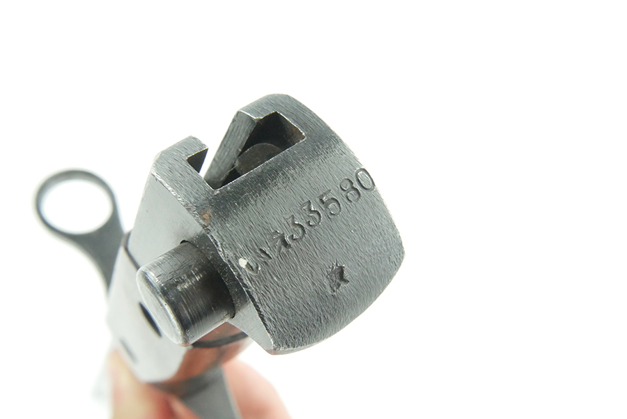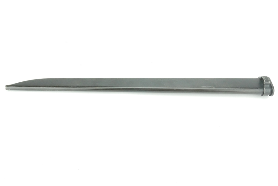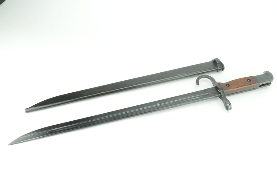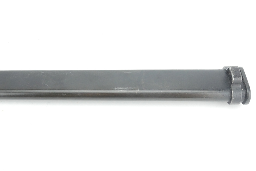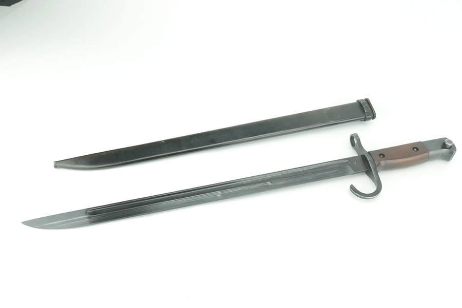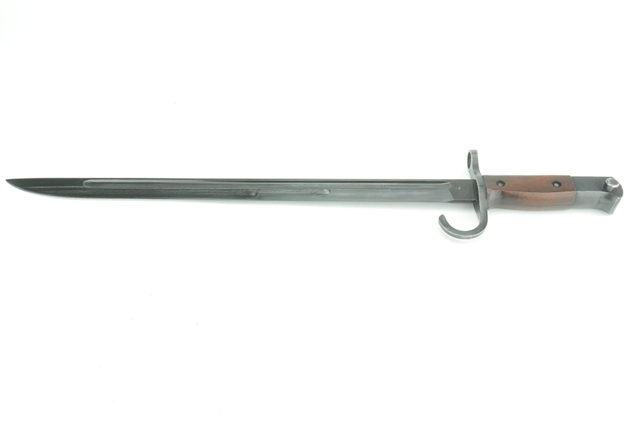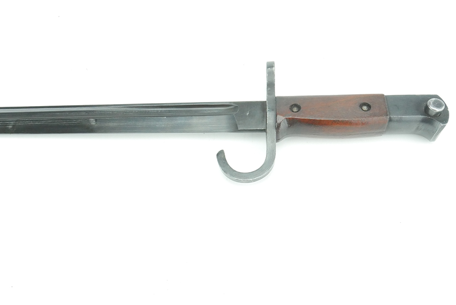 8/27/24 – This is a Japanese Type 30 bayonet made in the Matsushita Kinzoku KK Arsenal commonly known as National Denki Arsenal. The blade of this bayonet has almost all of its original bluing left. The bluing is missing from areas commonly associated with scabbard usage. The blade does appear to have its original edge, as it is not sharpened, there is no oxidation or pitting on the blade. The blade is maker stamped on one side of the ricasso, as shown. The pommel is serial numbered and proof stamped. The scabbard of this bayonet is in excellent condition and has almost all of its original finish.