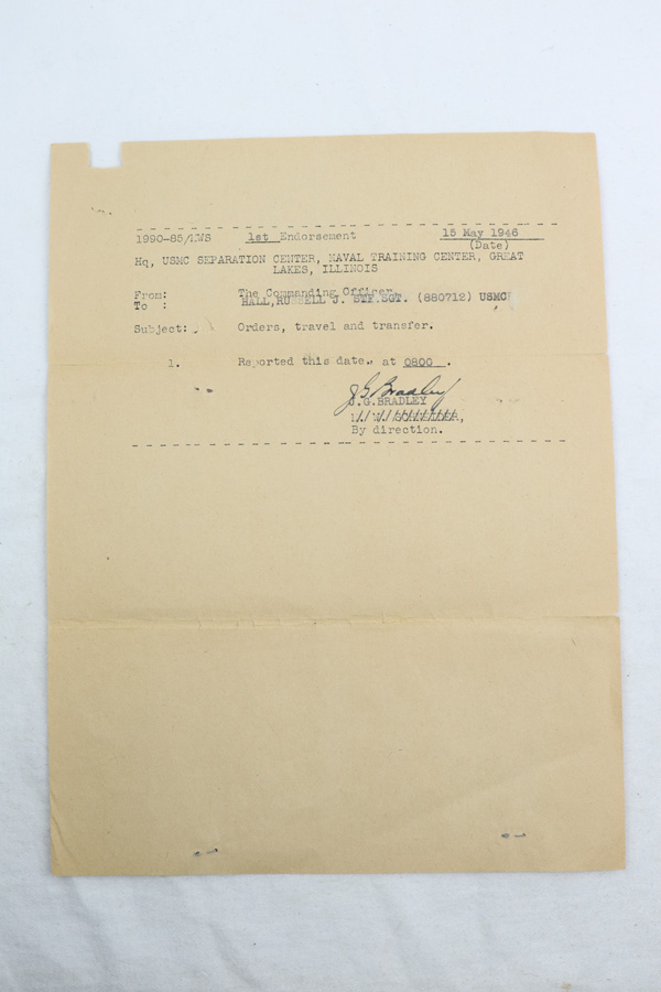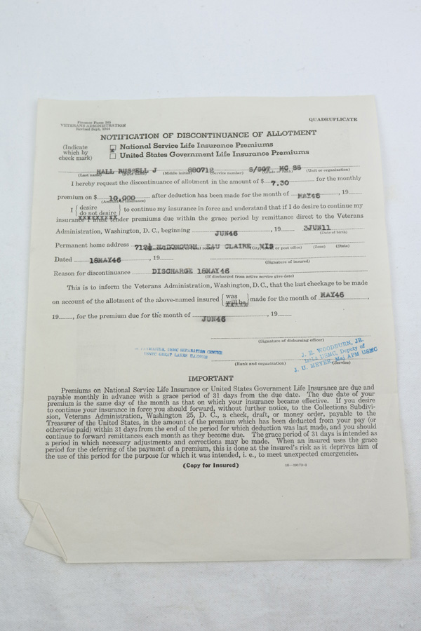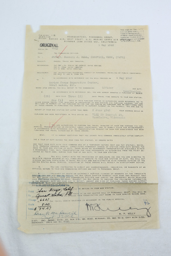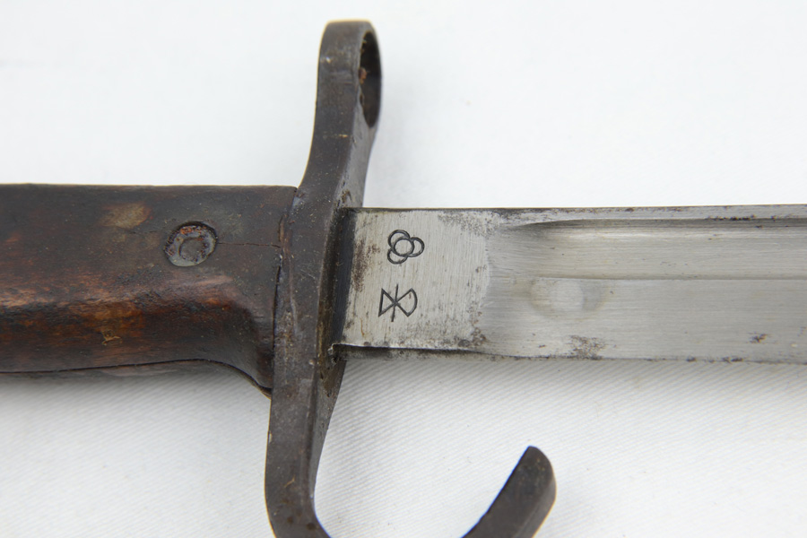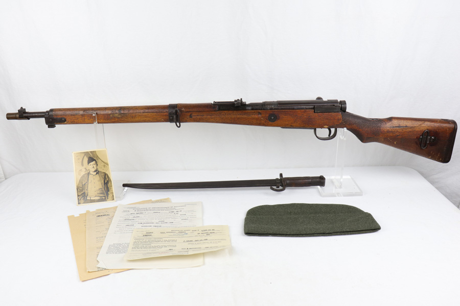 1/15/19 – Mid to Late WW2 production Kokura Arsenal 25th Series Okinawa USMC Wisconsin Veteran Marine Air Staff Sgt. Russell J. Hall VMF 441 Marine Air Group-MAG 31 bring back Arisaka rifle with bayonet and scabbard. This late transitional series rifle never did have the guards installed on the front sight. Rifle and bayonet set has remained untouched and together since the war. Rifle shows all matching serial numbers including receiver, bolt, safety, firing pin and bayonet lug. Dust cover is not marked. Twist on brass muzzle cover marked on end. US Marine Aircraft Mechanic coated the rifle, bayonet and scabbard, in a heavy preservative grease before bringing home his war trophy. Over the years the grease has dried onto the exposed metal surfaces creating an untouched Pacific War time capsule weapon, bayonet and scabbard too. Dust cover does not appear to have the preservative coating. We believe the rifle to be unused since the war as the action opens and closes very sluggishly due to the dried on preservative grease and bore looks coated inside too. Action works properly but very slow, safety and trigger work correctly but very slow. This was the standard 7.7 mm Japanese rifle of the Pacific War. Although it never fully replaced the 6.5 mm Type 38 rifle In the Japanese Army it was the most commonly encountered rifle outside of the the China Theater. Surrendered after the war the receiver mum on this rifle is ground and topcoated with dried on preservative grease. The Type 99 rifle was a very innovative design for a bolt action rifle, and while it may have been a dated and obsolete design by the standard of the semi auto rifles such as the Garand, it was very well suited for tropical service in harsh jungle conditions and it was a prized Army and USMC war trophy. Not import marked. Soldier’s Picture and Documentation is included which may aid further research on this Marine whom saw wartime service on Okinawa and also duty later in Occupied Japan. Unknown where he picked up the rifle and bayonet.