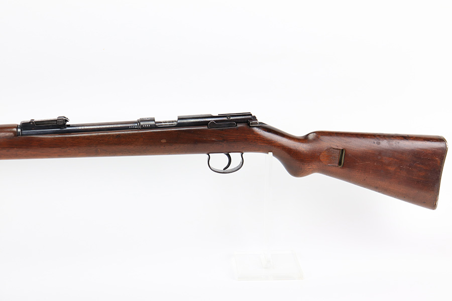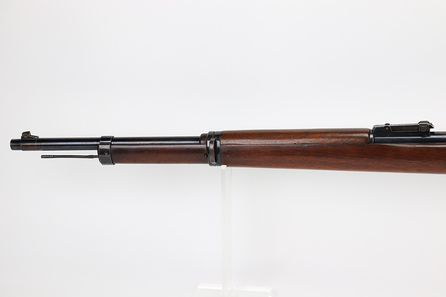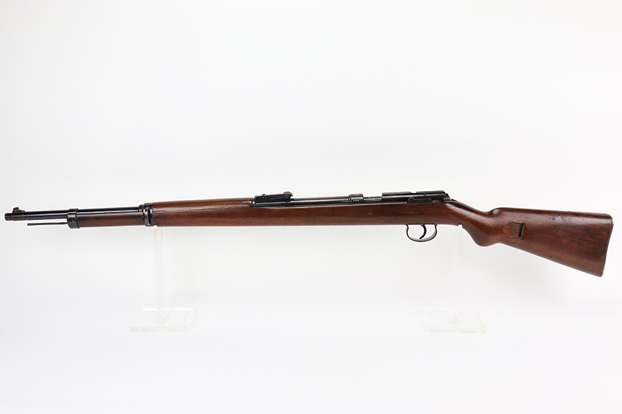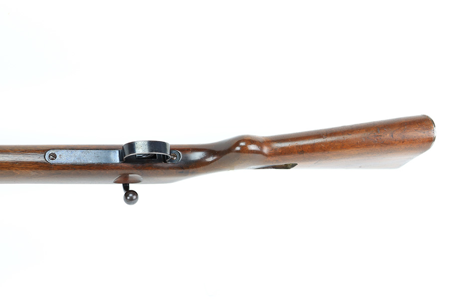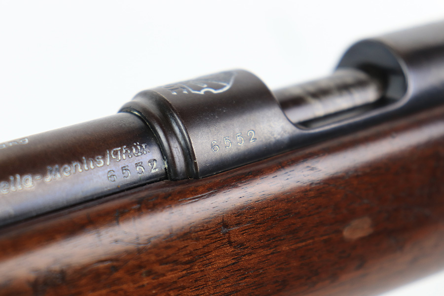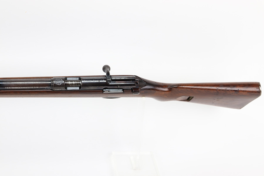 3/29/22 – This is a very nice example of a Pre-WW2 German JGA Buscher-Sportmodell training rifle chambered in 4mm. It is matching and has retained most of its original bluing. There is very little actual finish loss, but there is light spotty brown patina on most of the metal parts. There is a more noticeable area of brown patina on the barrel just in front of the receiver. Tiny dots of oxidation on the butt plate. The wood stock is very nice with only minor scratches and bruises here and there, most noticeable on the underside of the butt stock. Comes with an original cleaning rod. Very nice bore.