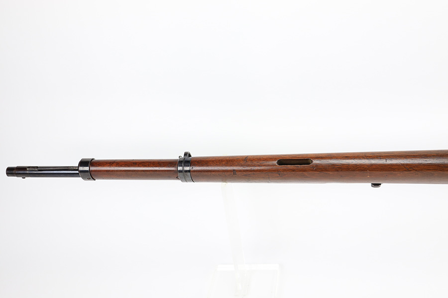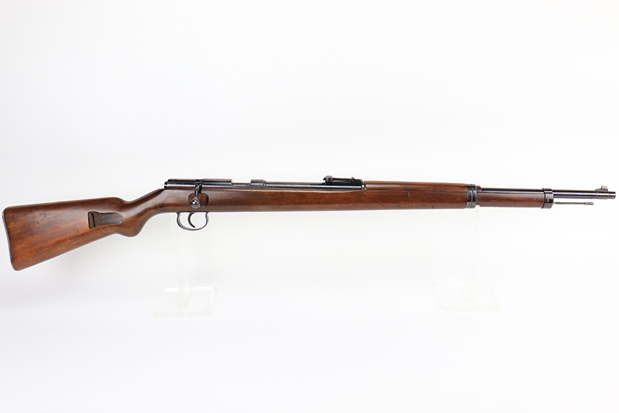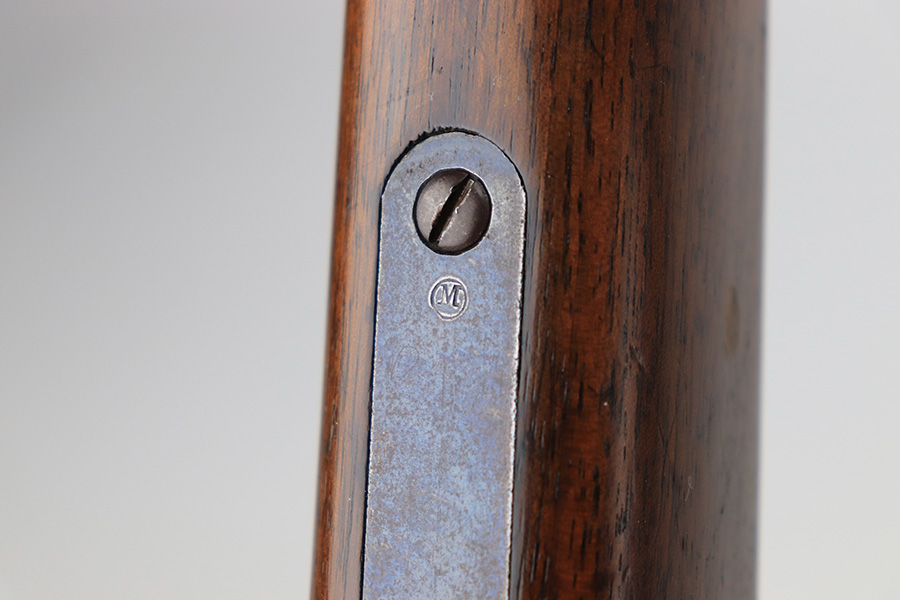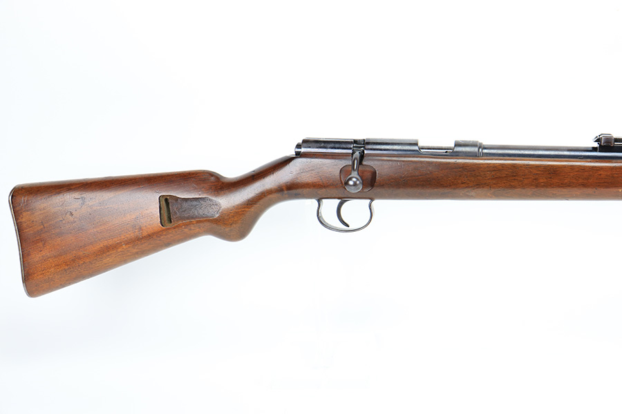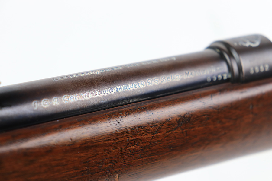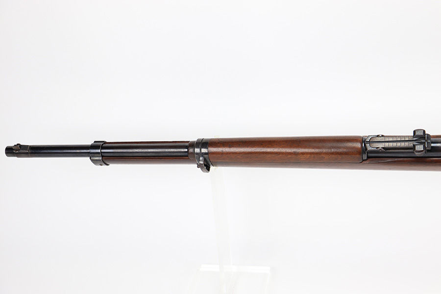 3/29/22 – This is a very nice example of a Pre-WW2 German JGA Buscher-Sportmodell training rifle chambered in 4mm. It is matching and has retained most of its original bluing. There is very little actual finish loss, but there is light spotty brown patina on most of the metal parts. There is a more noticeable area of brown patina on the barrel just in front of the receiver. Tiny dots of oxidation on the butt plate. The wood stock is very nice with only minor scratches and bruises here and there, most noticeable on the underside of the butt stock. Comes with an original cleaning rod. Very nice bore.
