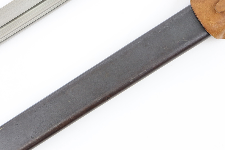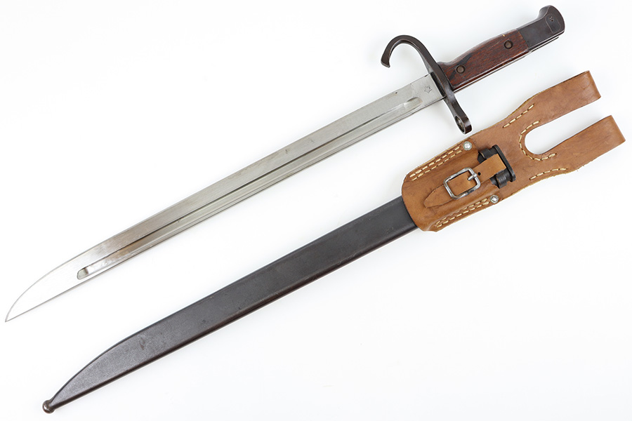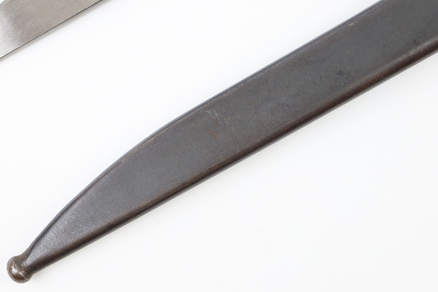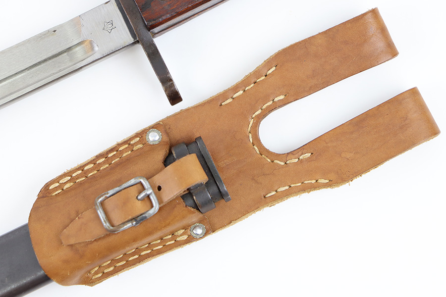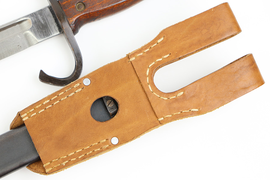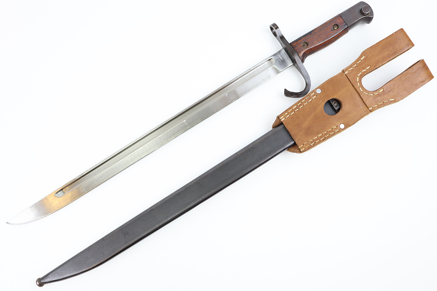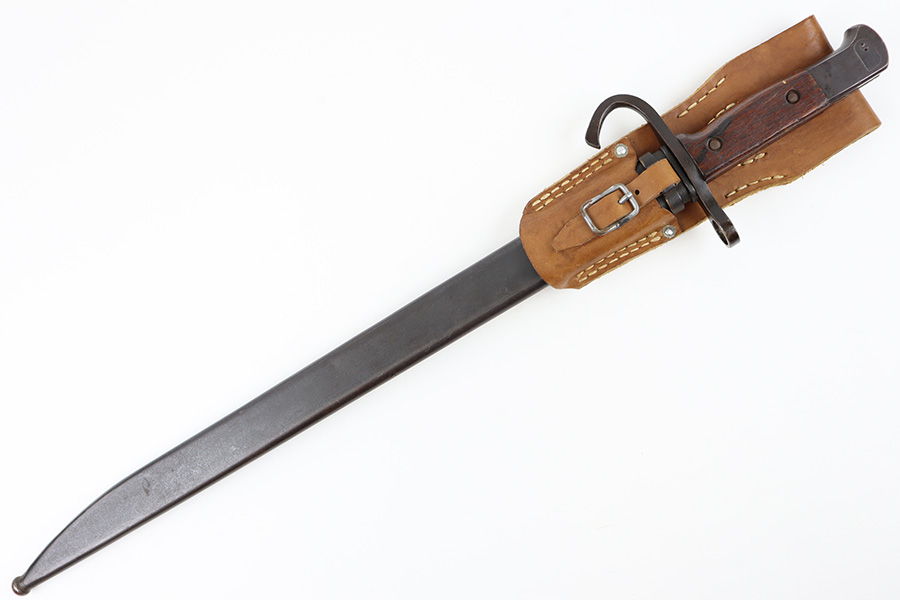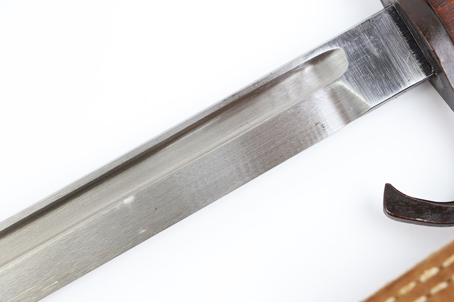 10/5/23 – This is an original WW2 production Japanese T30 bayonet. The bayonet is cited in Labar’s book as LB-155A, Variation E. The bayonet features a bright, fullered blade, hooked cross guard, contoured wood grips with 2 rivets, and birds head pommel. Also comes with a very nice ball-tipped scabbard and minty leather frog. The blade has minimal surface wear. A majority of the original bluing is still present throughout the scabbard, quillion, and pommel. No major issues or notable flaws. The leather frog could be a high-quality reproduction, and have reduced the price accordingly.