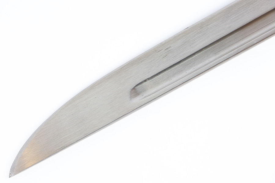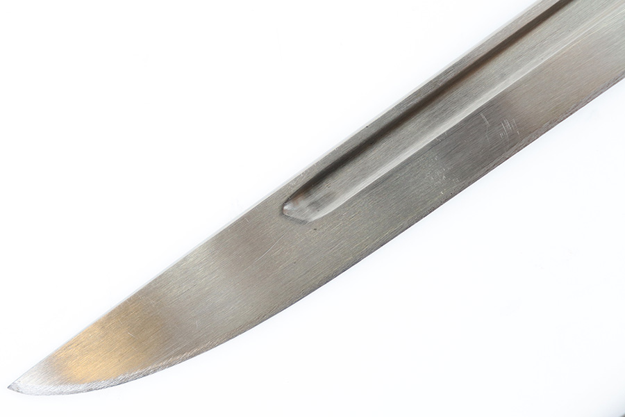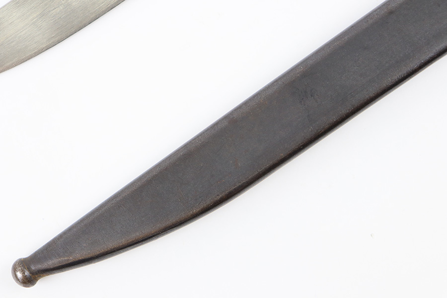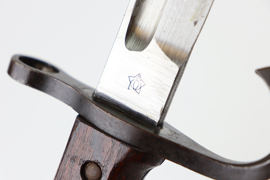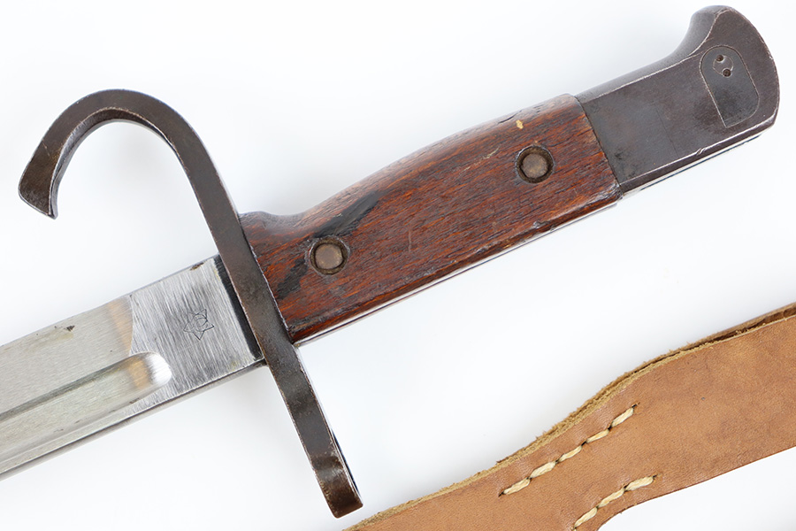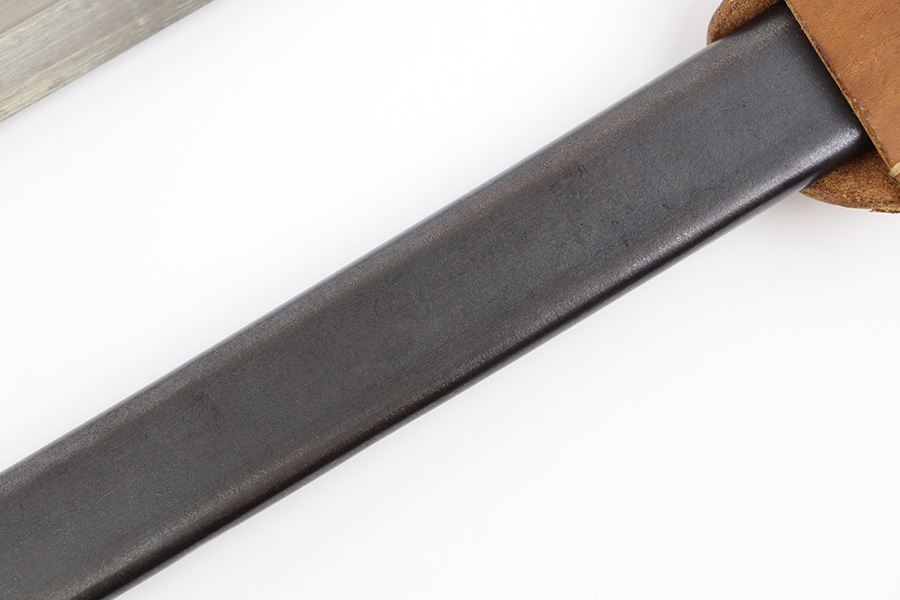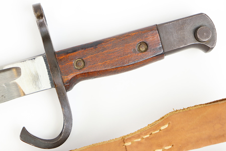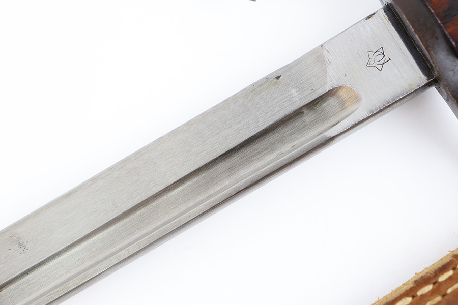 10/5/23 – This is an original WW2 production Japanese T30 bayonet. The bayonet is cited in Labar’s book as LB-155A, Variation E. The bayonet features a bright, fullered blade, hooked cross guard, contoured wood grips with 2 rivets, and birds head pommel. Also comes with a very nice ball-tipped scabbard and minty leather frog. The blade has minimal surface wear. A majority of the original bluing is still present throughout the scabbard, quillion, and pommel. No major issues or notable flaws. The leather frog could be a high-quality reproduction, and have reduced the price accordingly.