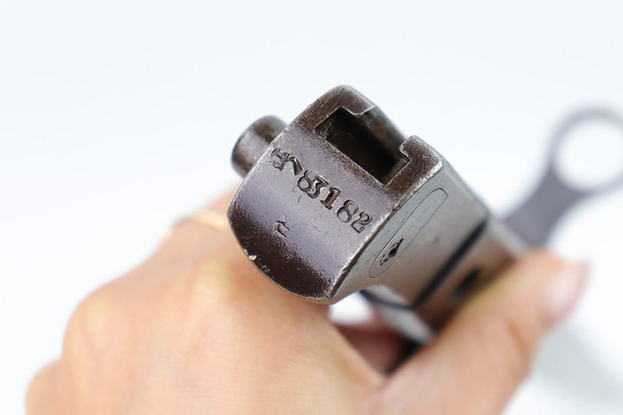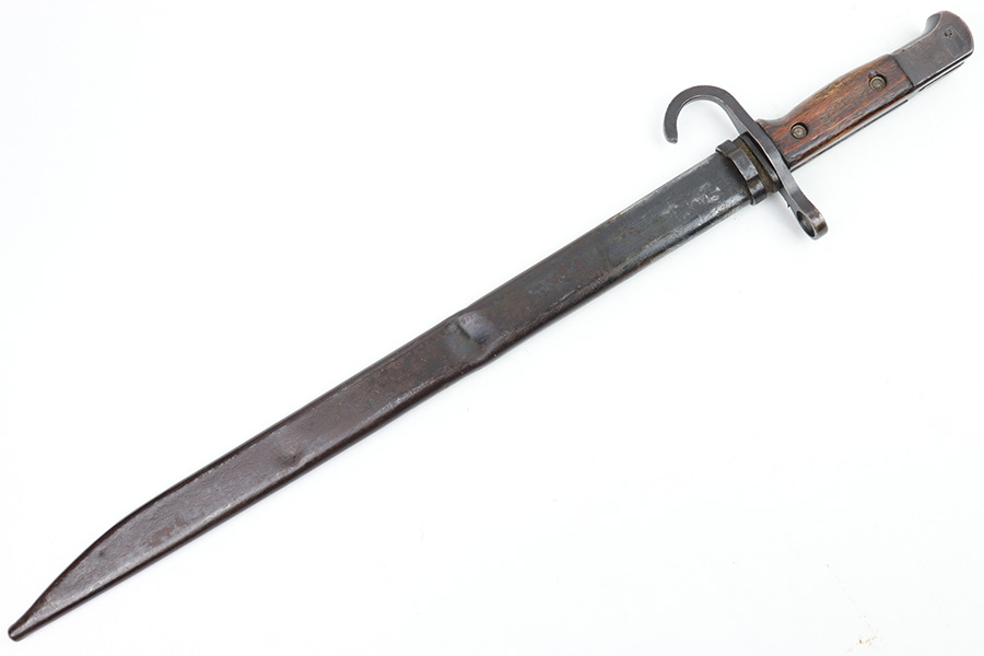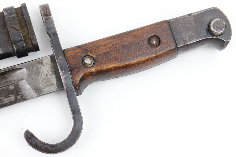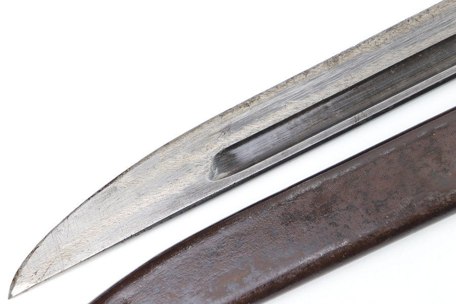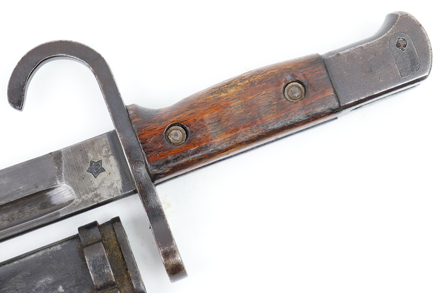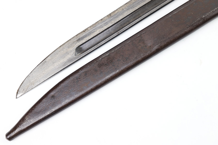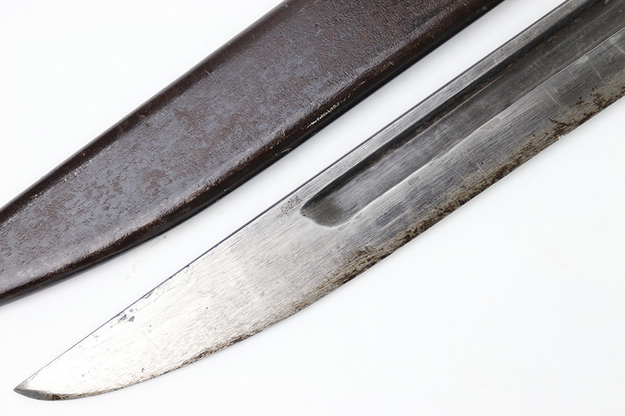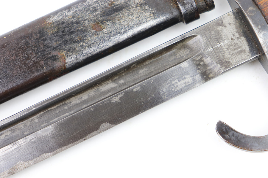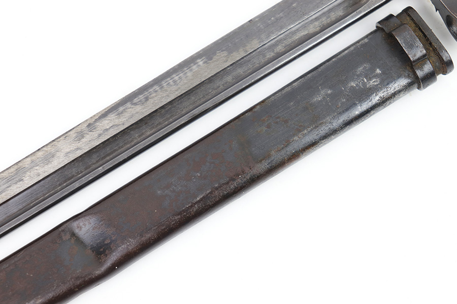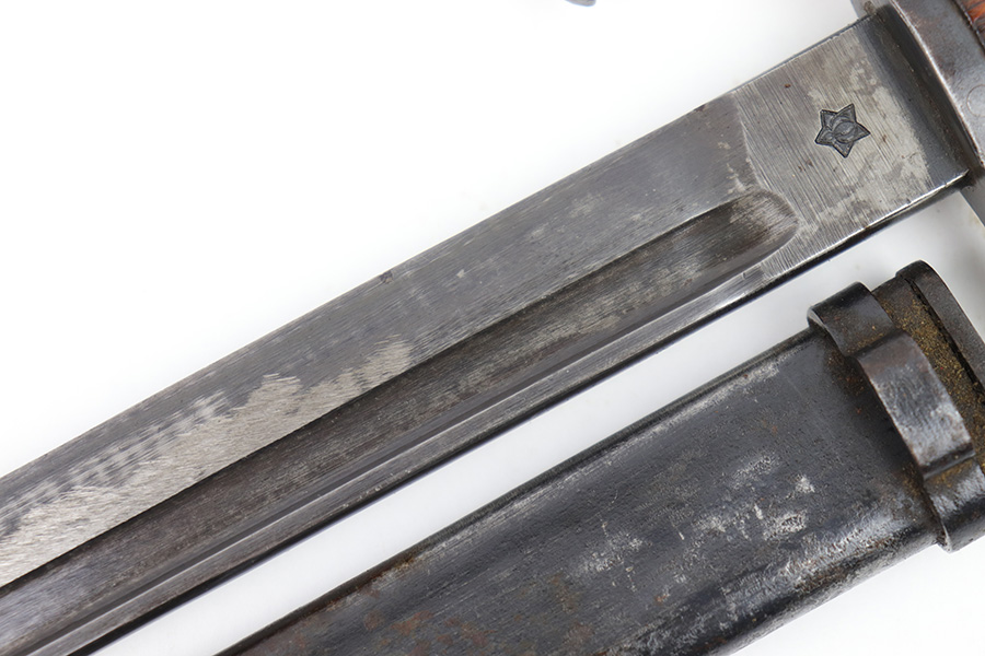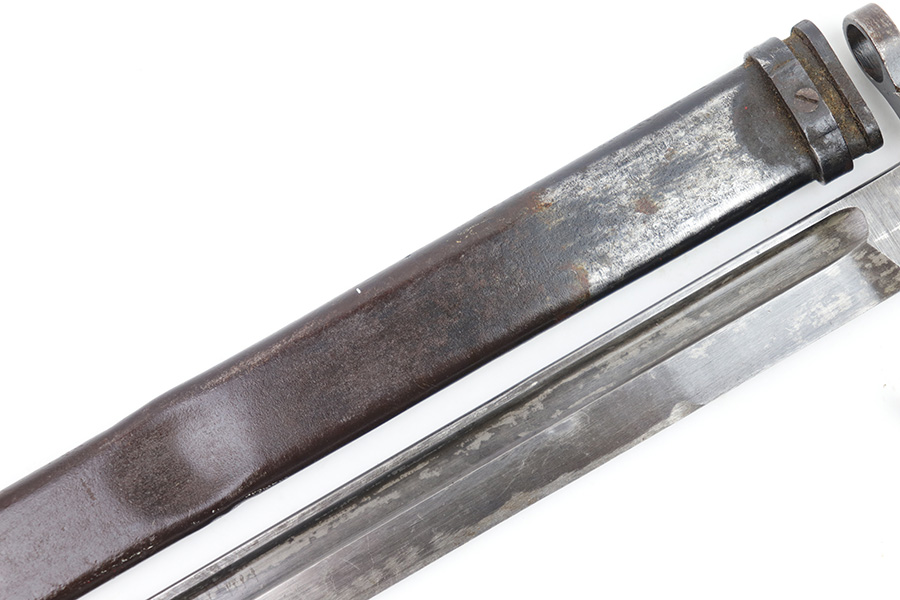 1/23/23 – This is an original WW2 production Type 30 Japanese rifle bayonet. The bayonet blade is maker stamped by Jinsen Arsenal on one side of the base. The blade has some mild surface patina and finish loss throughout. There’s also scabbard rub wear and some signs of sharpening along the edge. The edge also shows signs of use and some mild imperfections (dents, minor chips). The curled style hand guard and pommel have dark surface patina and mild finish loss, but no rust or pitting. The wood grips are in great shape with a few small dents and dings but no major issues. Comes with an original tubular-base metal scabbard. The scabbard has surface patina throughout and a few dents on each side, but this doesn’t affect fit or functionality.