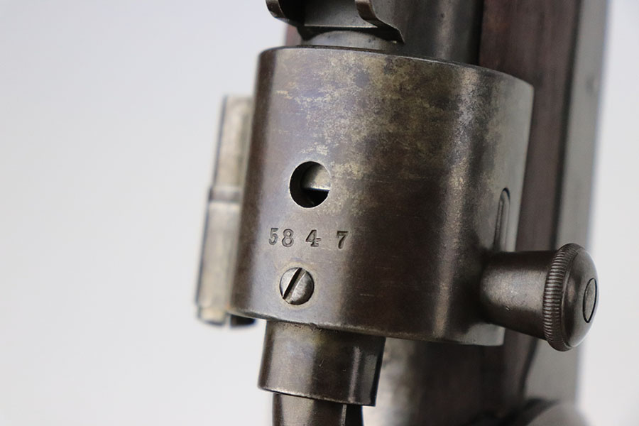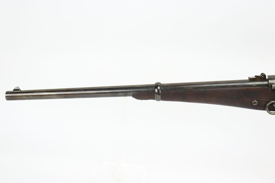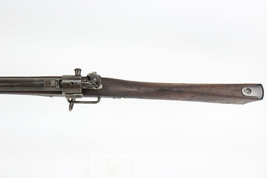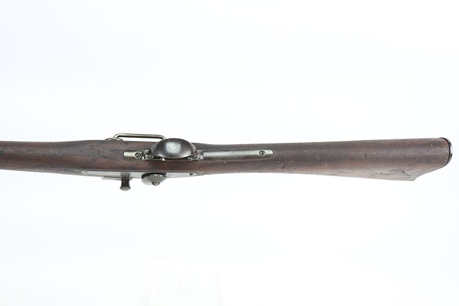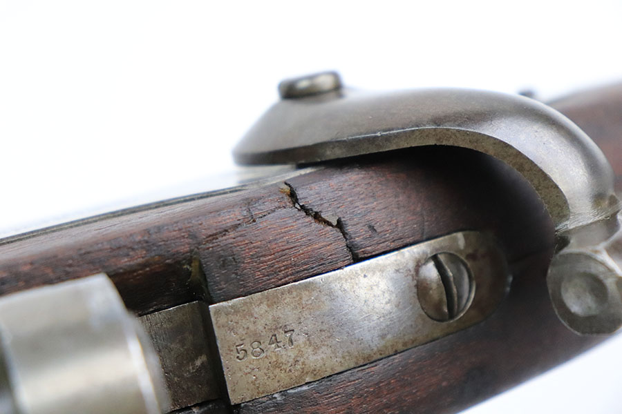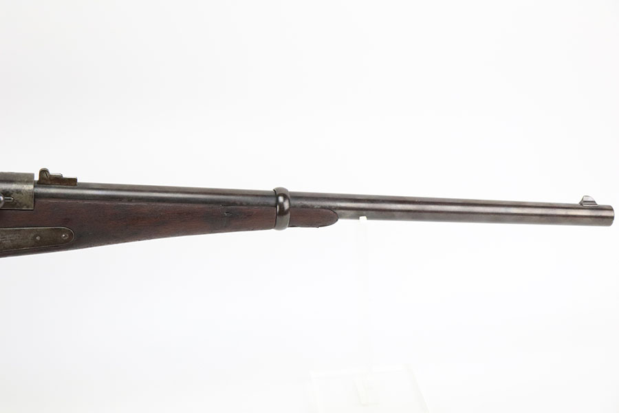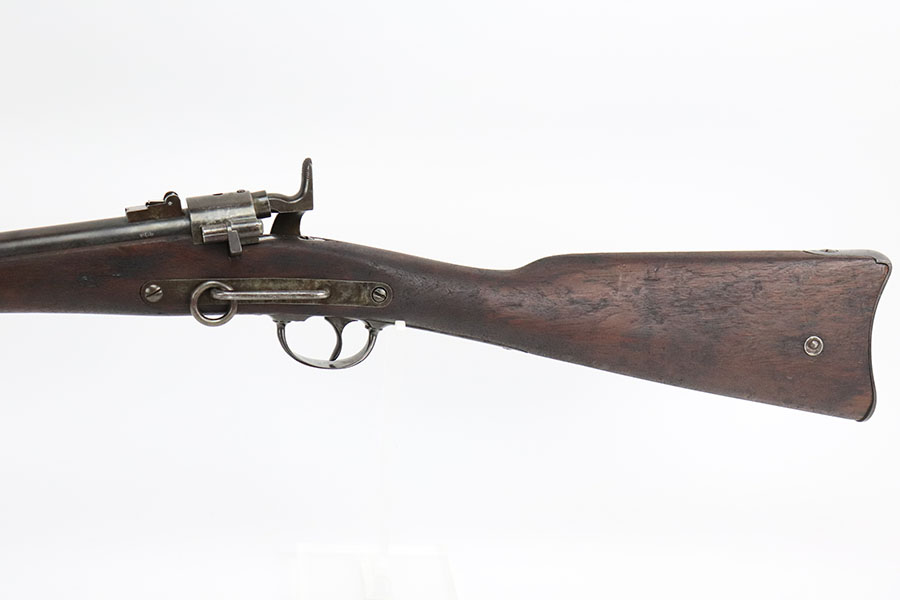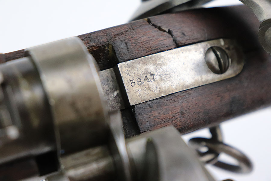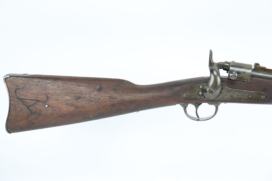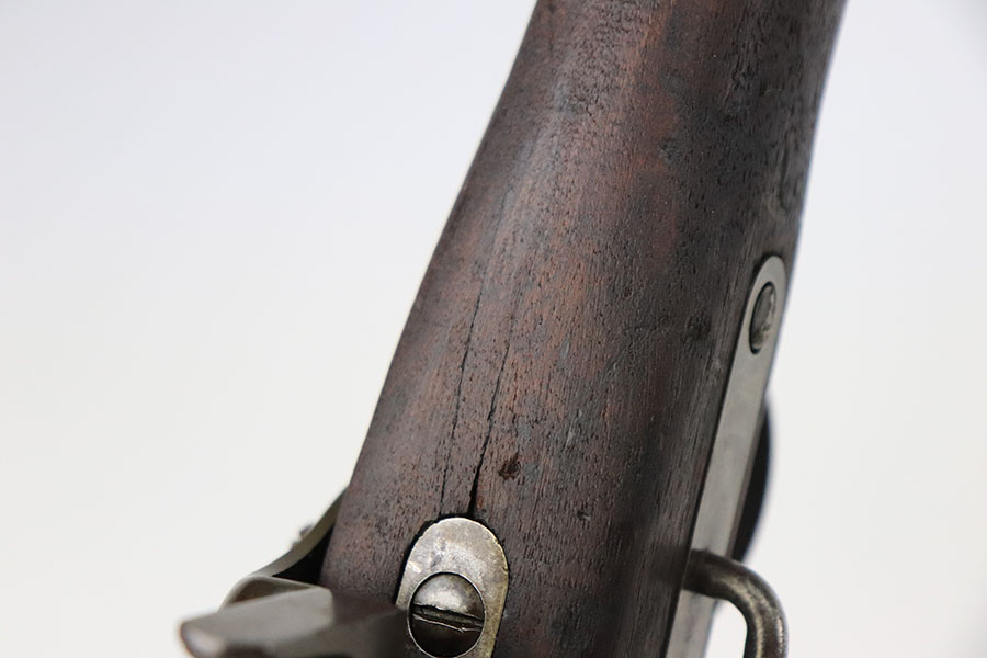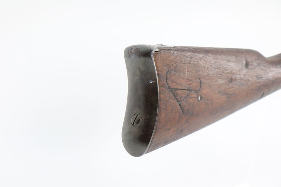 10/19/22 – This is a very nice Joslyn Model 1864 carbine produced for the US government during the Civil War. In total, 16,500 cavalry carbines were made under contract by Joslyn. The initial design from 1862 was met with mixed reviews and was improved upon in 1864. The model 1864’s breech loading assembly was much more favorable and those carbines saw use by the Federal Calvary. The breech loading assemblies were impressive enough that 3,000 were purchased and used to make infantry rifles by the Springfield Arsenal, making them the first mass produced breech-loading rifles to be made by Springfield. This particular example is in very nice condition overall. The metal has retained a majority of its original blued finish. There is some thinning/finish loss throughout as well as patina and use wear. The walnut stock is in nice condition with handling wear throughout and dings in the wood here and there. On the right side of the butt stock there is a carved embellishment as shown. There is a crack in the stock behind the breech and above the hammer assembly as shown. The right-side plate reads “Joslyn Firearms Co. Stonington Conn. 1864”. The top of the breech block shows serial number “5847” and the rear of the block has the patent markings. The left-hand side of the barrel has a “F.D.L” inspector mark toward the breech. The bore is still bright with minor frosting and pinpricking throughout but concentrated toward the muzzle. Overall, an interesting rifle in very nice condition.