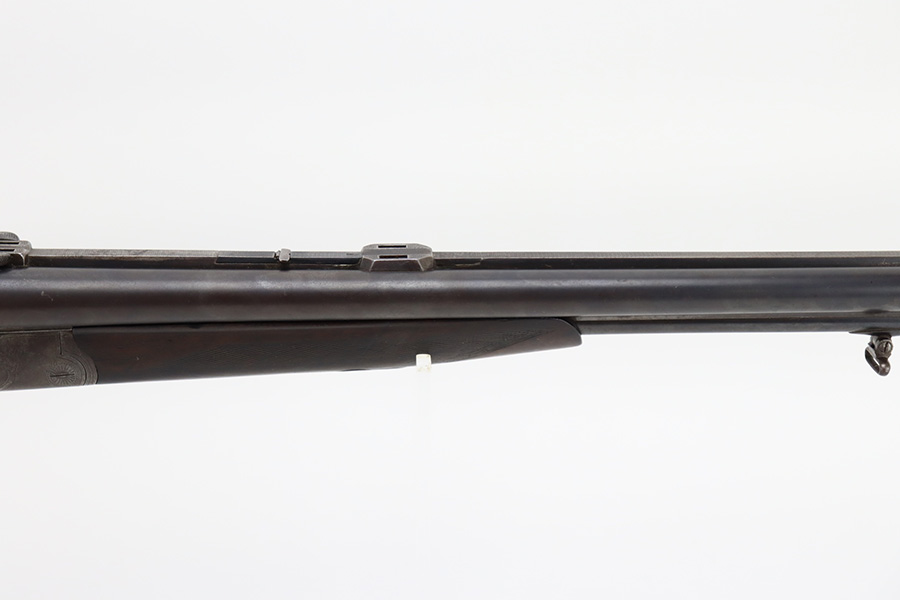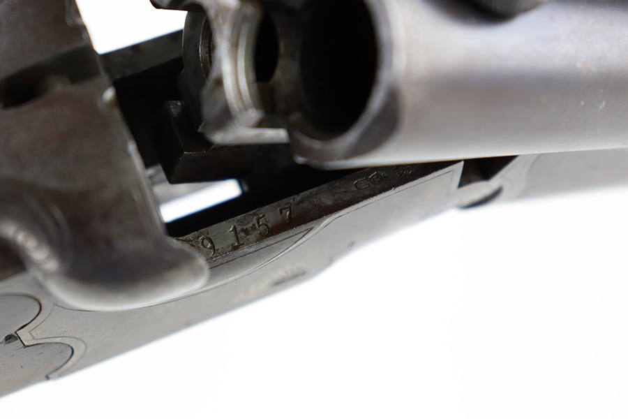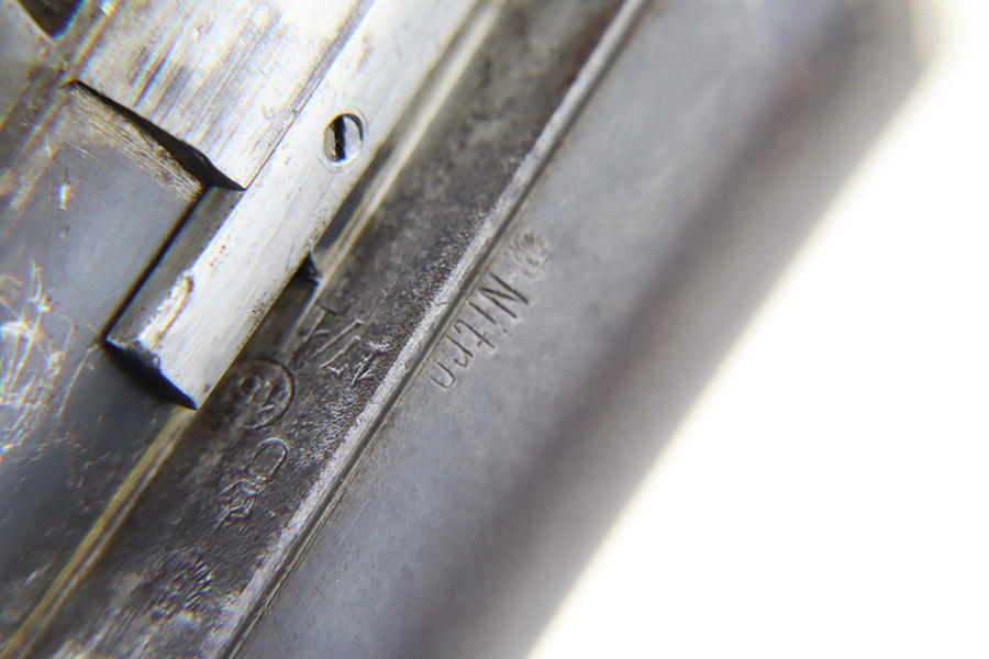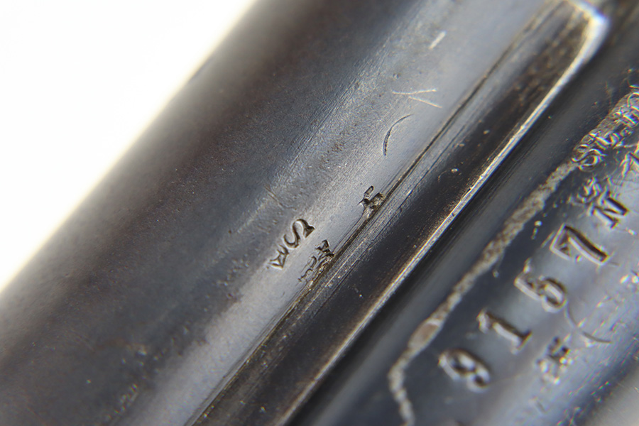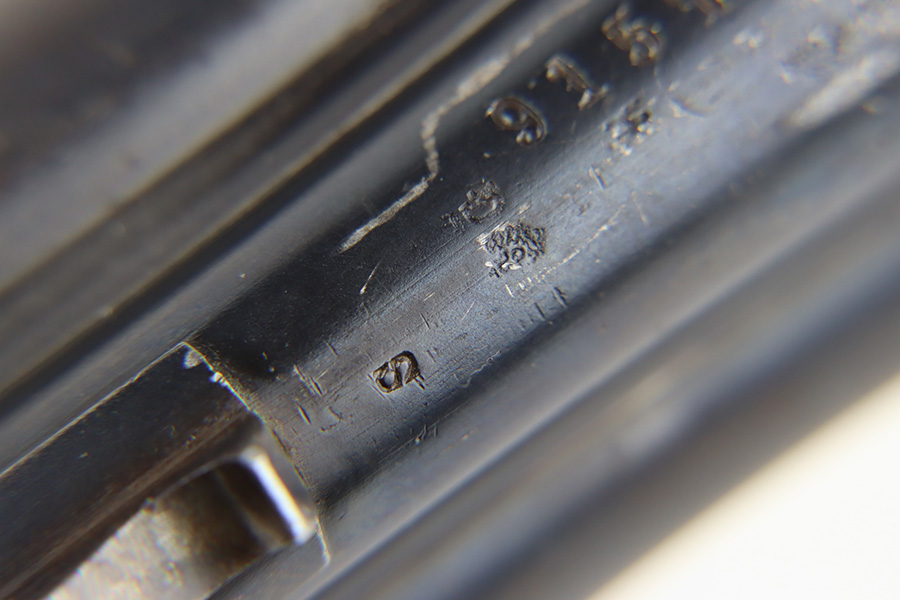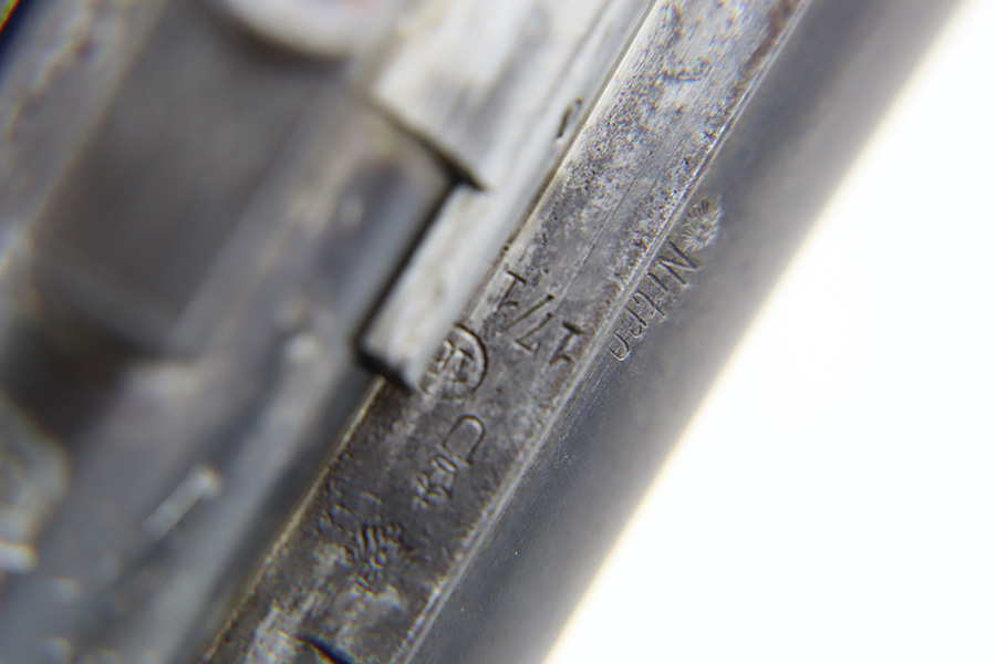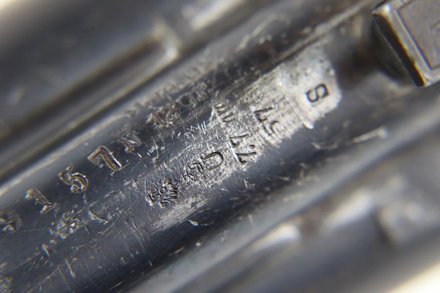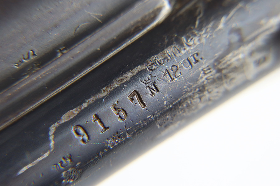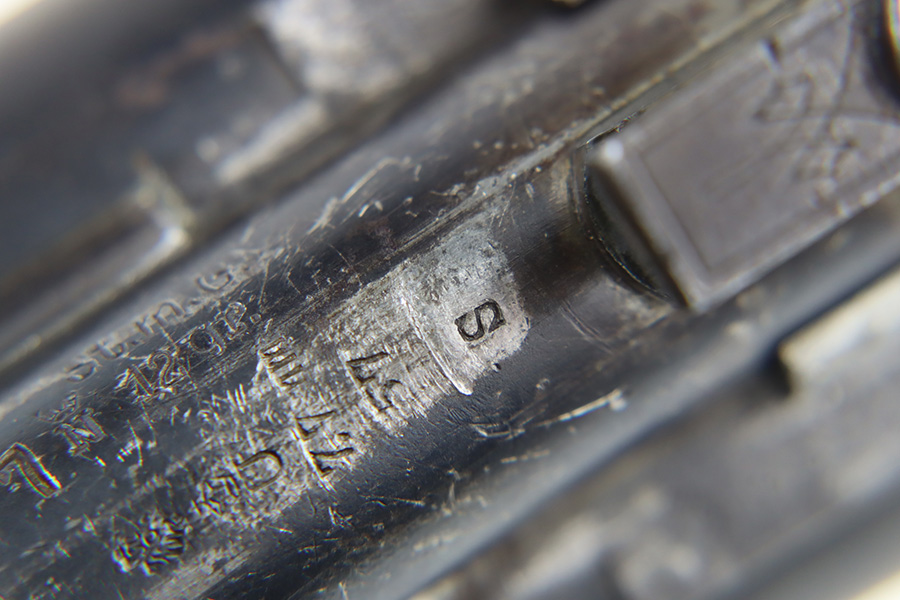 1/3/24 – This is a nice example of a JP Sauer M30 Drilling shotgun/rifle combo, chambered in 16 GA and 7.7mm. It is all matching with the proper German Nitro proofs. The barrels appear to be dated 1917. The gun’s original finish rates roughly 85%. There is thinning on the receiver and brown patina visible under the finish throughout. The wood furniture is nice overall, but there is minor bruising and scratching throughout and a hairline crack around the upper tang of the receiver. Excellent shiny bores, and the rifled barrel has excellent rifling. The gun does not come with a scope, but it does have scope mounts. Fully functional with a great action.
