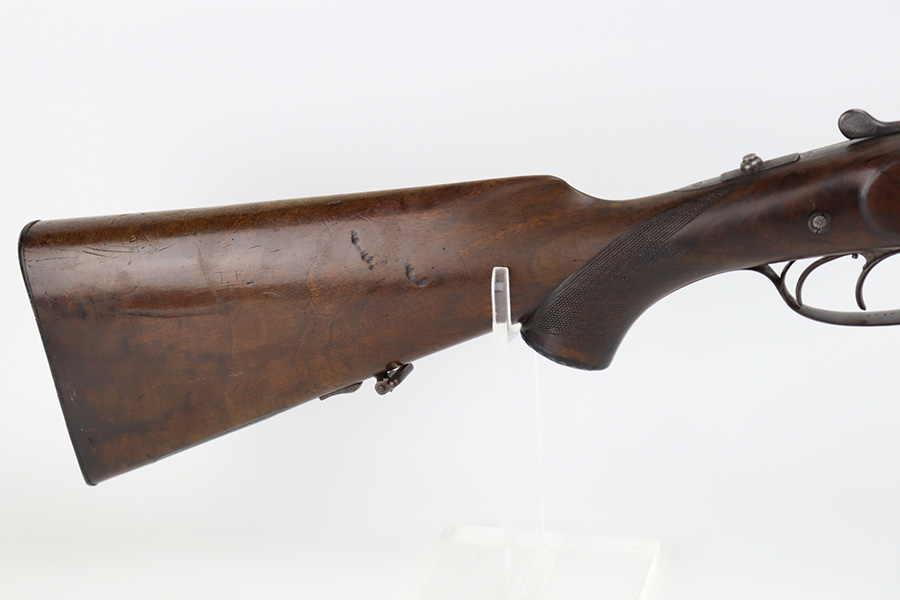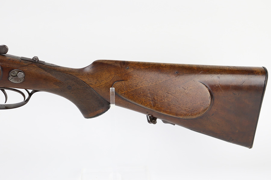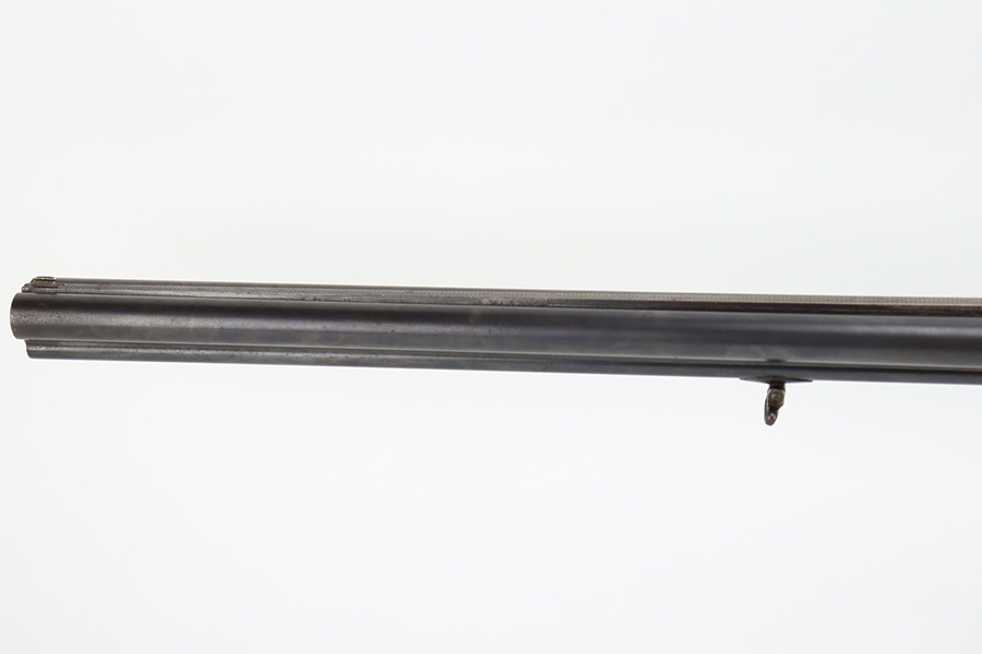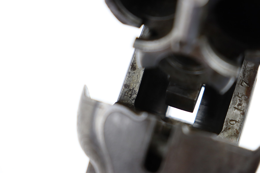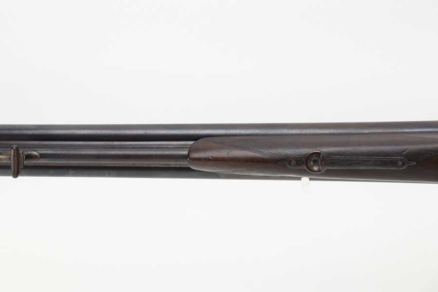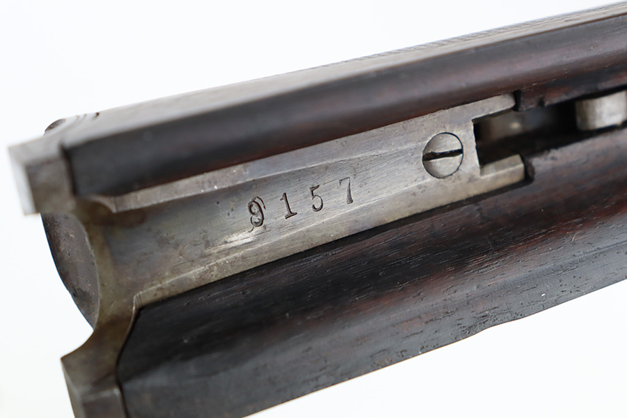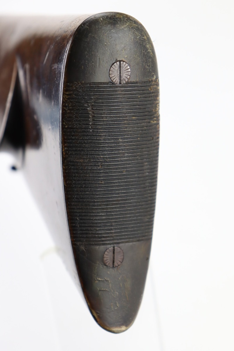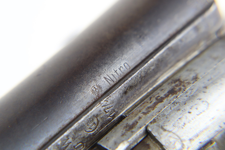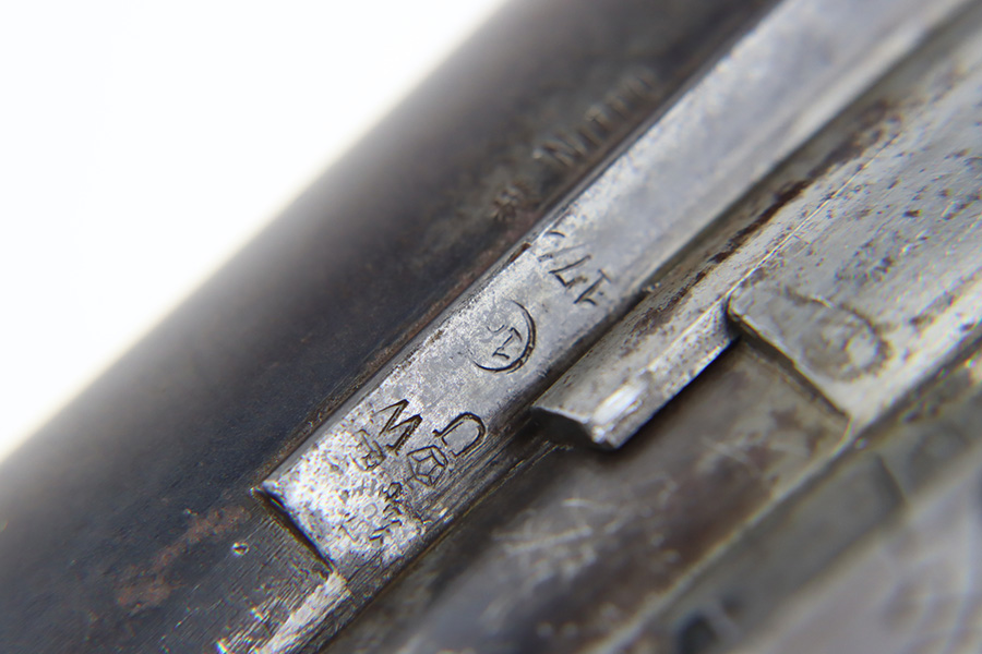 1/3/24 – This is a nice example of a JP Sauer M30 Drilling shotgun/rifle combo, chambered in 16 GA and 7.7mm. It is all matching with the proper German Nitro proofs. The barrels appear to be dated 1917. The gun’s original finish rates roughly 85%. There is thinning on the receiver and brown patina visible under the finish throughout. The wood furniture is nice overall, but there is minor bruising and scratching throughout and a hairline crack around the upper tang of the receiver. Excellent shiny bores, and the rifled barrel has excellent rifling. The gun does not come with a scope, but it does have scope mounts. Fully functional with a great action.