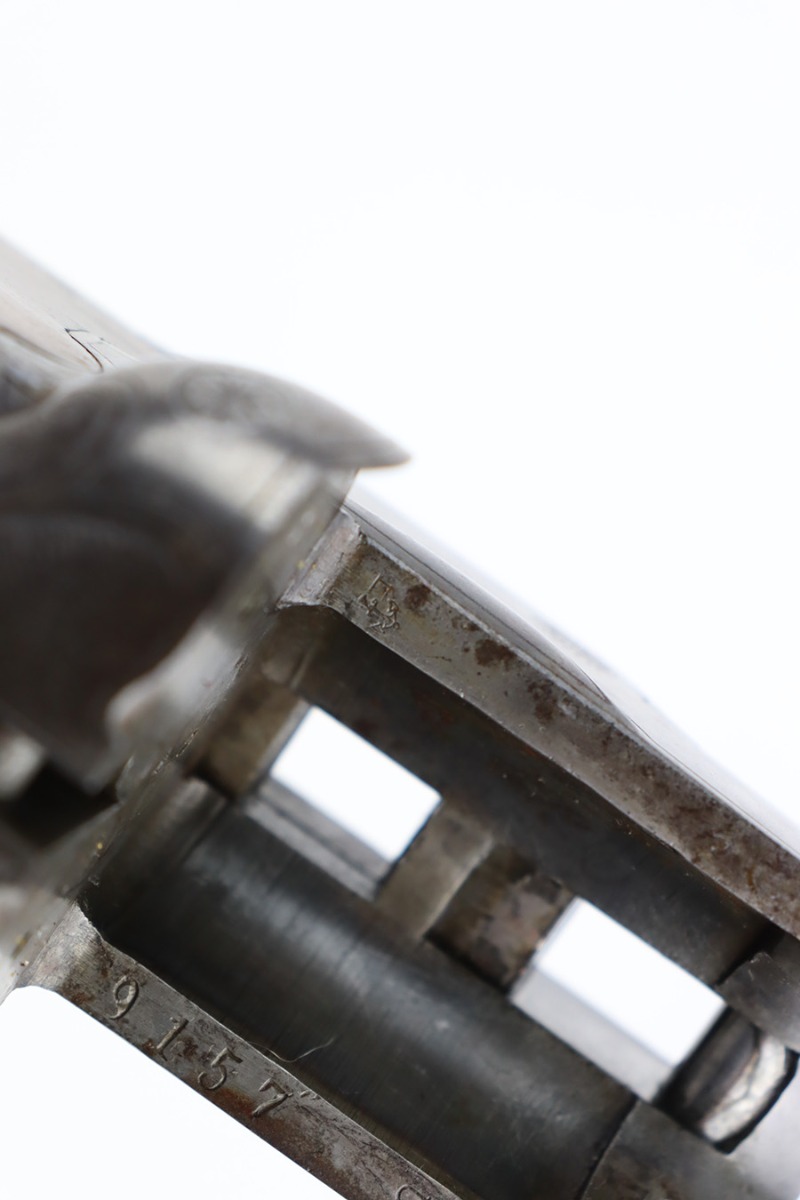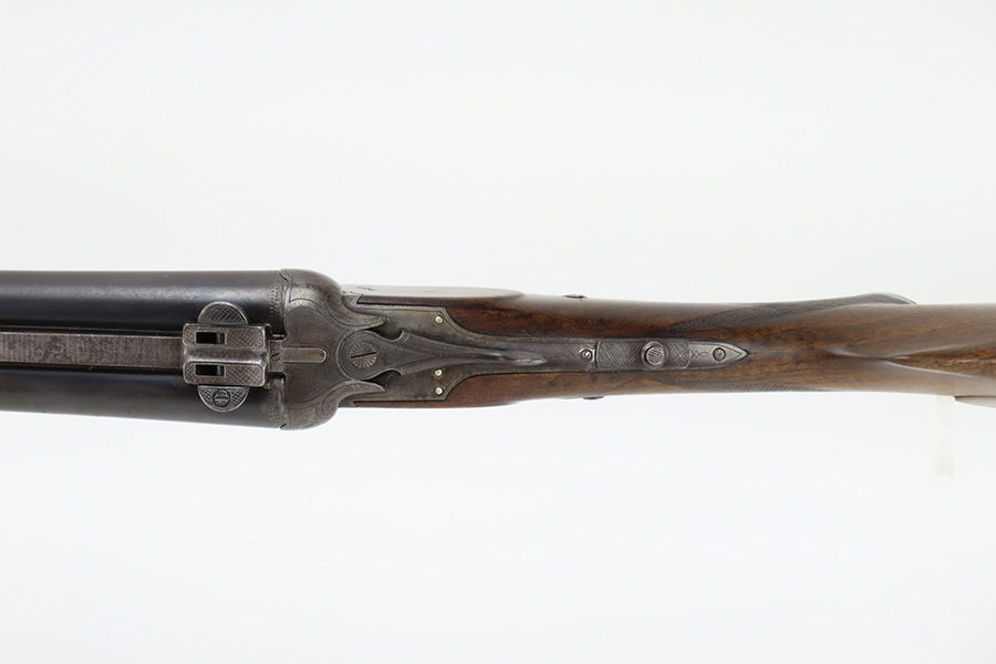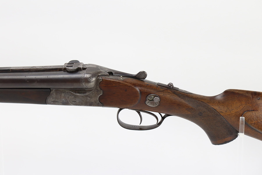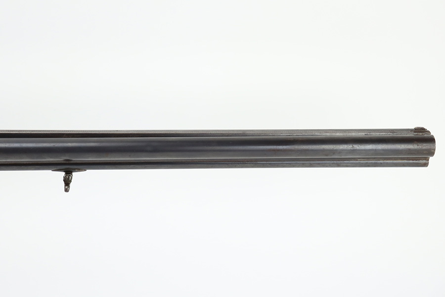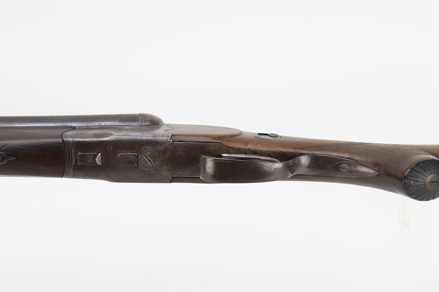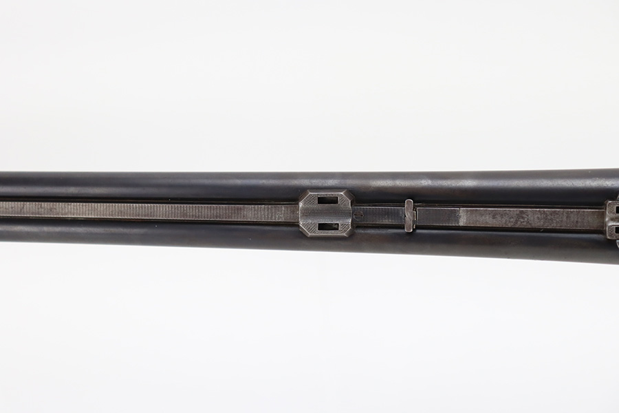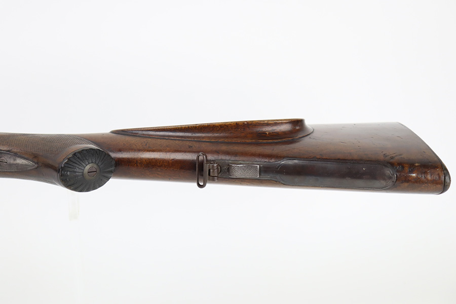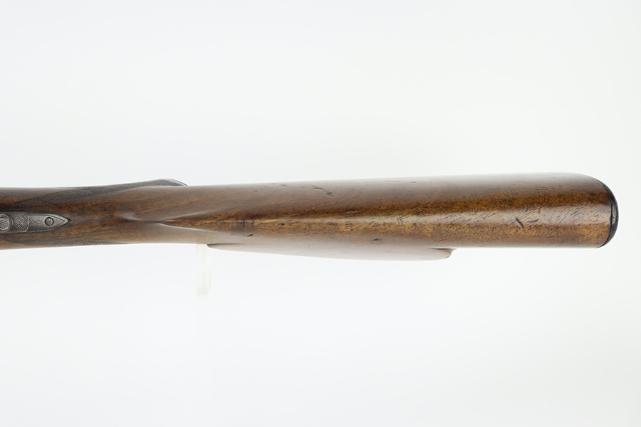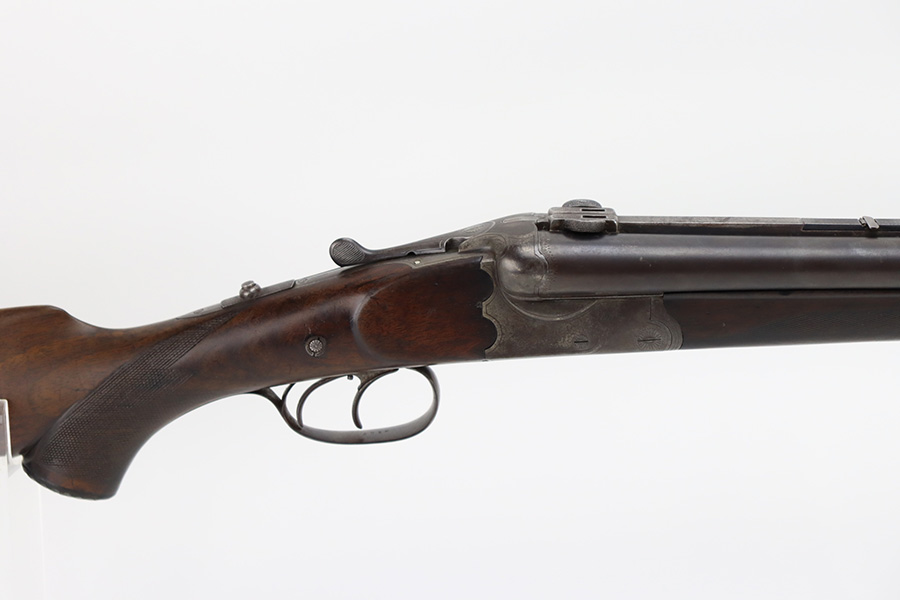 1/3/24 – This is a nice example of a JP Sauer M30 Drilling shotgun/rifle combo, chambered in 16 GA and 7.7mm. It is all matching with the proper German Nitro proofs. The barrels appear to be dated 1917. The gun’s original finish rates roughly 85%. There is thinning on the receiver and brown patina visible under the finish throughout. The wood furniture is nice overall, but there is minor bruising and scratching throughout and a hairline crack around the upper tang of the receiver. Excellent shiny bores, and the rifled barrel has excellent rifling. The gun does not come with a scope, but it does have scope mounts. Fully functional with a great action.