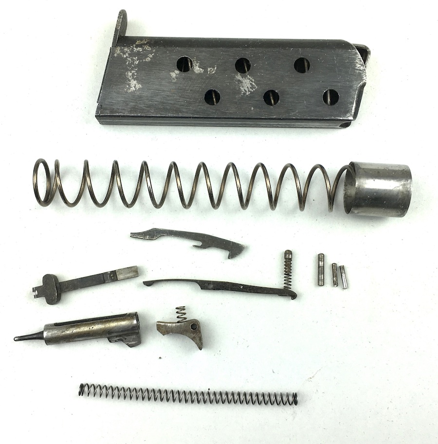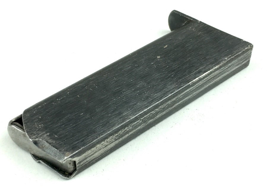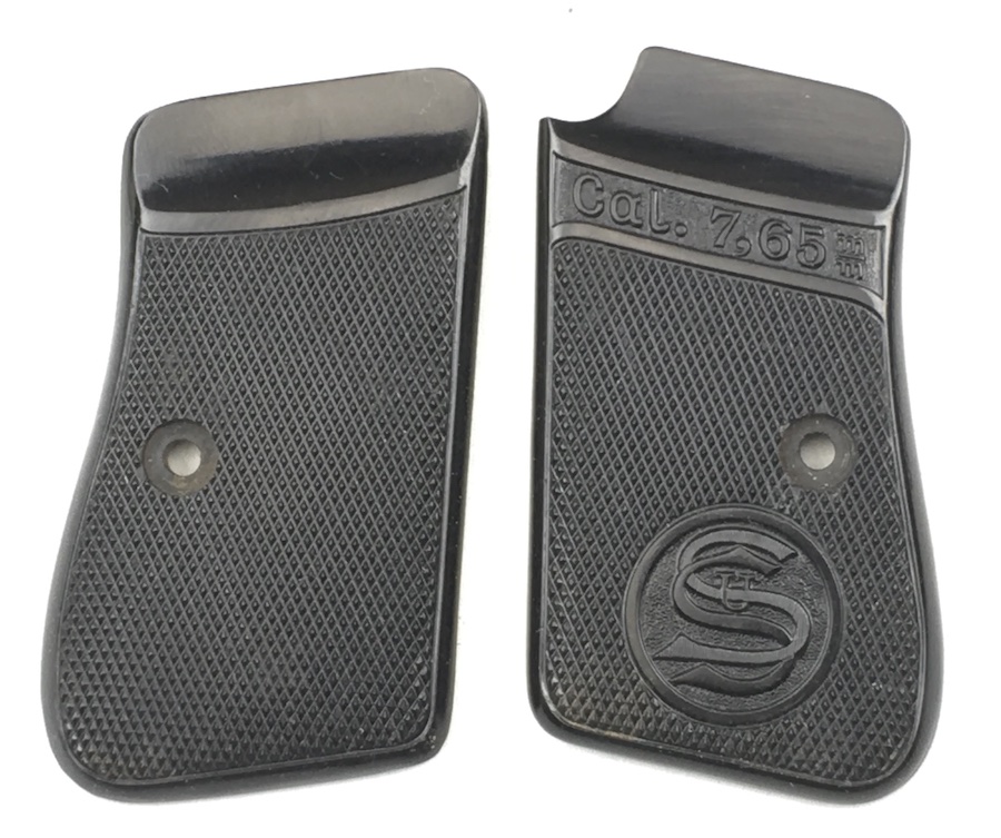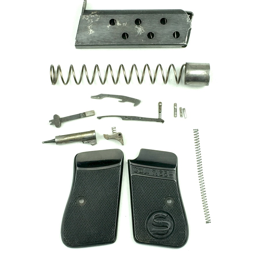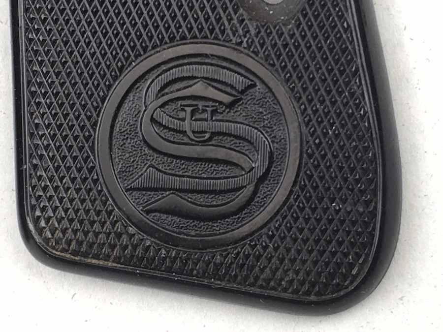 10/16/19 – This is a parts kit, original grips and magazine for the JP Sauer Behordenmodell in 7.65mm. Grips are in near mint condition with no chips or warps. Clearly marked with distinct logo and great checkering. Rear of the grips are correctly matched and designated left and right. Magazine is stamped on the base with the S&S logo and caliber. Strong smooth spring. All parts are excellent and usable. Authentic pieces or your Sauer pistol.