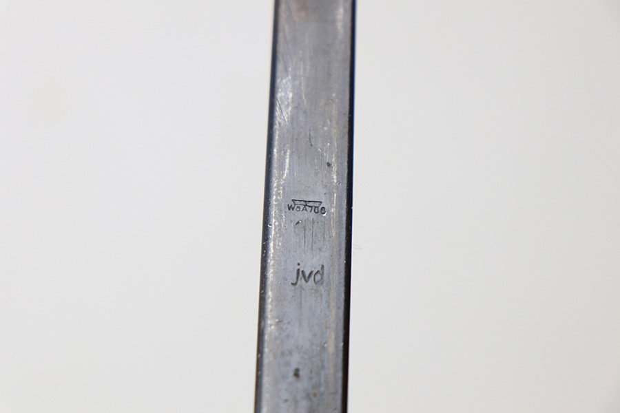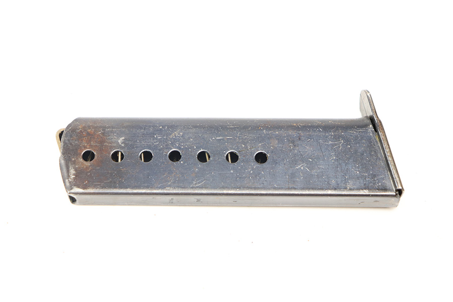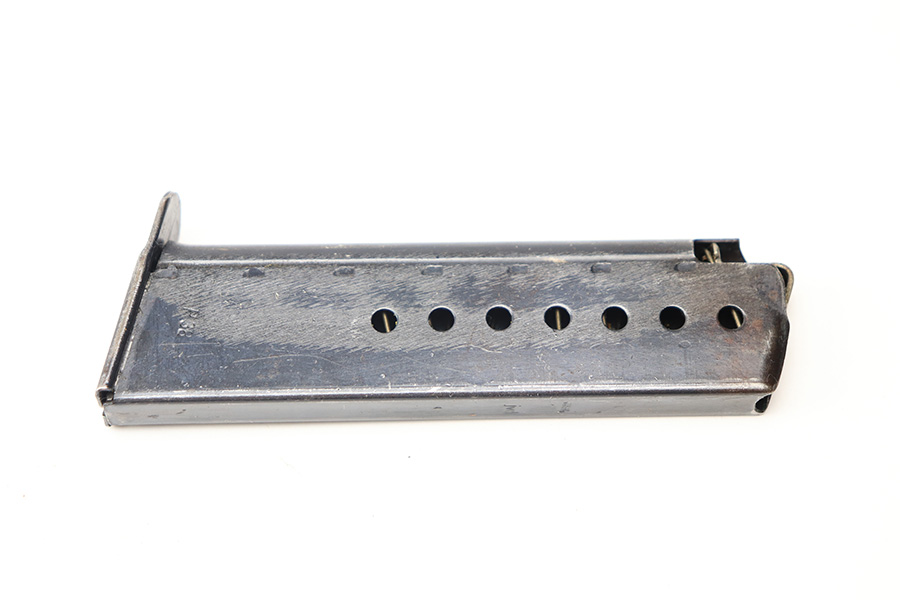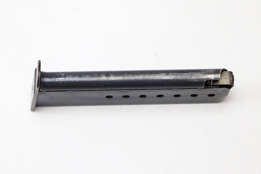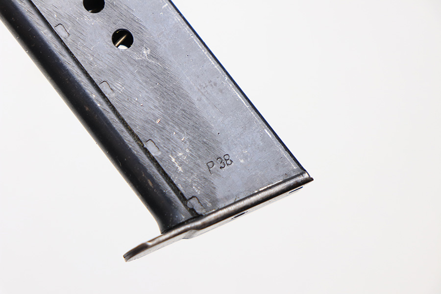 1/13/22 – This is an original WW2 production P.38 magazine. The magazine is “jvd” maker stamped on the spine and waffen proofed with a WaA706 eagle stamp. The left side of the frame is P.38 stamped. There is some mild finish loss but no rust or pitting. Strong, fully functional spring.