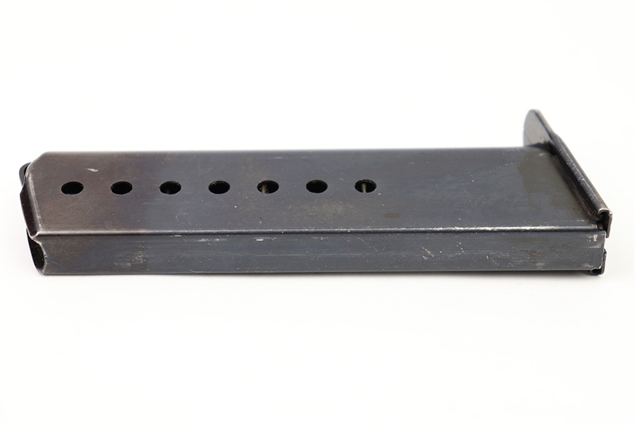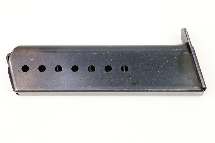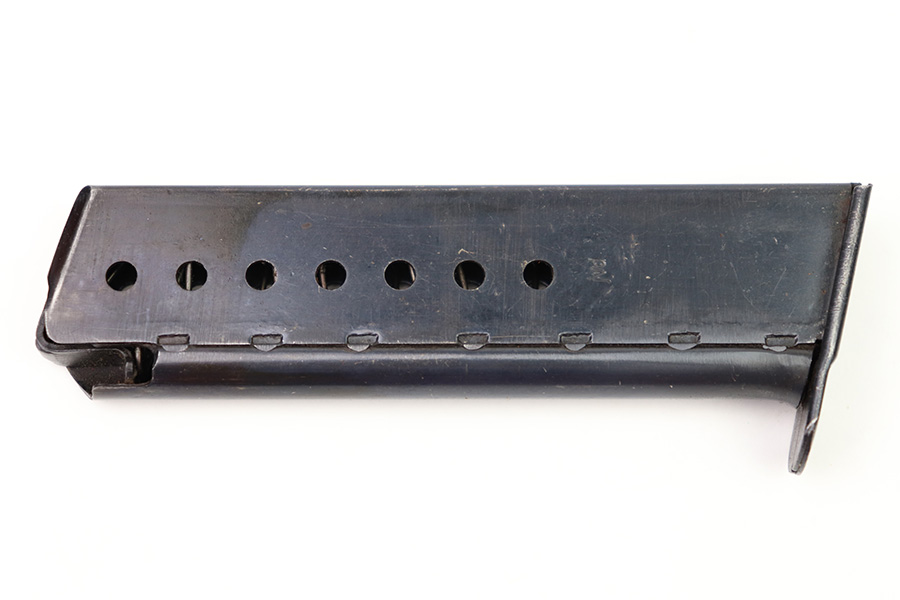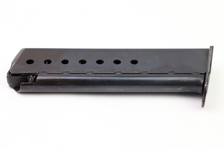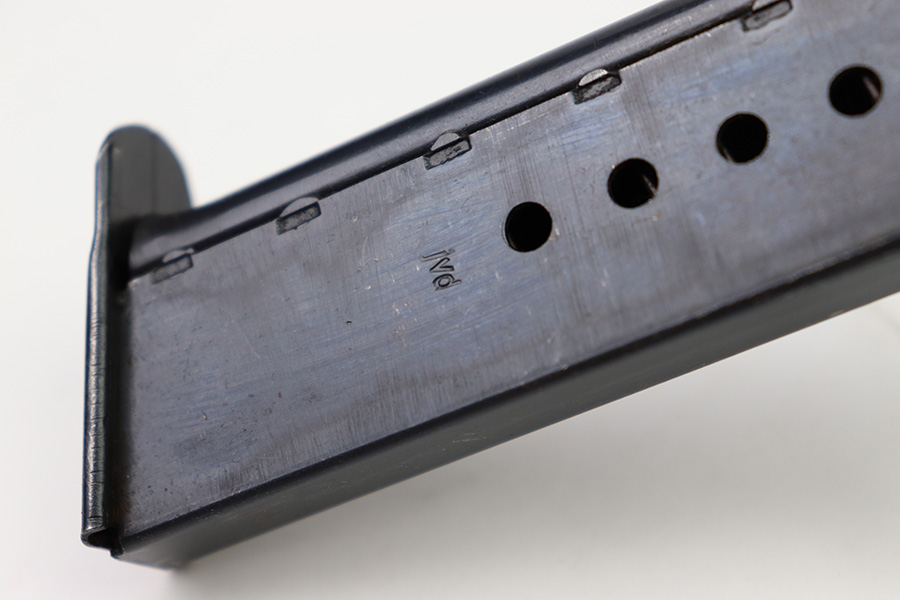 8/3/22 – This is an original WW2 production P.38 magazine. The magazine is in great condition with very nice bluing throughout. Minimal finish loss and no rust or pitting. The left side of the tube is “jvd” maker stamped, and there are no other markings. The spring is strong and fully functional.