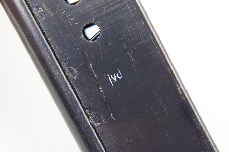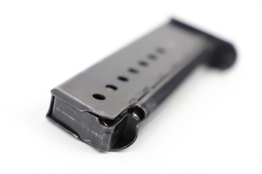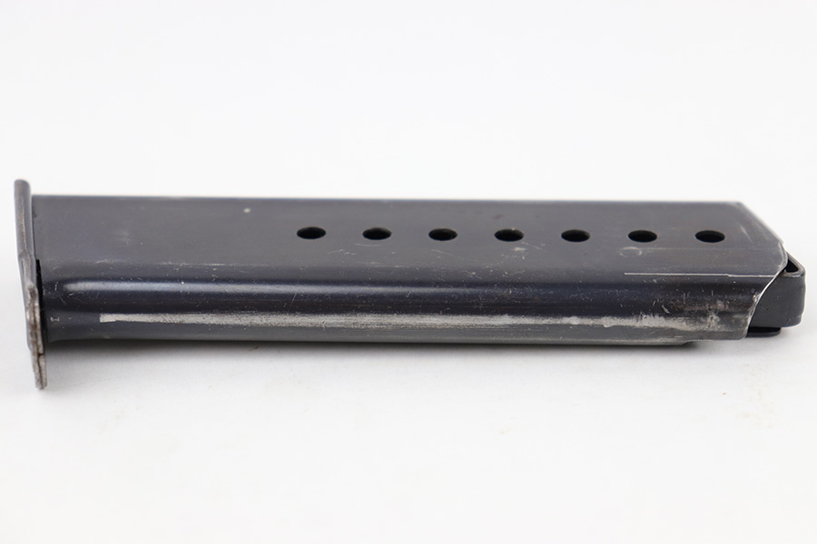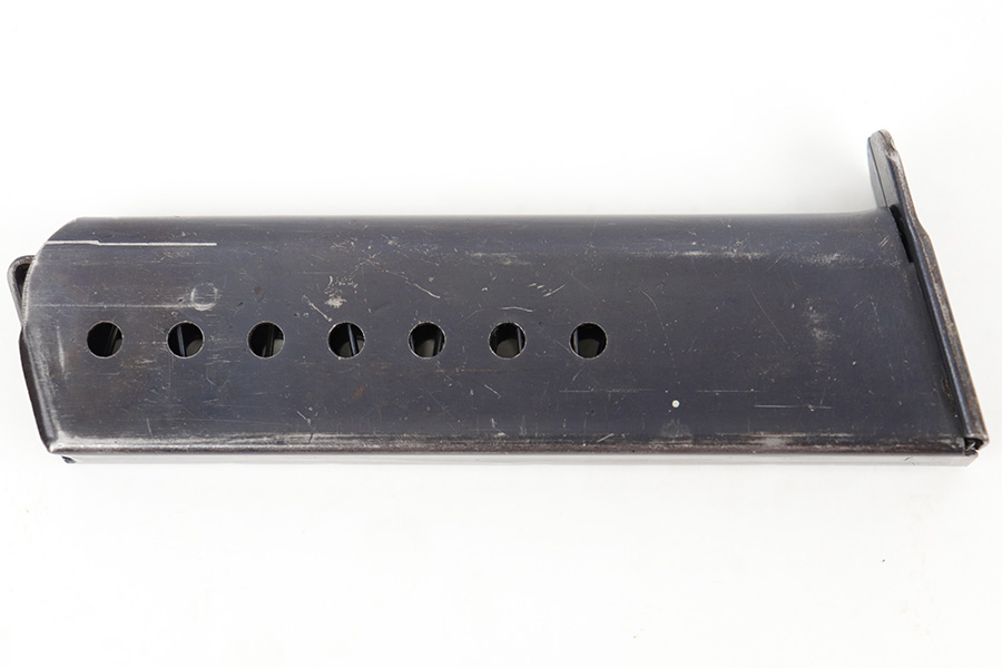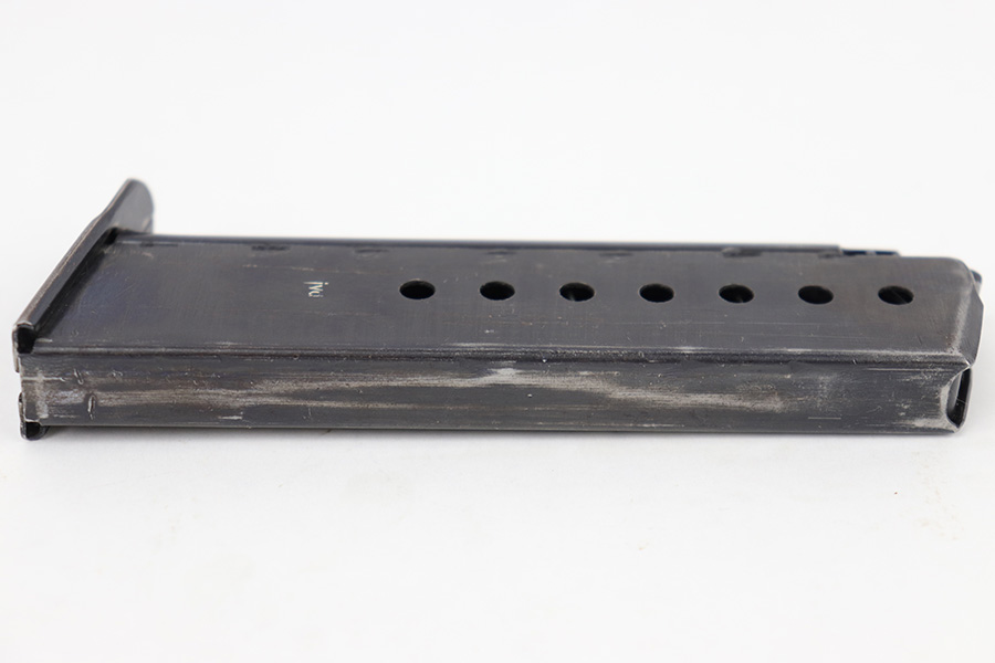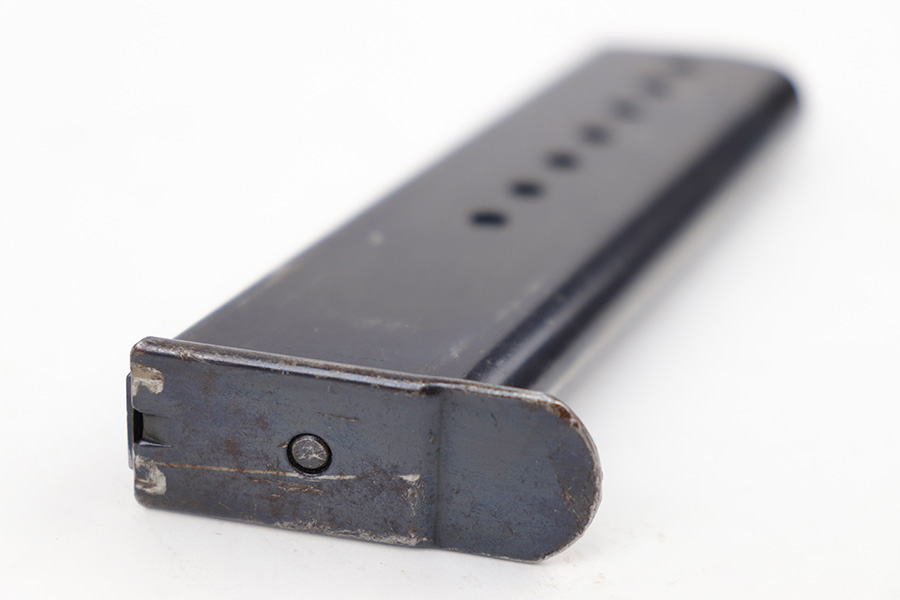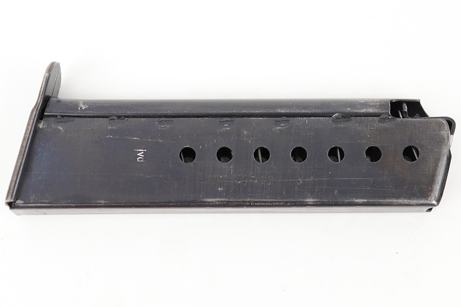 5/2/23 – This is an original WW2 production P.38 magazine. The magazine is stamped on the left side of the tube “JVD” which was a metal company subcontractor for P.38 magazines during WW2. The magazine is in great shape with some mild finish loss and typical surface patina but no major rust or pitting. The spring is strong and fully functional.