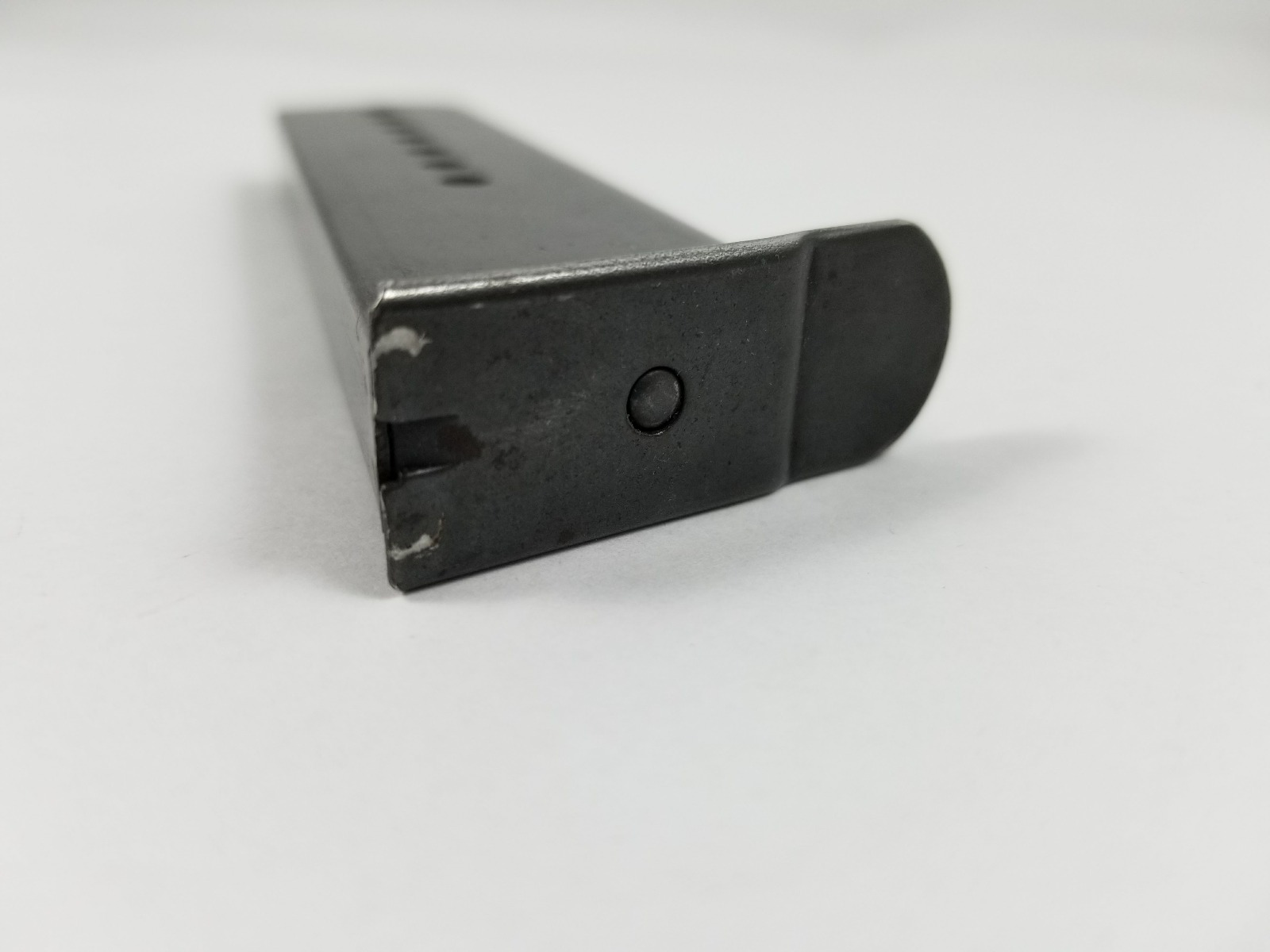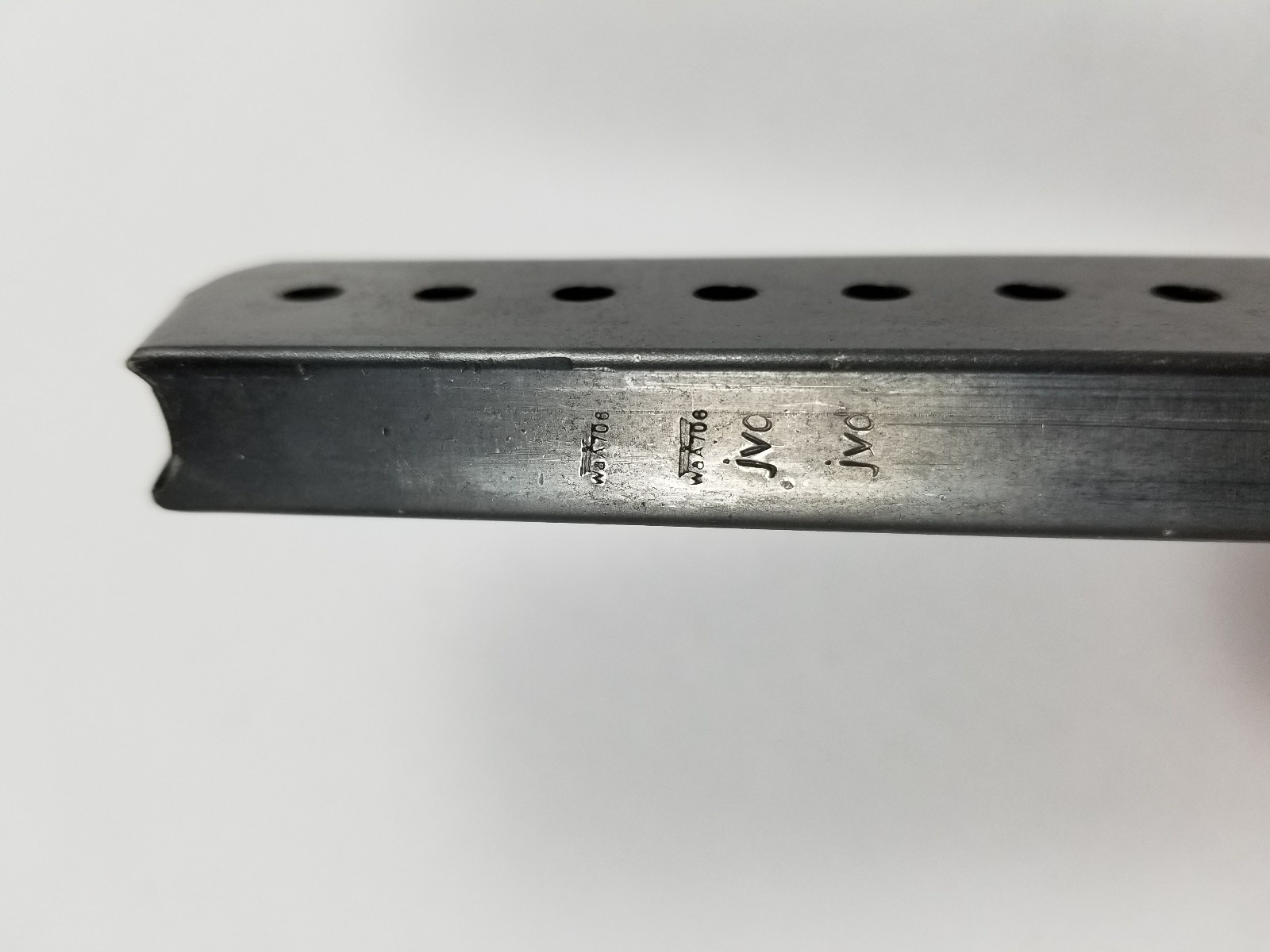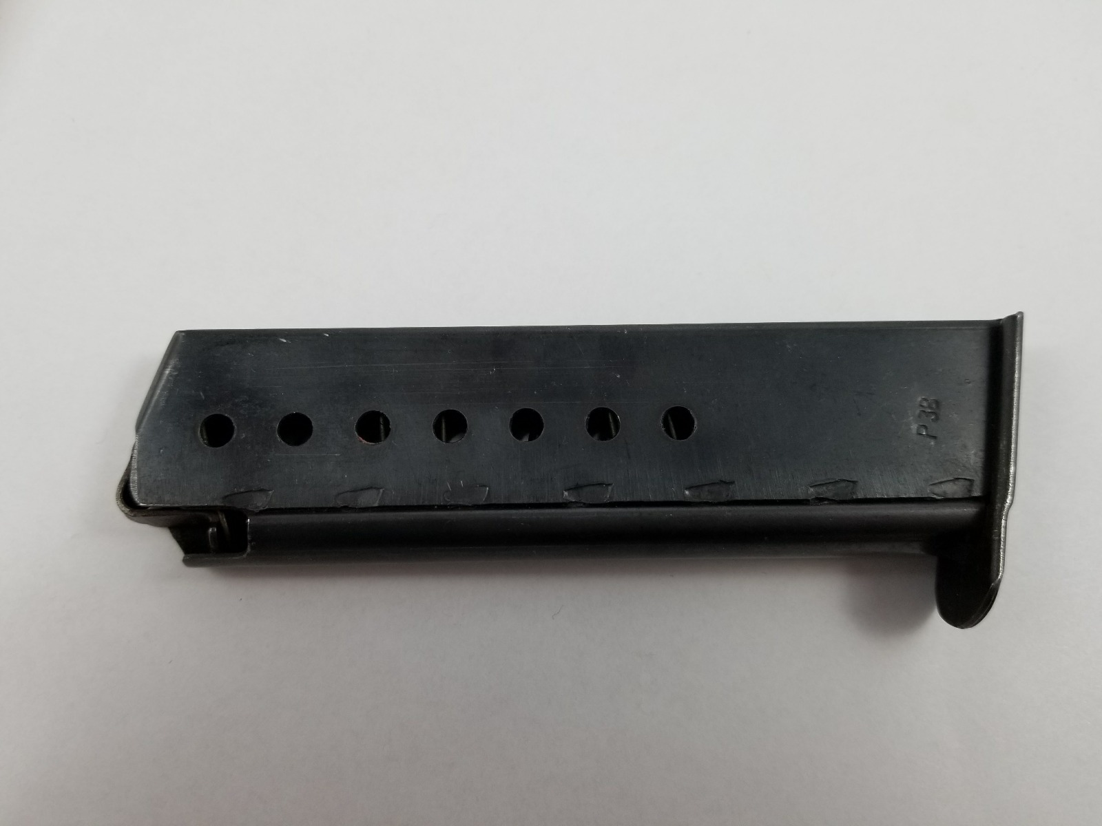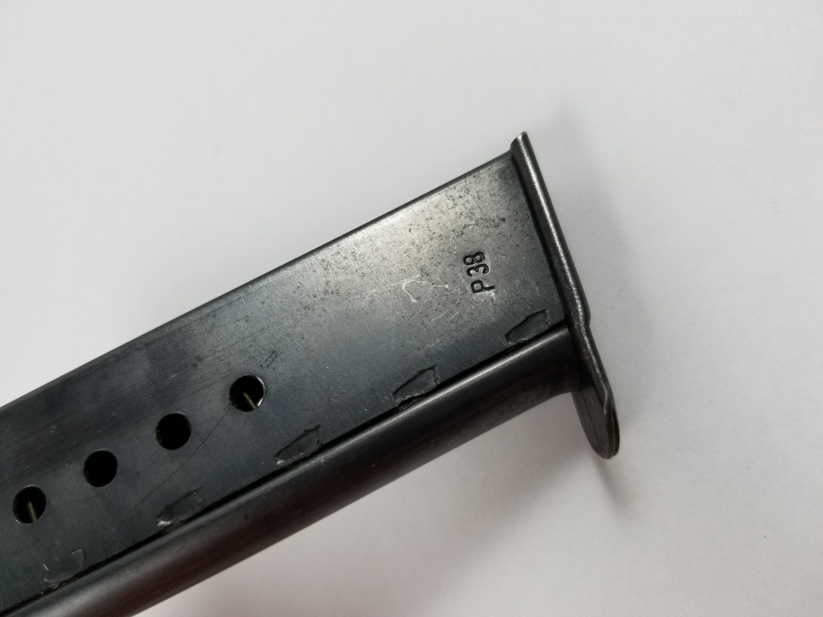 3/4/18 – This is an original, minty WW2 P.38 magazine. The spine has two waffen WaA706 proof stamps and two “jvd” maker stamps. The spring is strong and has smooth action. Guaranteed original and fully functional.