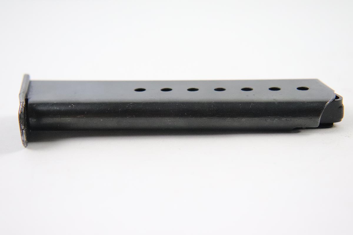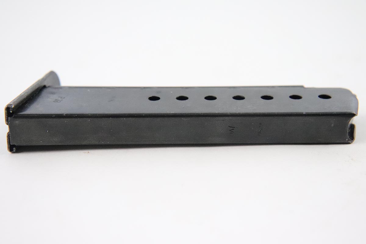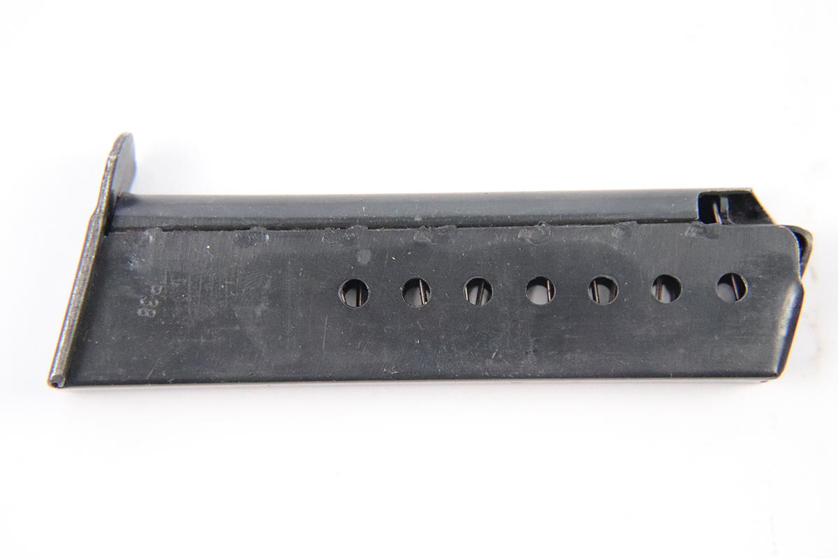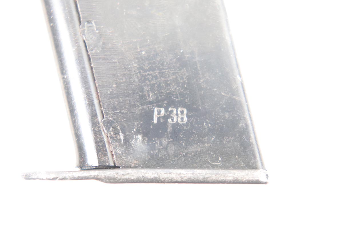 5/15/18 – This is an excellent, WW2 original P.38 magazine made by jvd. The spine of the magazine is “jvd” stamped with a waffen proof WaA706. The left side of the magazine is “P38” stamped. There is no rust or pitting, and the spring is fully functional.