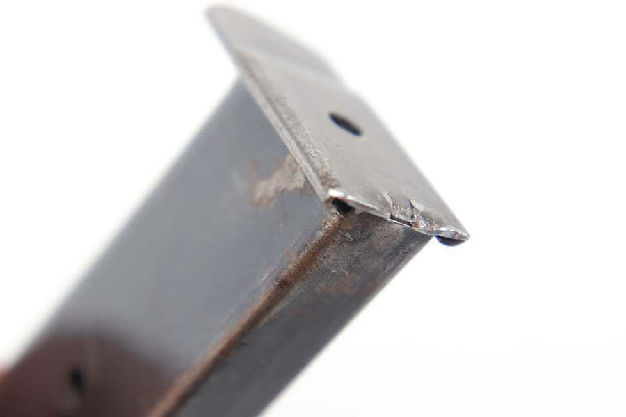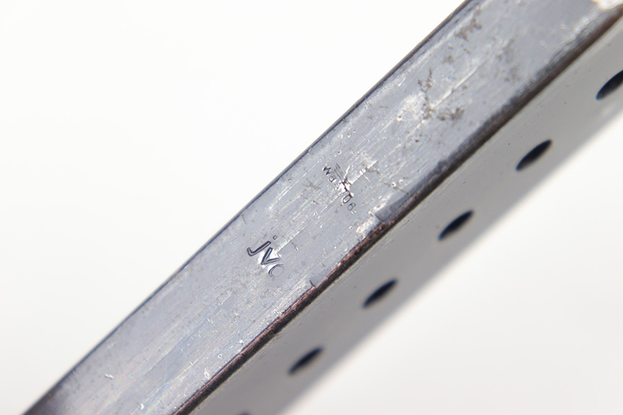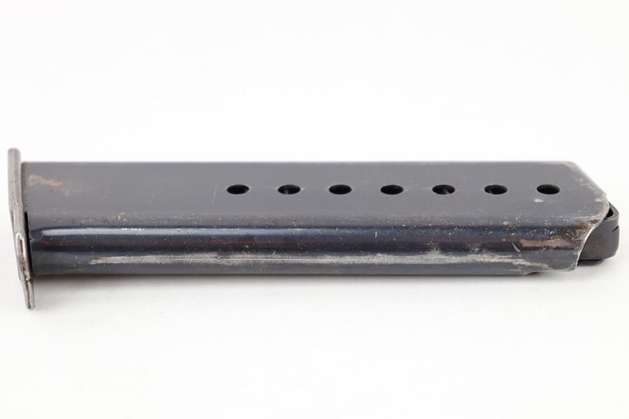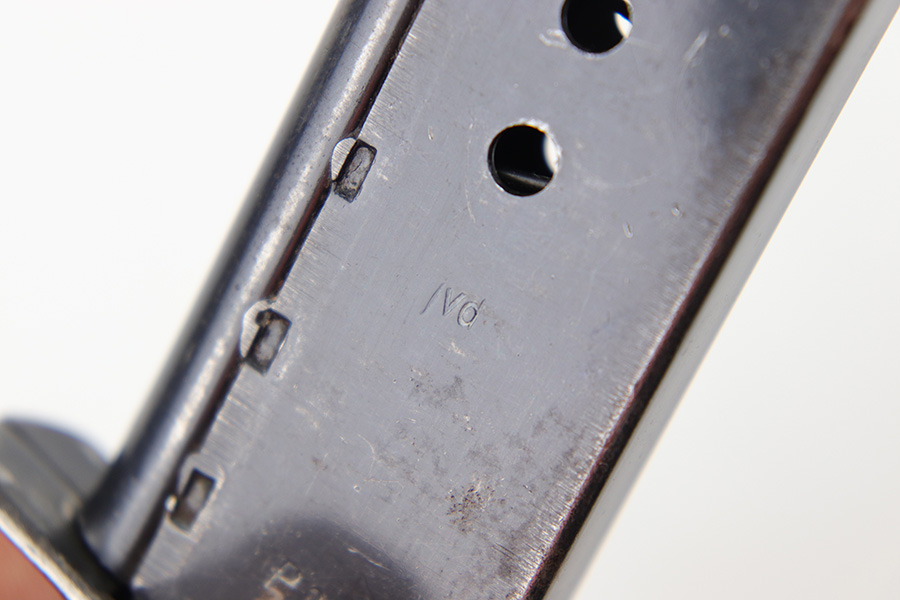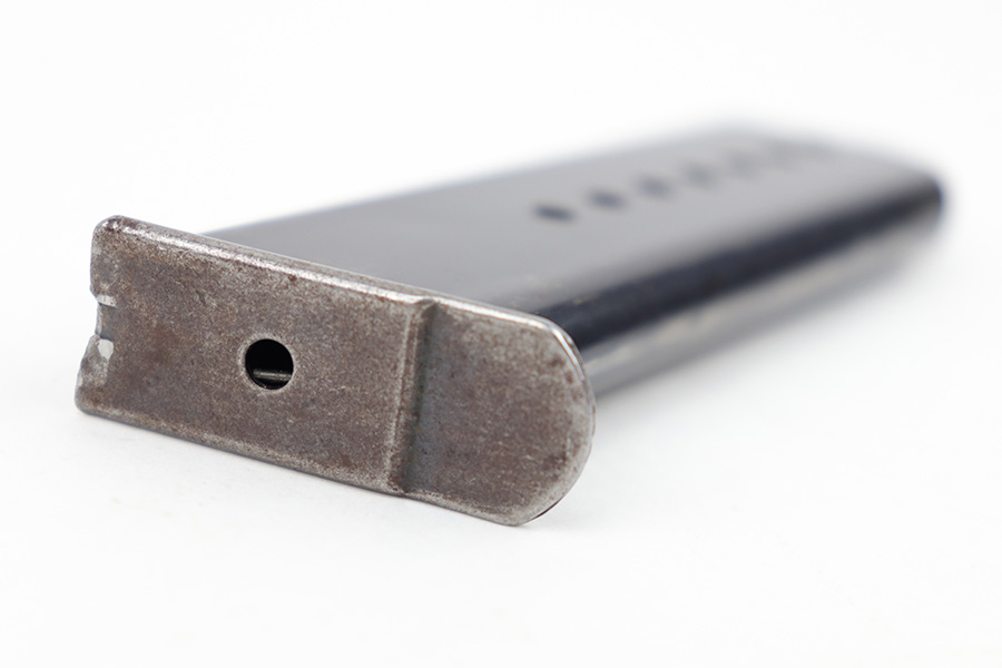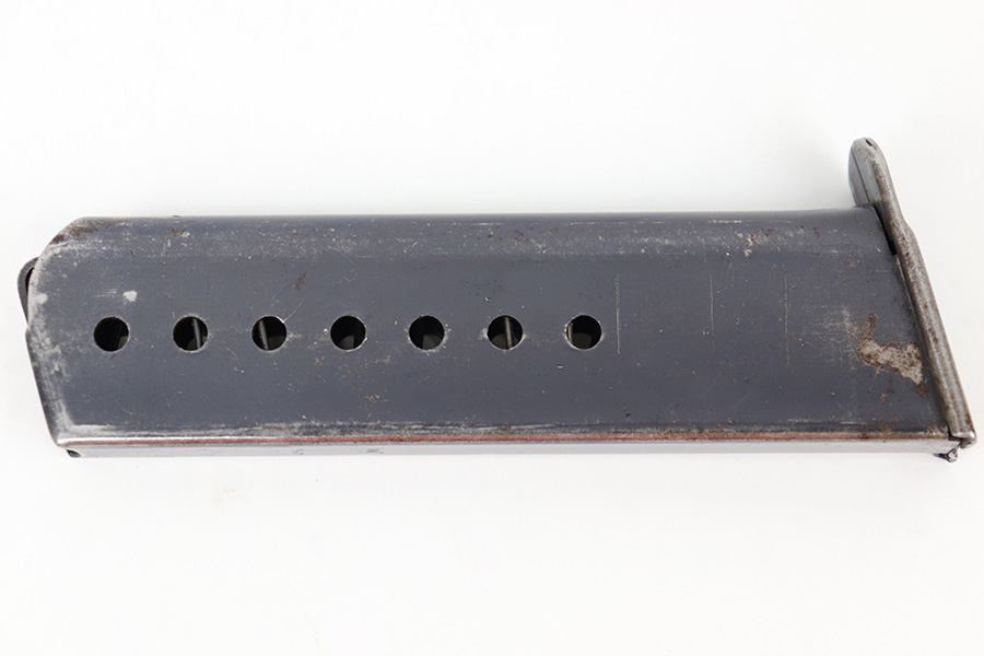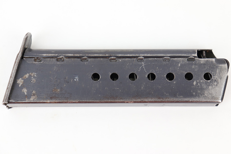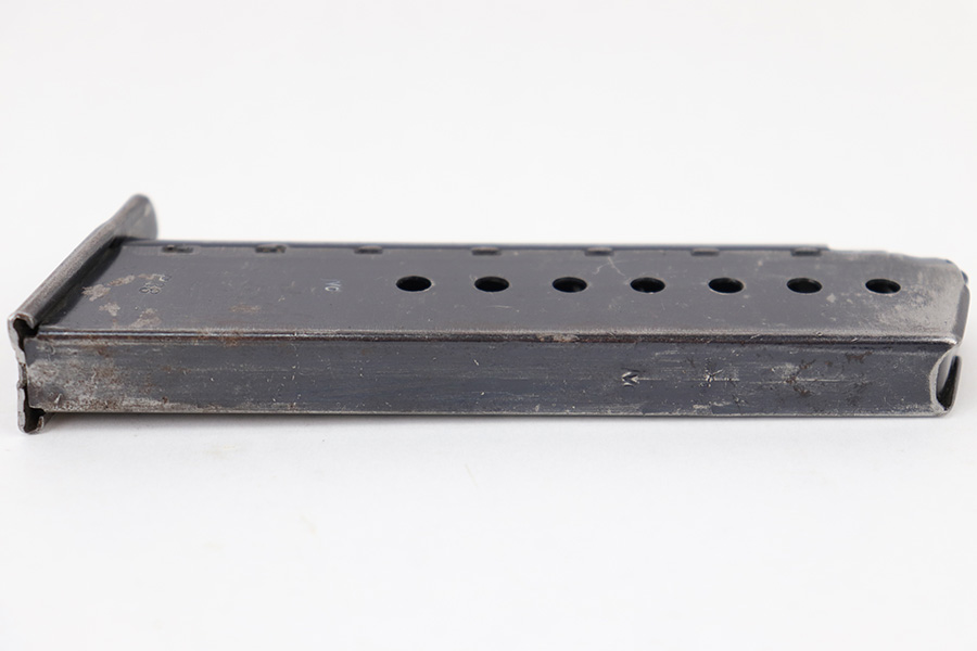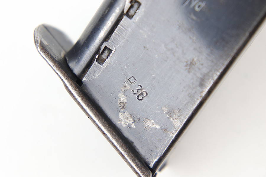 6/20/23 – This is an original WW2 production JVD P.38 magazine. The magazine is stamped P.38 and JVD on the left side of the tube. The spine is also stamped JVD with a waffen WaA706 military proof stamp. The base retaining piece is missing, but the base is still attached and secure. Fully functional with a smooth spring. There mild surface patina and finish loss but no major condition issues.