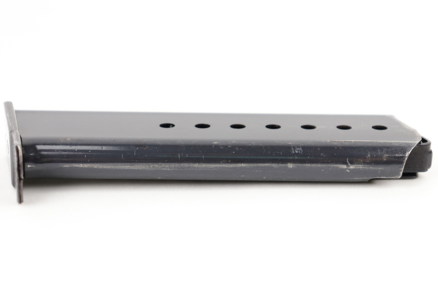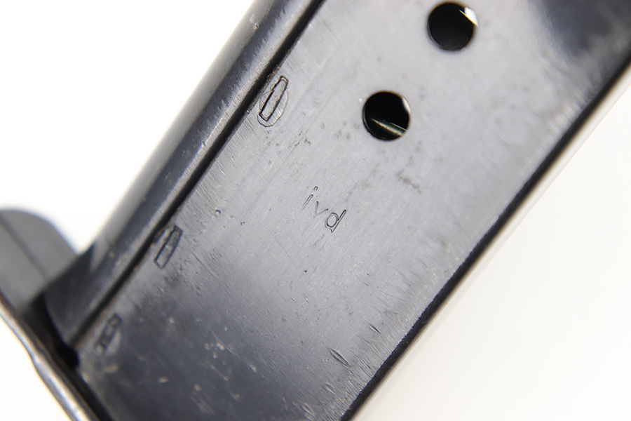 6/28/23 – This is an original WW2 production P.38 magazine by JVD. The magazine is in great condition with all original finish and a fully functional spring. There’s some mild surface patina and normal signs of aging but no major issues. The left side of the tube is “jvd” stamped, and there are no other markings or proof stamps.
