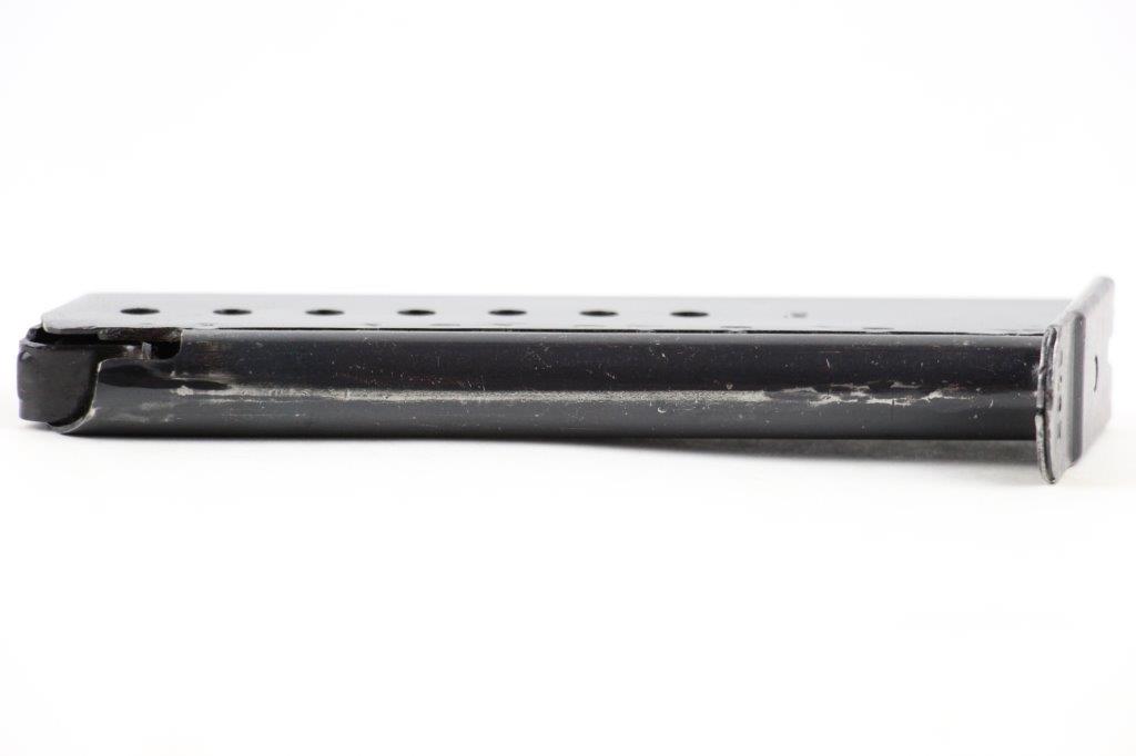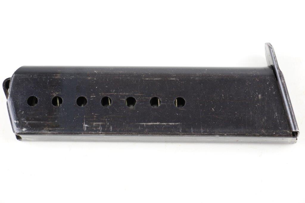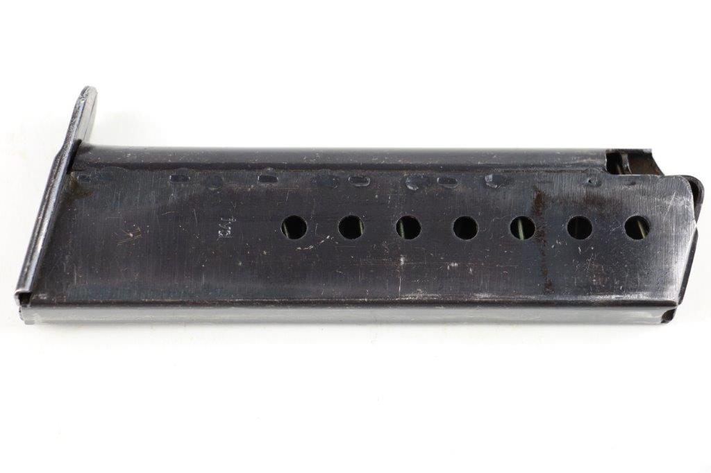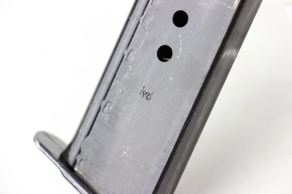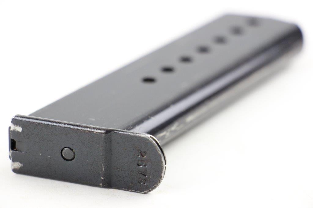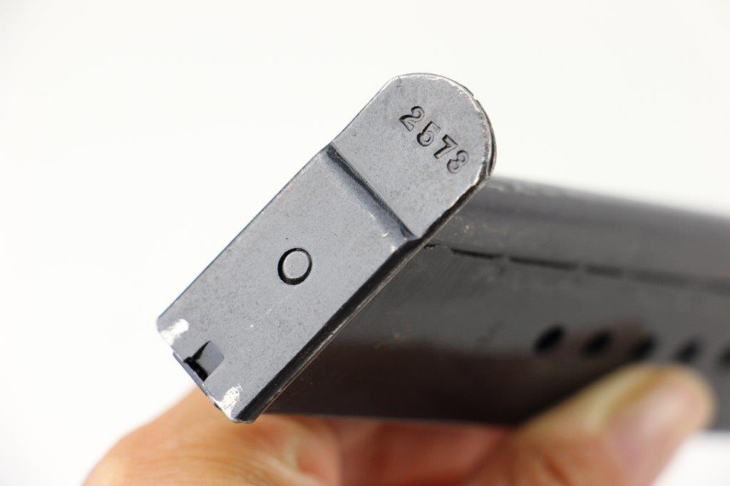 6/19/24 – This is an original WW2 production P.38 magazine by JVD. JVD was a subcontractor for P.38 magazines during WW2. This example is in great condition with minimal finish loss. Stamped “jvd” on the left side of the magazine tube. The base is serial numbered “2573”. The style of this numbering indicates this is most likely a police arsenal serial number, making this a great match for a Police P.38. The spring is strong and fully functional.