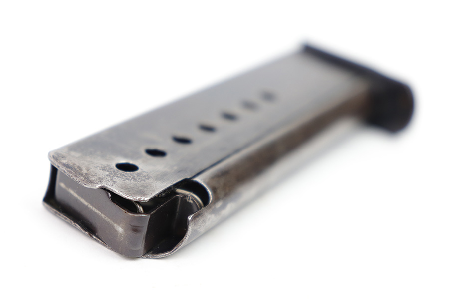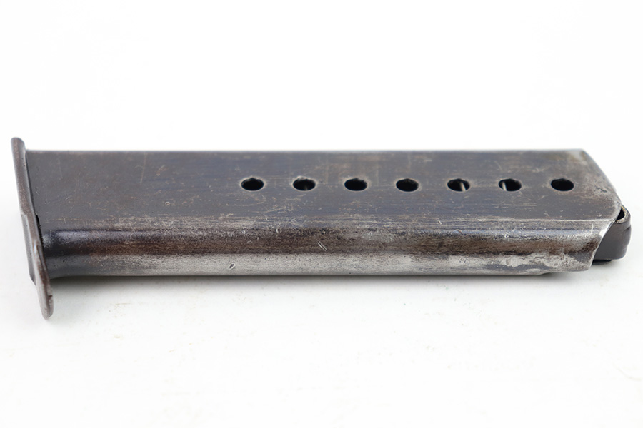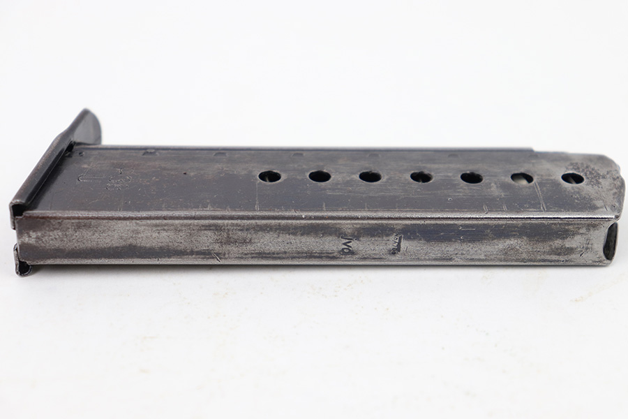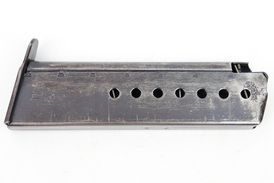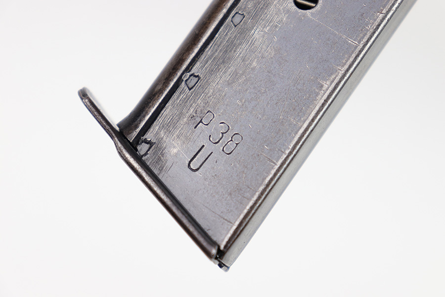 1/19/23 – This is an original late WW2 production P.38 magazine. The magazine is stamped “P.38 U” on the left side of the tube, which is an end-of-war production feature where they skipped the metal hardening process. The spine of the magazine is waffen proof stamped WaA706 with a “JVD” maker stamp (subcontractor during WW2). The magazine has dark surface patina and mild finish loss throughout, but there’s no rust or pitting. The spring is strong and fully functional.