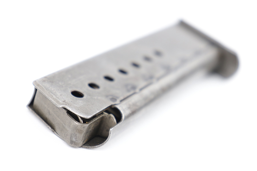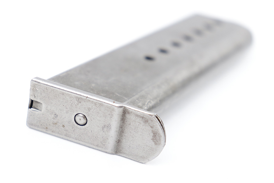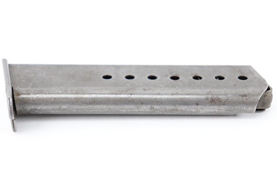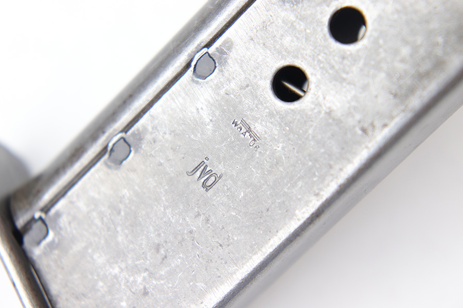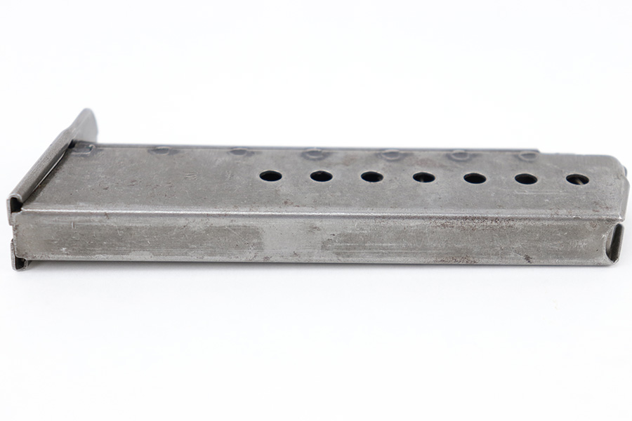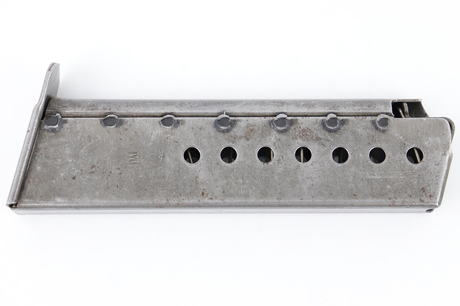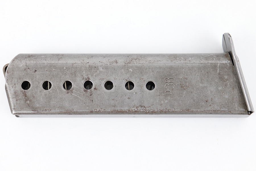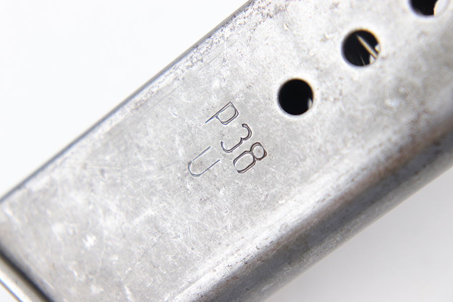 5/26/23 – This is an original late WW2 production P.38 magazine. The magazine is stamped on the right side of the tube, “P.38 U”. The metal on this magazine is unhardened – a step skipped during late war production. This example is missing most of the original finish and has a dark grey / steel color with light surface patina. There is no rust or pitting, and the spring is strong and fully functional.