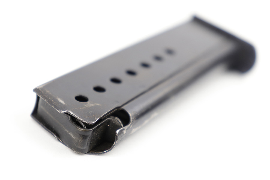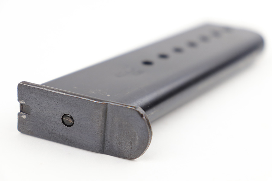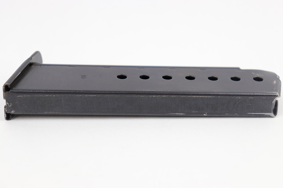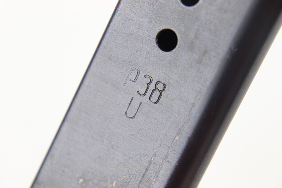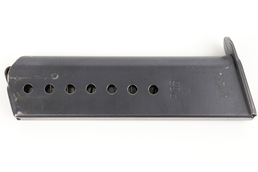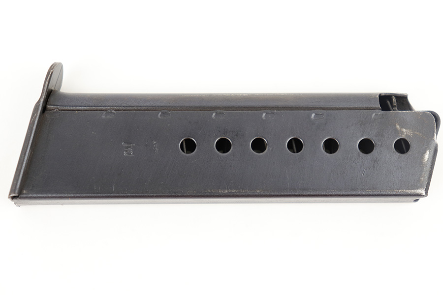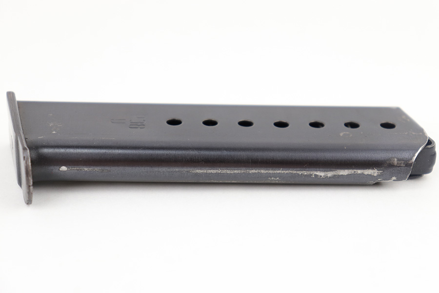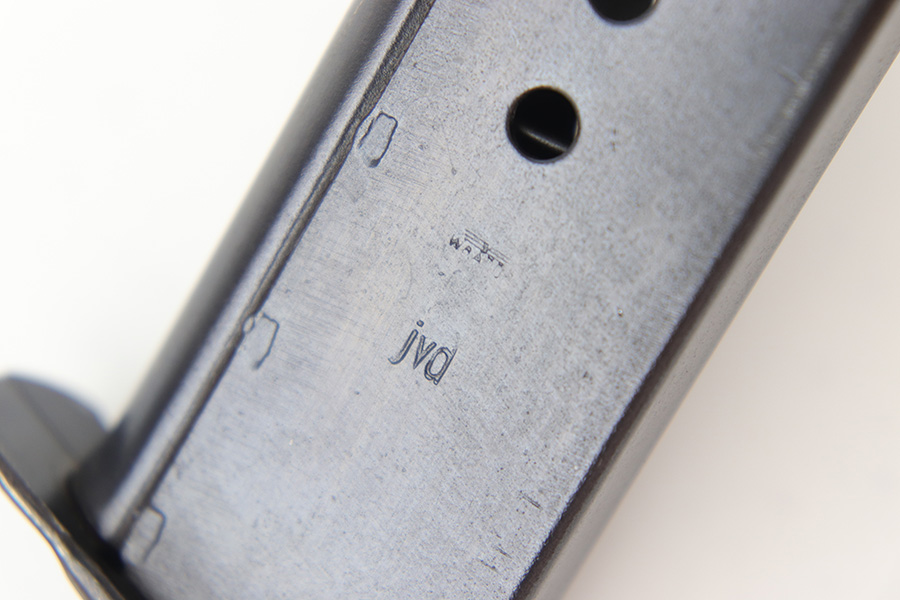 7/17/23 – This is a late WW2 production P.38 magazine by JVD. The magazine is in excellent overall condition with all original finish and only some very mild surface patina. The left side of the tube is “JVD” stamped and waffen military proof stamped. The right side of the tube is “P.38 U” stamped. The spring is strong and fully functional.