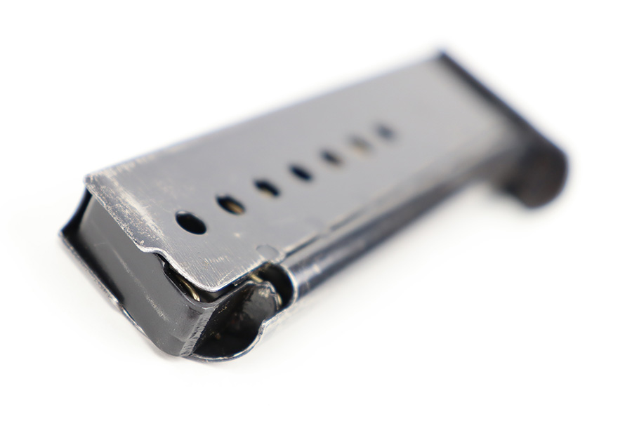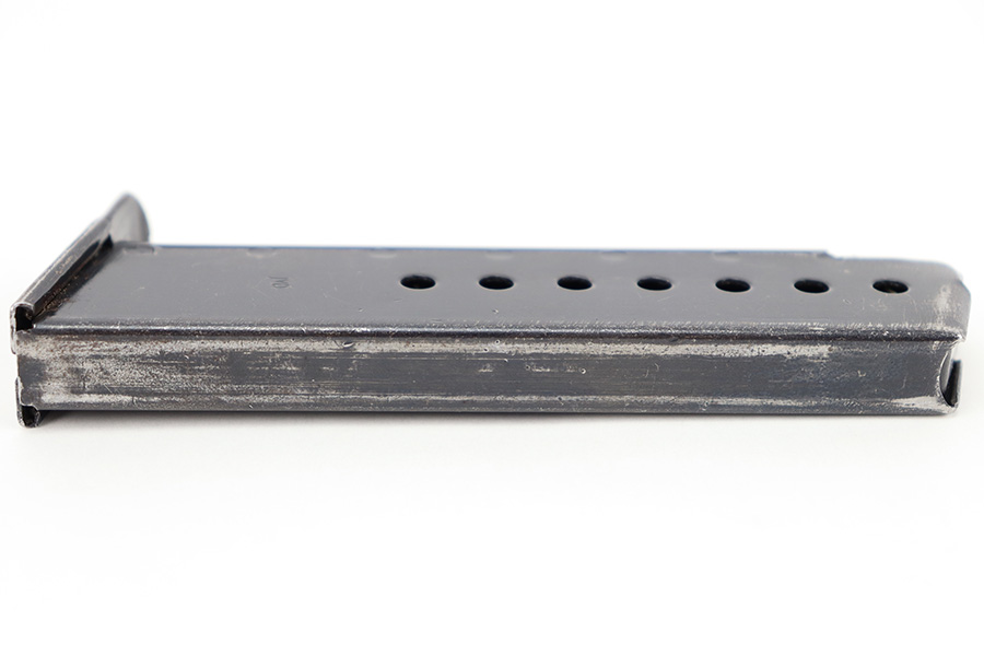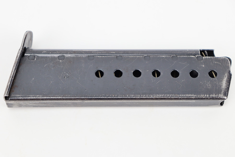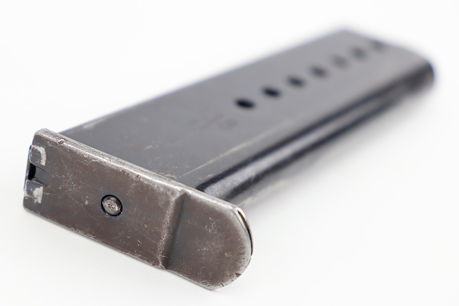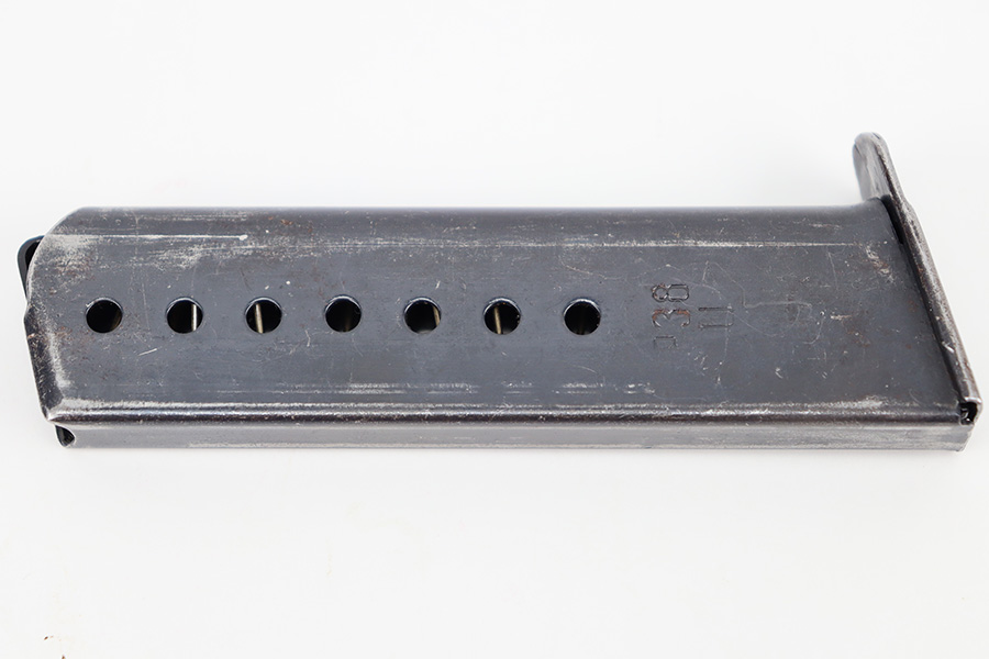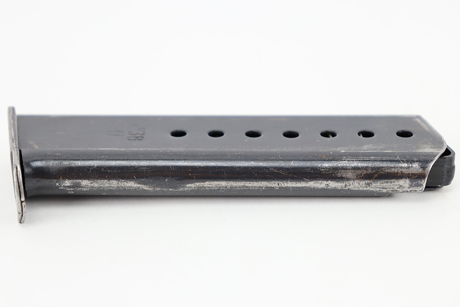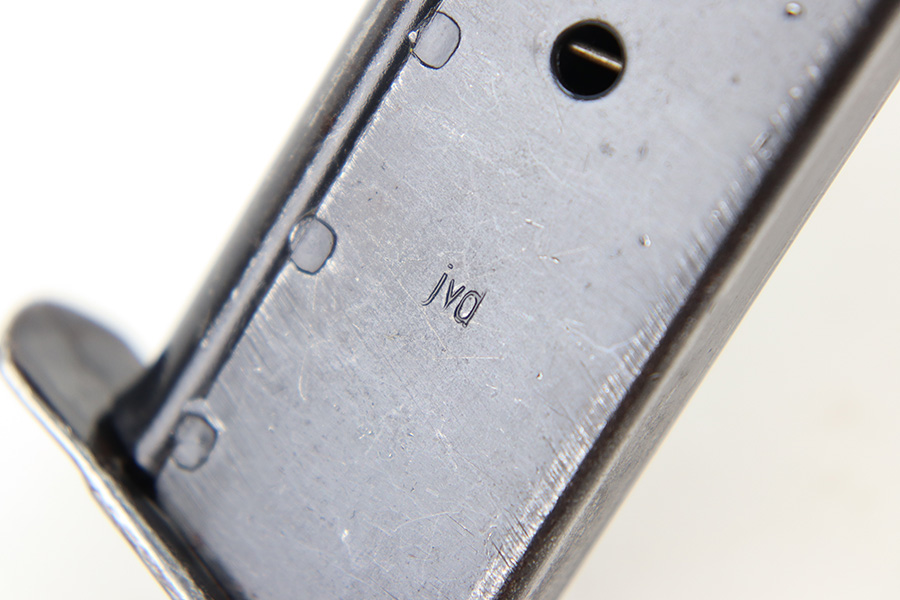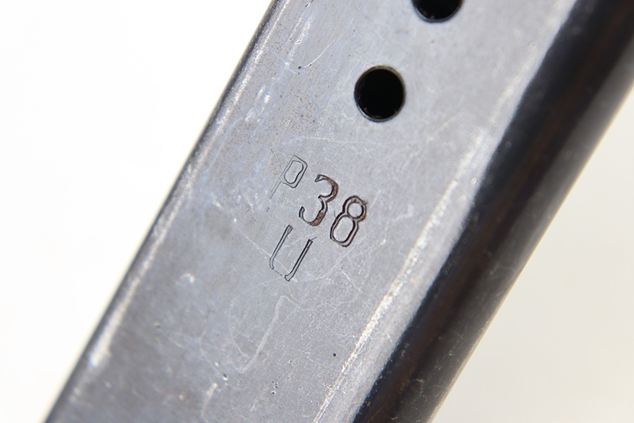 12/11/23 – This is an original, late WW2 production P.38 magazine. The magazine is in near-excellent condition with most of the original finish intact, and a fully functional spring. The left side of the tube is “jvd” stamped and the right side is P.38 U stamped. No visible proofs on the spine. Strong, functional spring. Great for any late-war P.38!