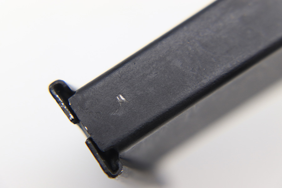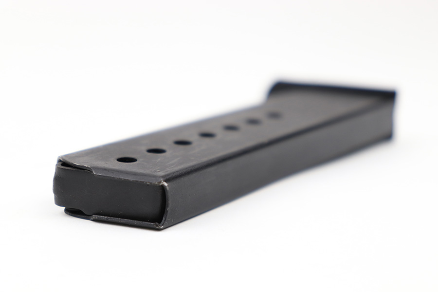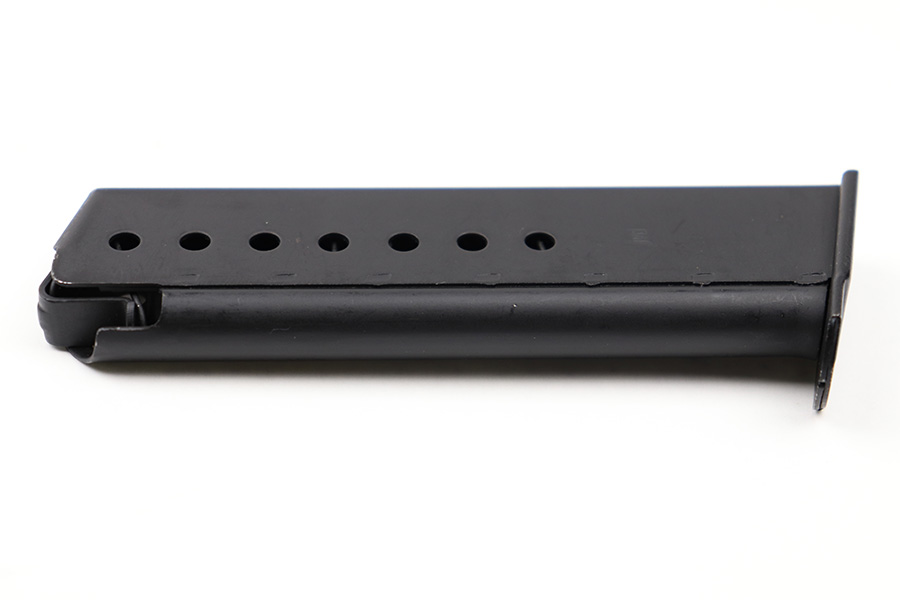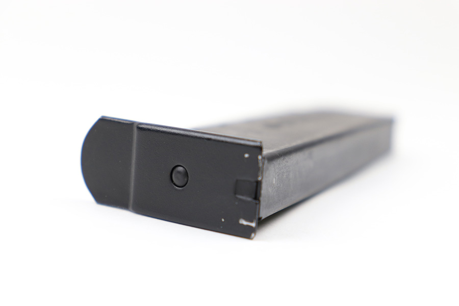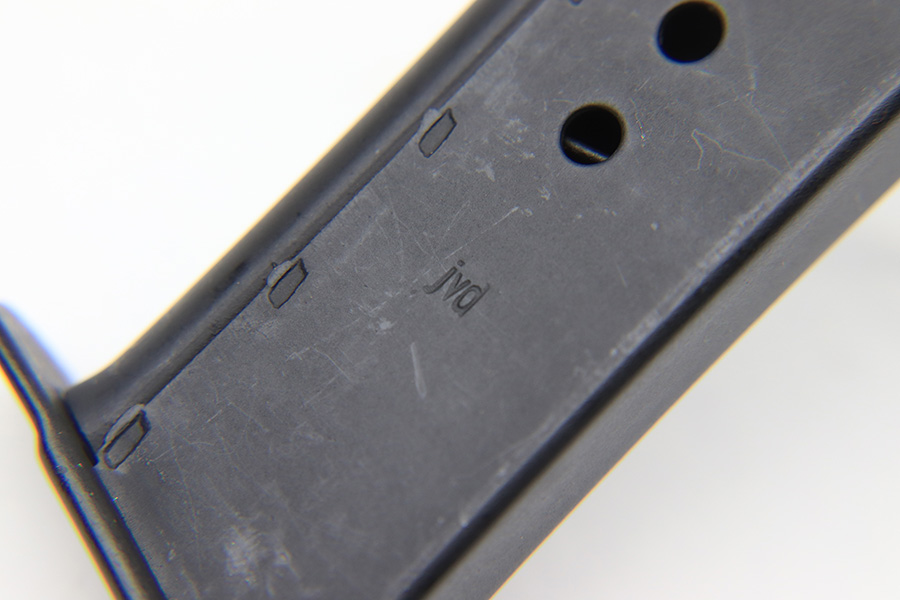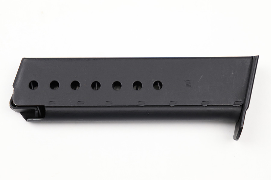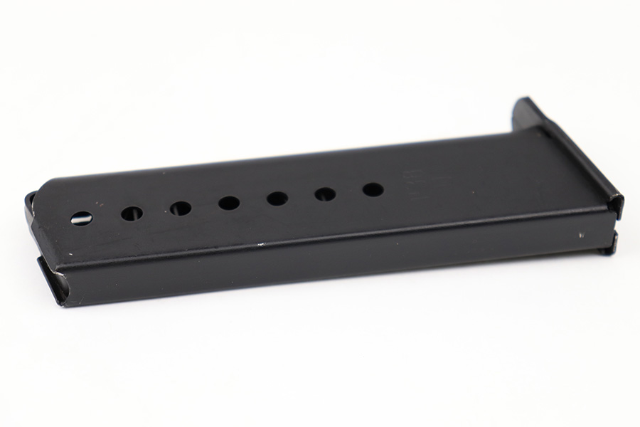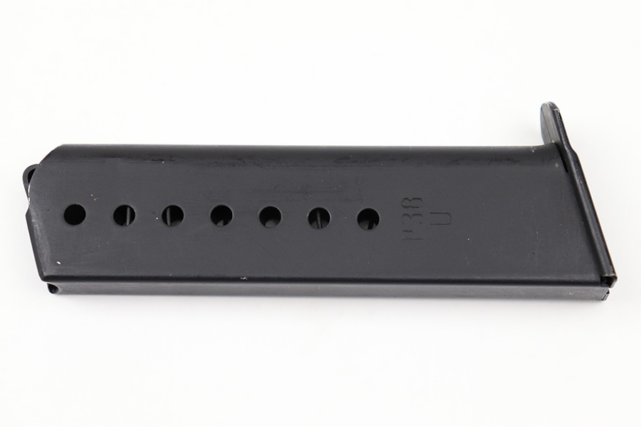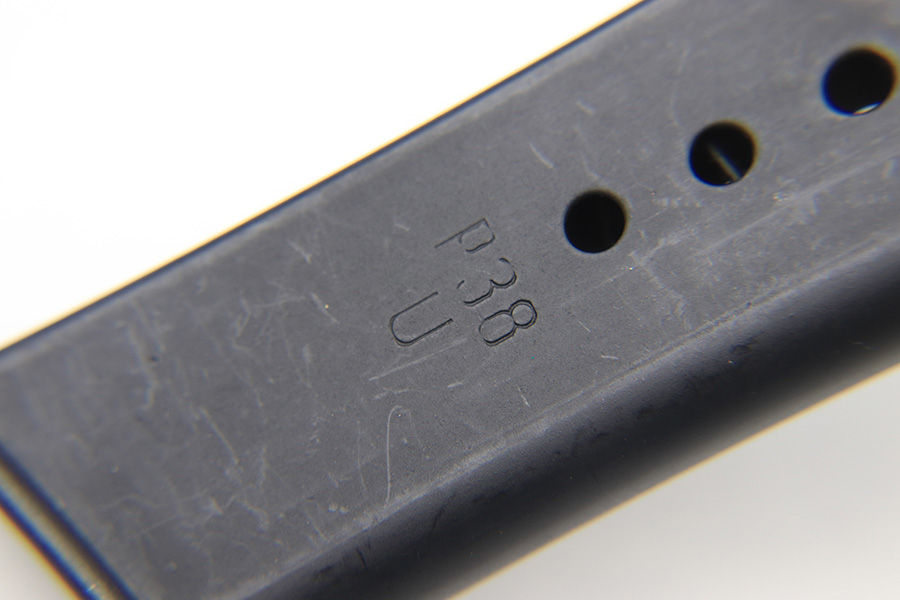 7/19/22 – This is an original late WW2 production P.38 magazine. The magazine tube is maker stamped “jvd” on one side, and “P.38 U” on the other. The P.38 U stamp was only used later during the war as the metal hardening step was taken out of production. The magazine also has a late war ribbed follower. Unfortunately, the magazine has been re-blued. Price reduced accordingly. The spring is strong and functional.