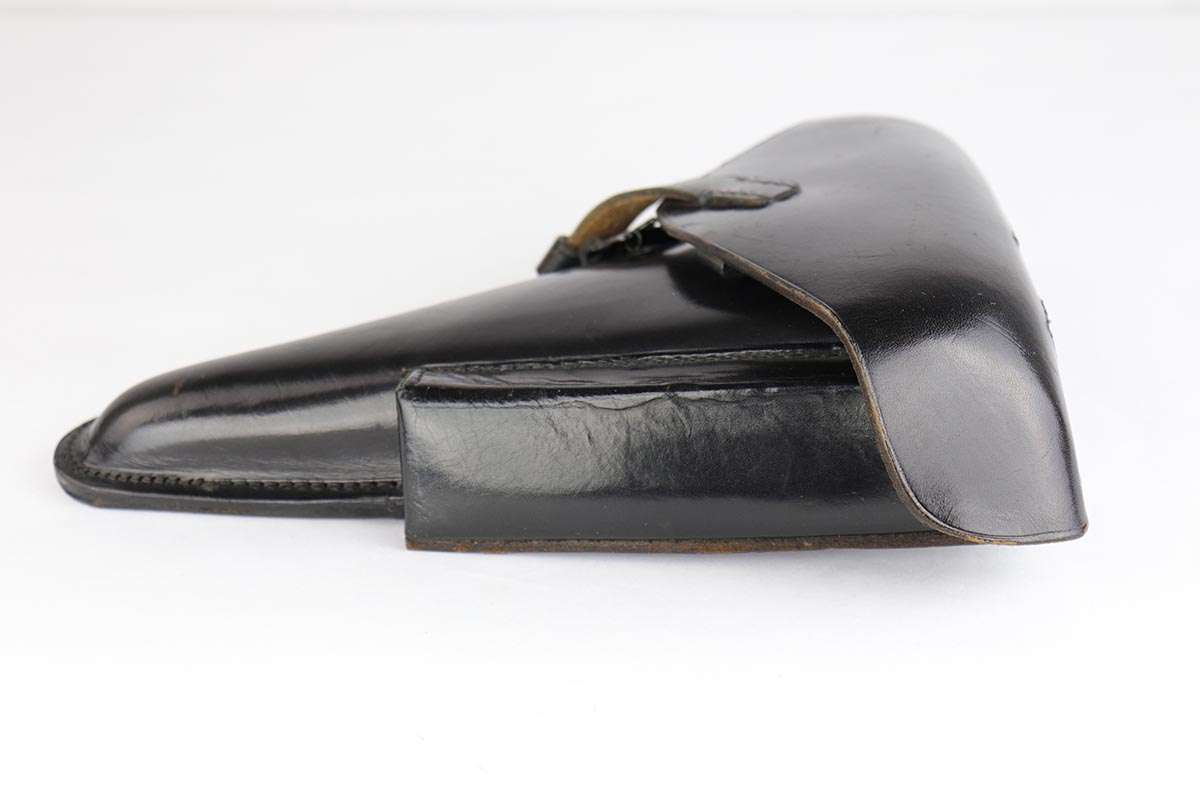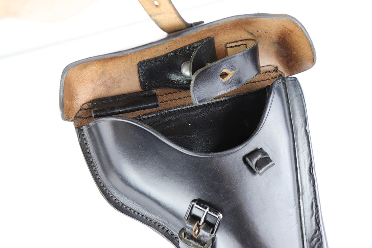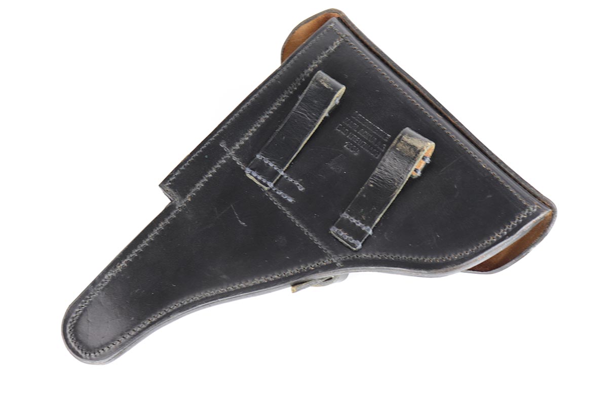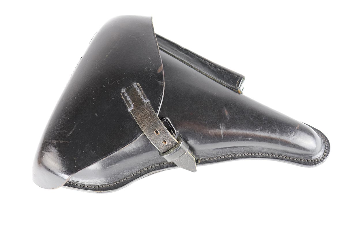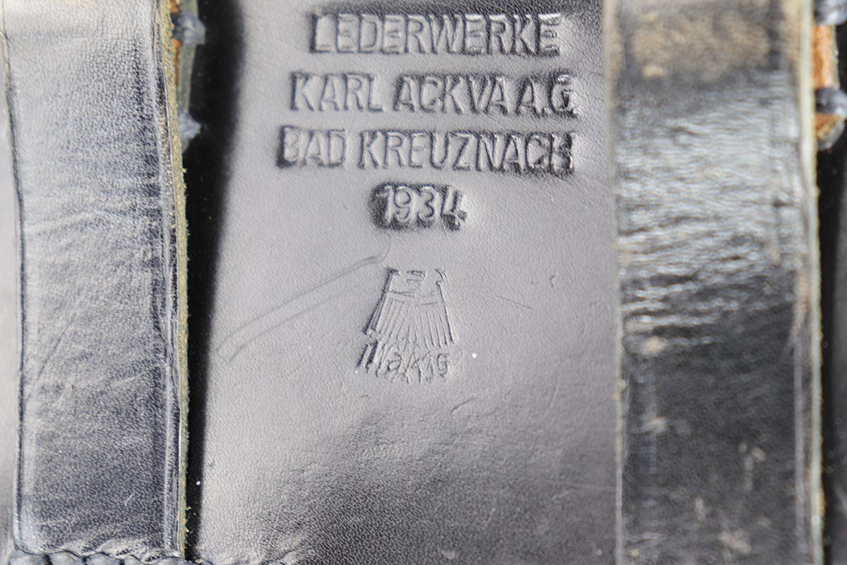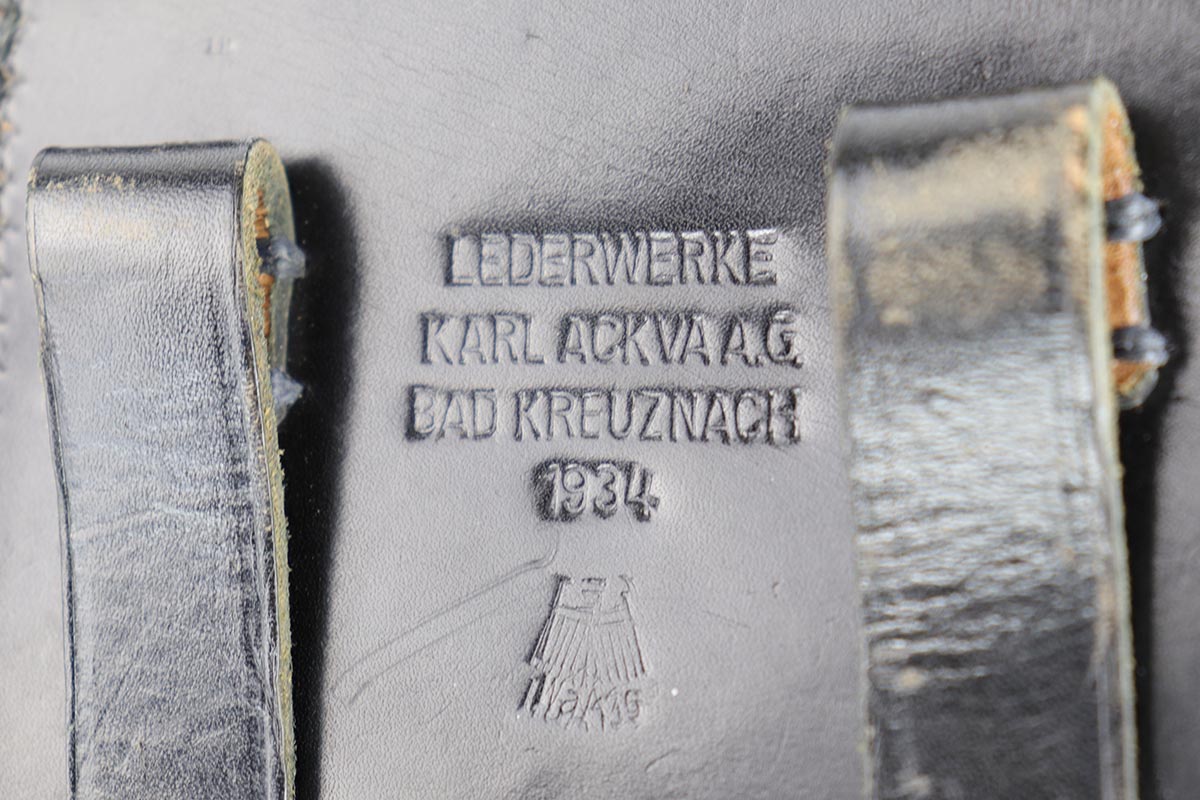 4/26/19 – This is a scarce K Date Luger holster, made in 1934 by Karl Ackva AG. It is the finest example we have encountered in the history of the company. The back is 1934 dated with Eagle over WaA35 proof. It is also marked ‘LEDERWERKE KARL ACKVA A.G. BAD KREUZNACH’. The holster is mint, and likely was never issued. All correct and original, simply cannot be upgraded.