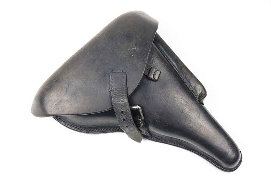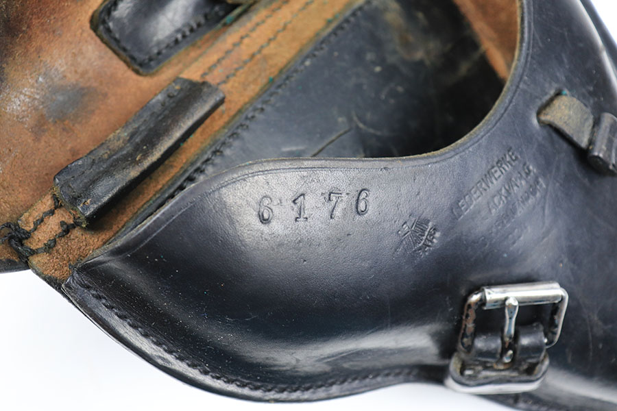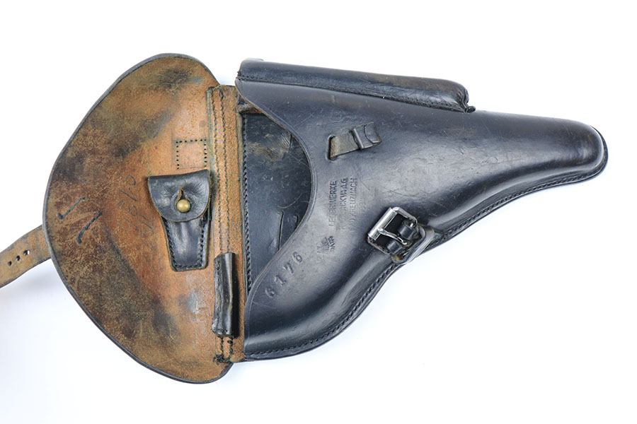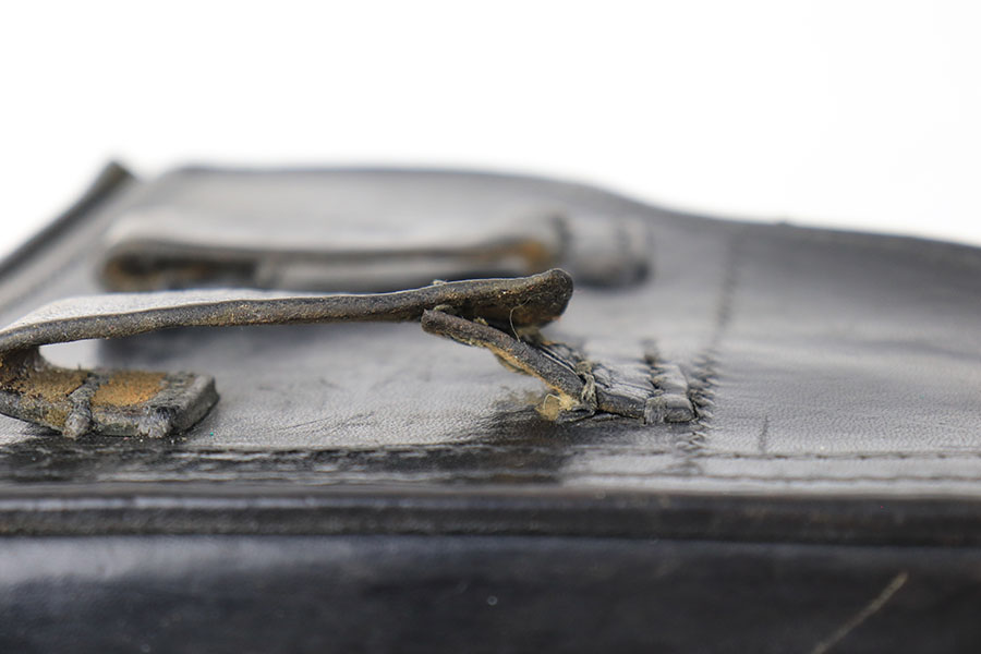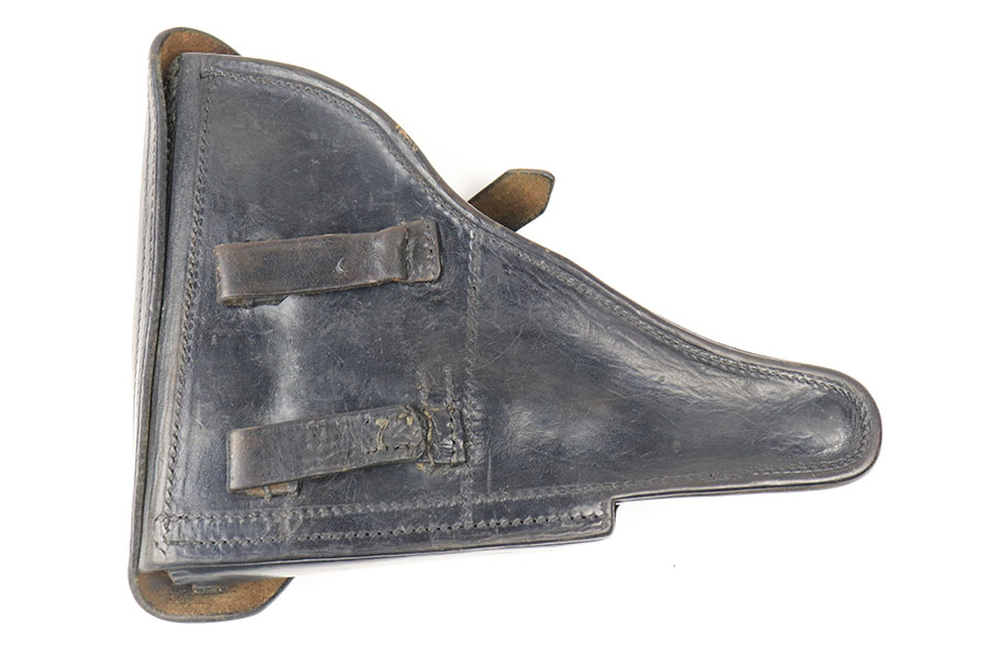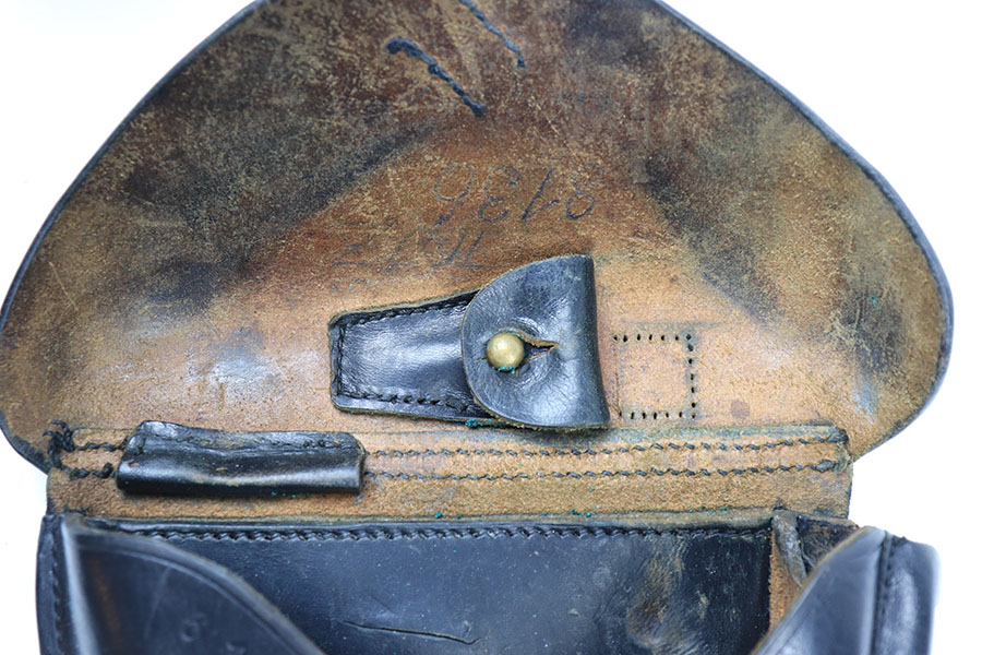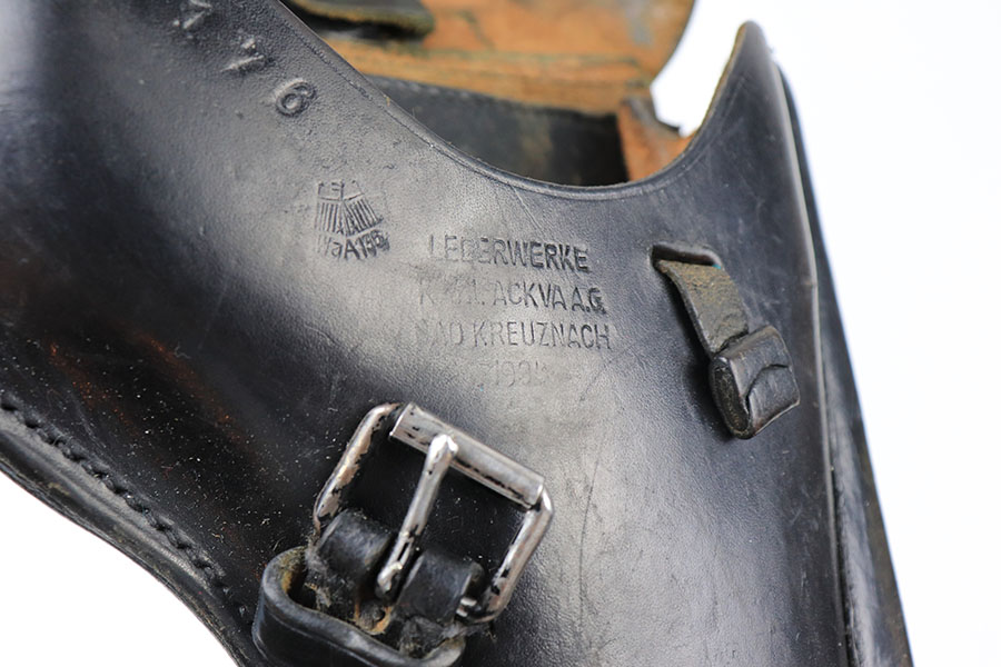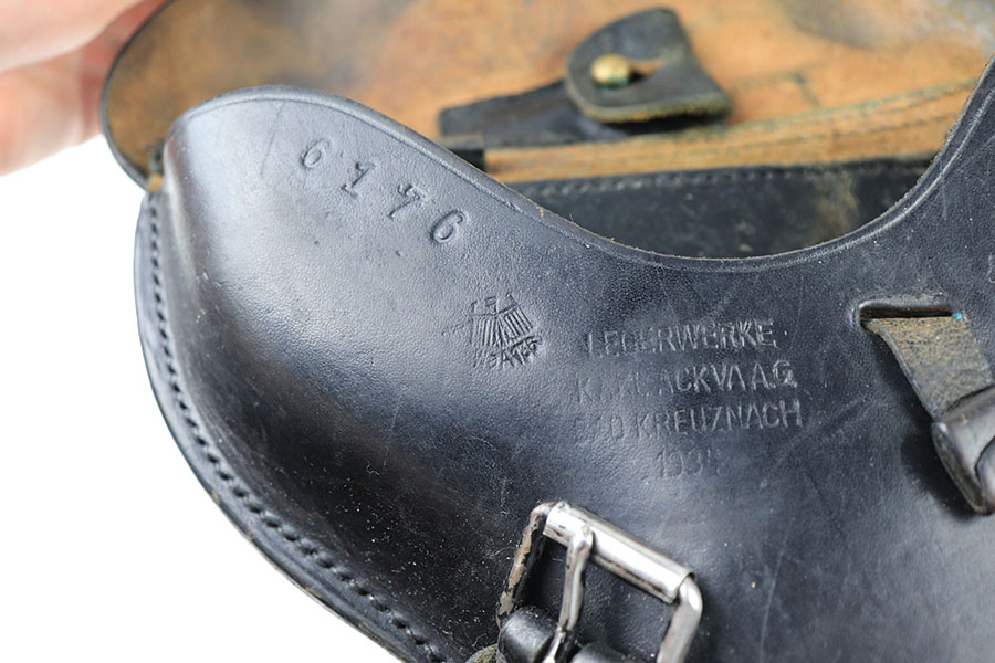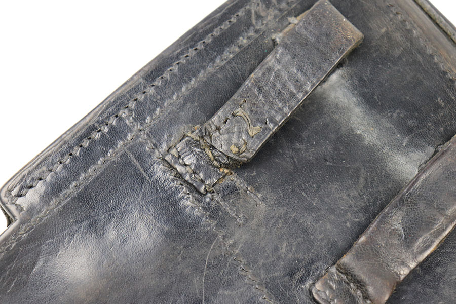 7/5/23 – This is an original 1934 dated K Date Luger holster. The holster is maker stamped, dated, and waffen proof stamped on the front leather, as shown. The black leather has normal pliability and is in great overall condition. The downside to this holster is the luger cleaning rod pouch is missing, and the back belt loop appears to be repaired (see photos). The stitching is otherwise in great shape. Priced accordingly.