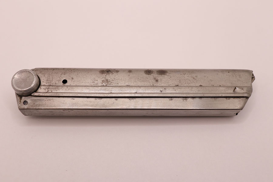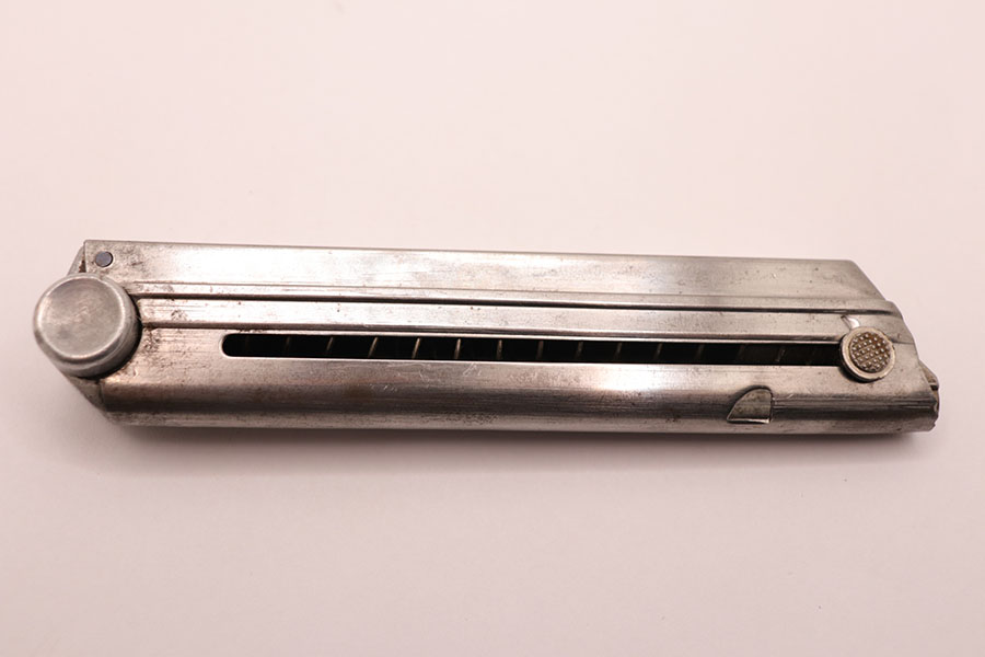 12/30/22 – This is an original K Date Luger magazine. The base is B/90 proof stamped. Very good condition overall with minimal wear. Excellent, strong spring. The base is serial numbered “9216” with an “t” letter suffix, and B/90 proof. Very rare and collectible magazine.