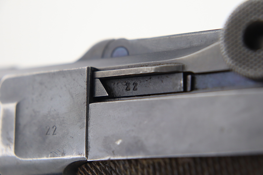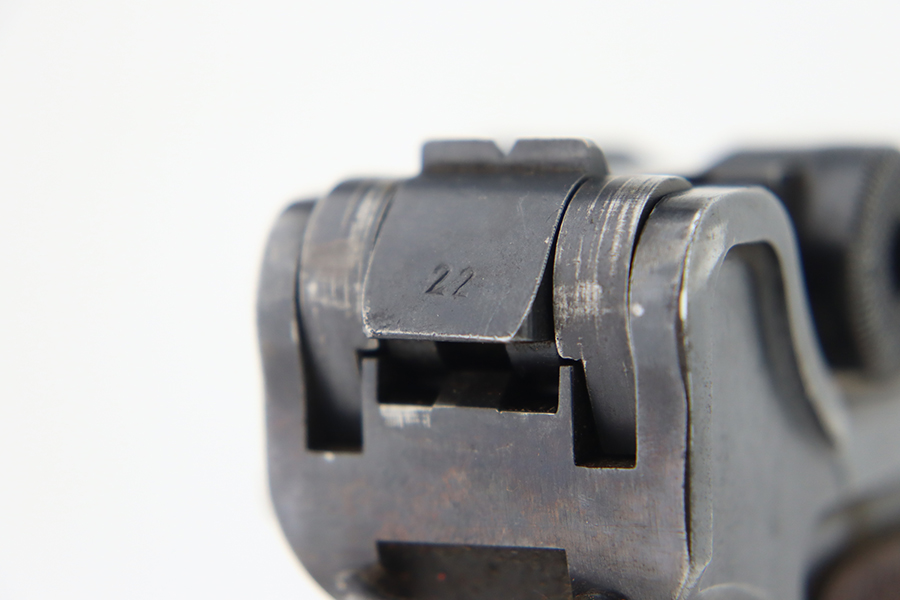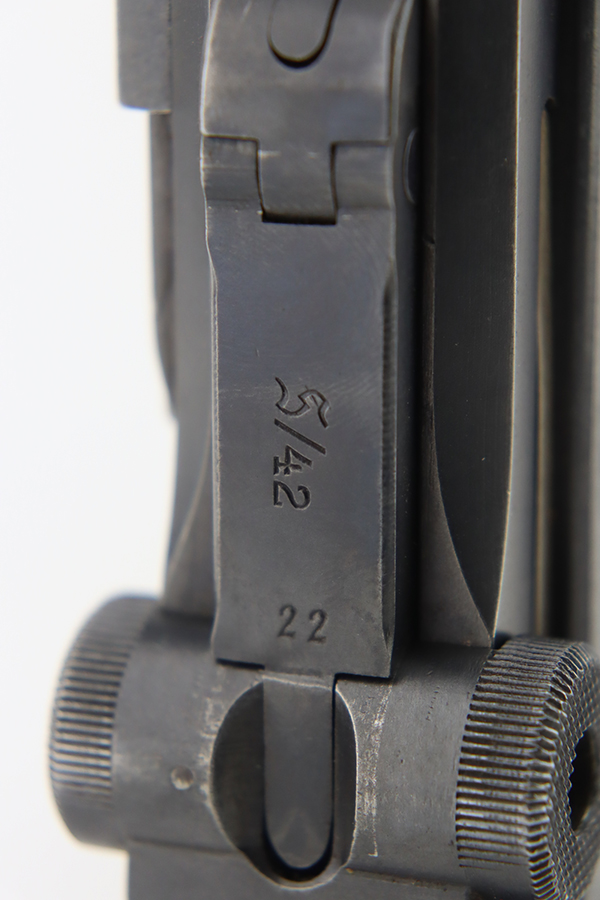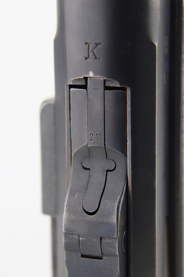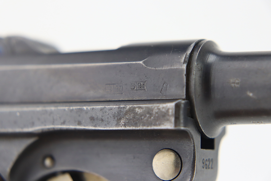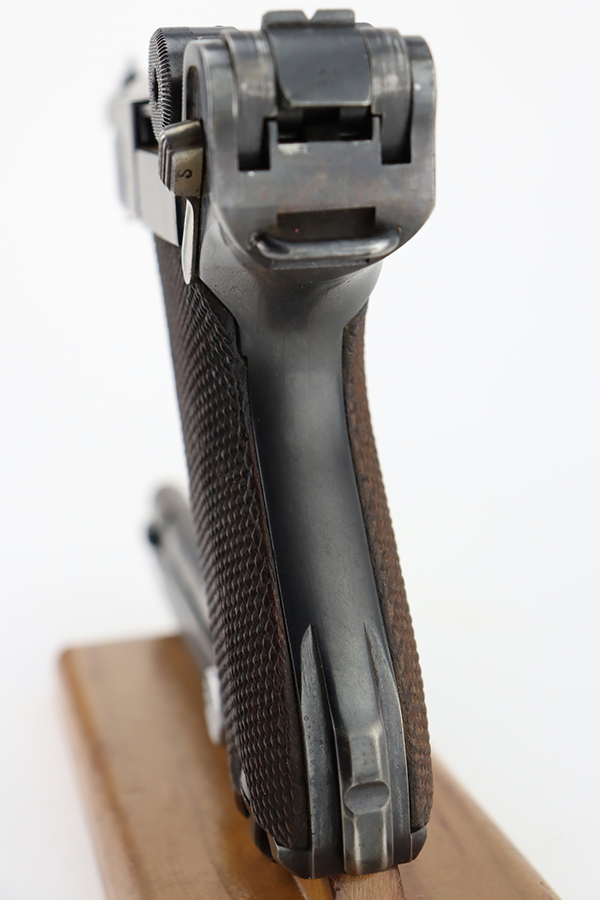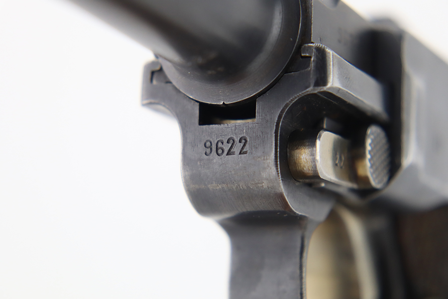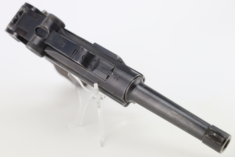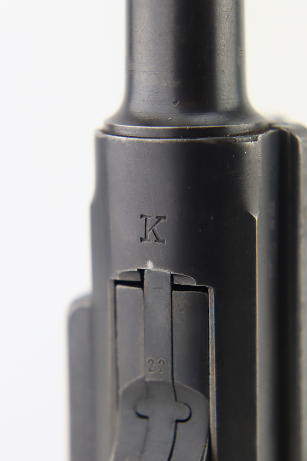 1/22/24 – This is a K Date Mauser Luger issued to the Nazi military in 1934. It is all matching except for the rear toggle pin. Its original finish rates about 95-9% with minor wear around the high edges and around the muzzle. Fitted with excellent un-numbered wood grips and comes with a mismatched “Eagle 83” proofed magazine. Very nice bore with good rifling.