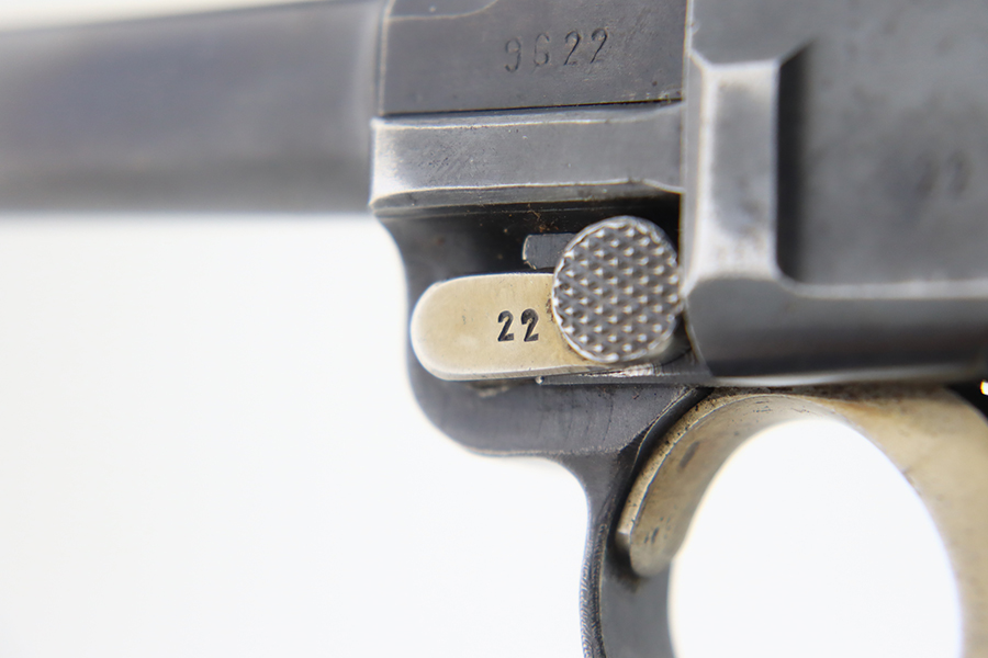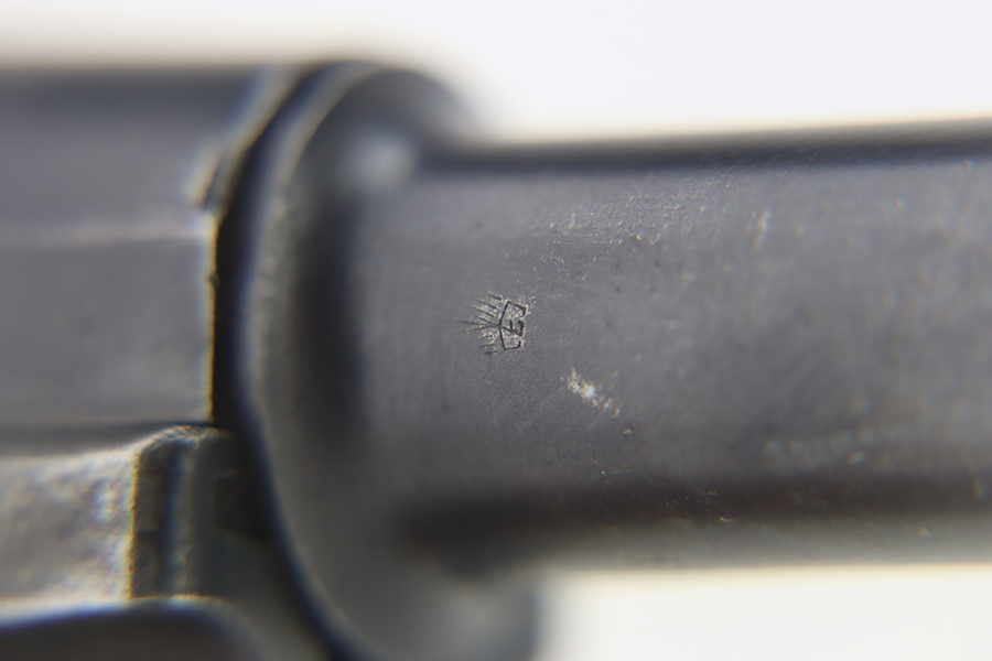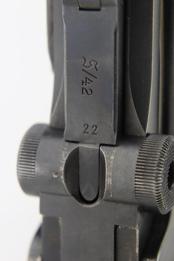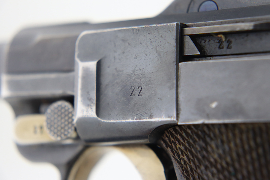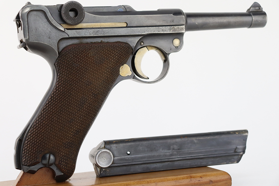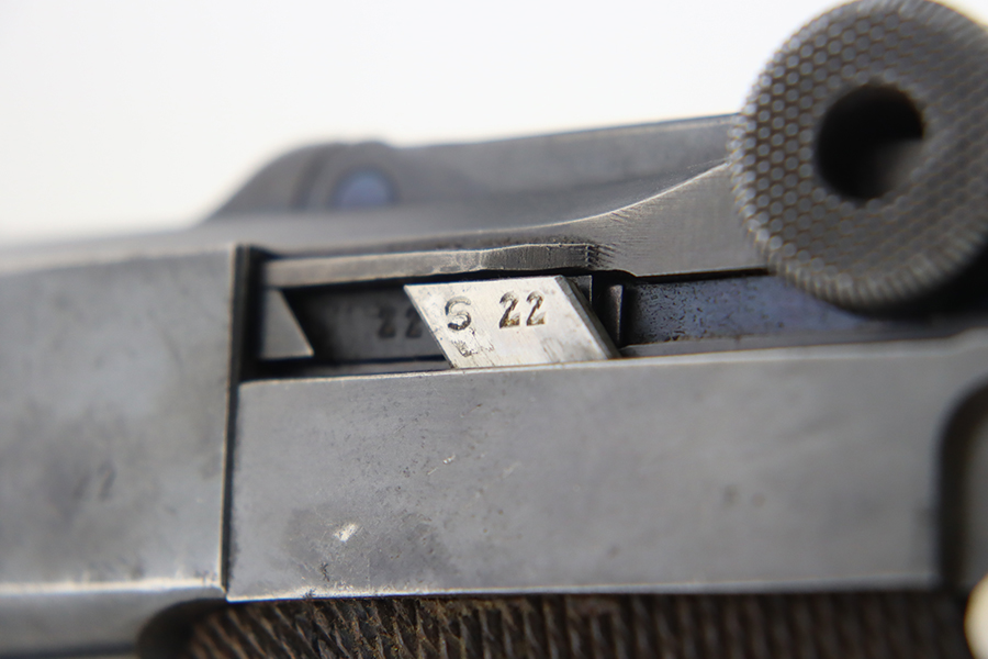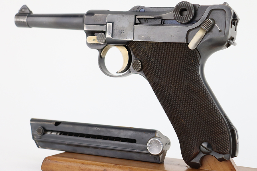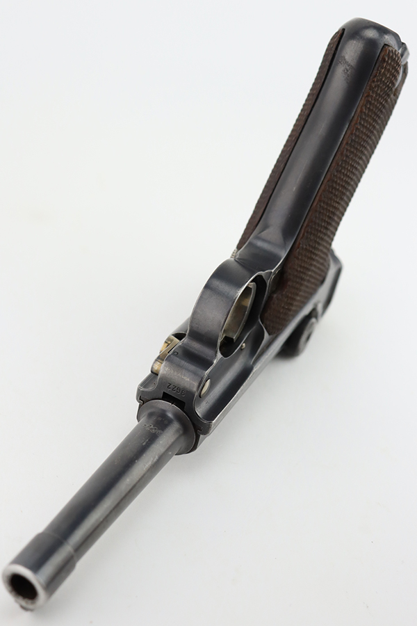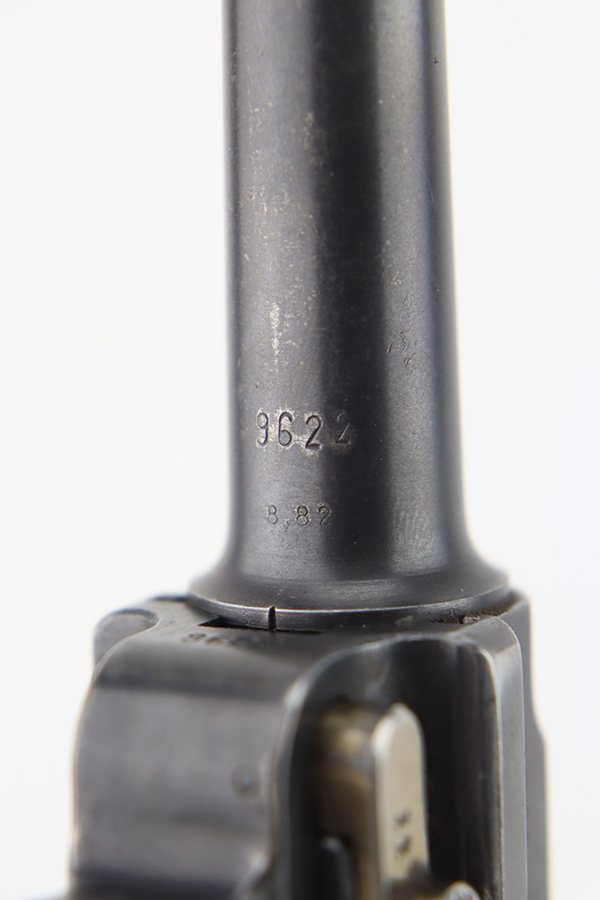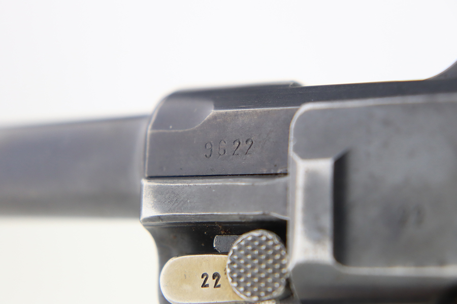 1/22/24 – This is a K Date Mauser Luger issued to the Nazi military in 1934. It is all matching except for the rear toggle pin. Its original finish rates about 95-9% with minor wear around the high edges and around the muzzle. Fitted with excellent un-numbered wood grips and comes with a mismatched “Eagle 83” proofed magazine. Very nice bore with good rifling.