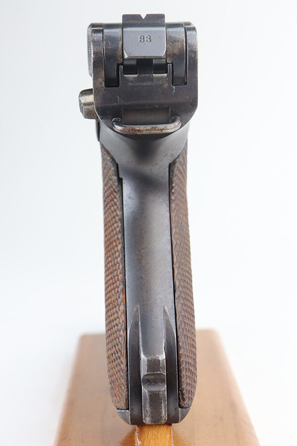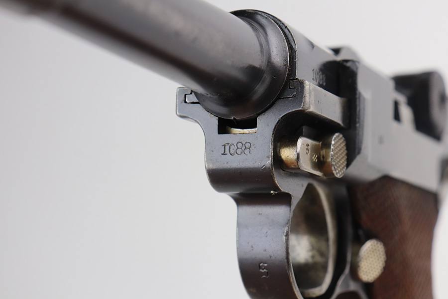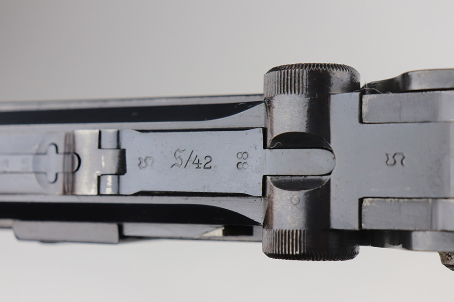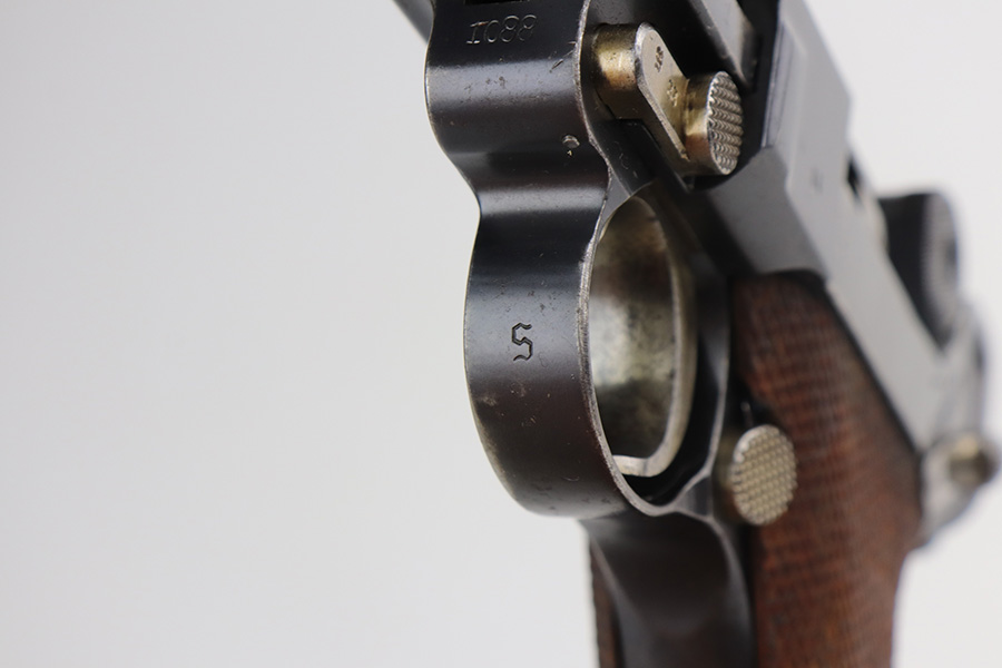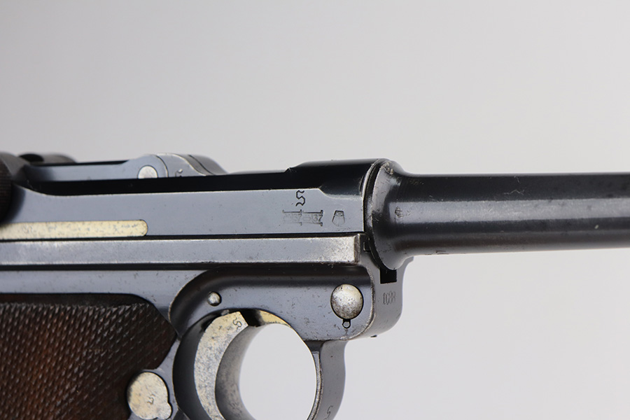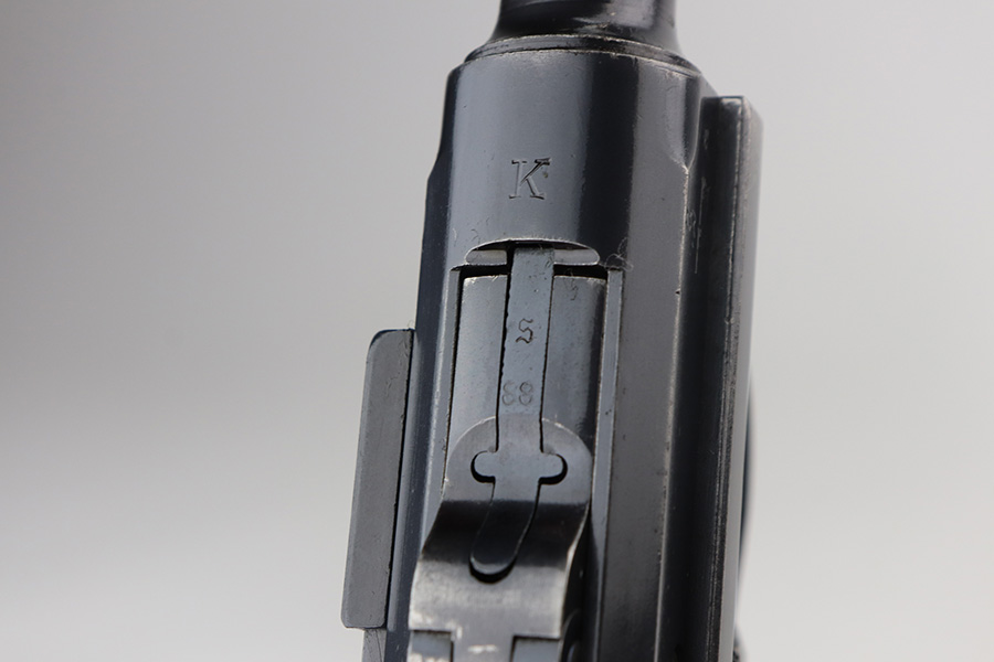 6/14/21 – This is a very nice example of a rare “K Date” Mauser Luger issued to the Nazi military in 1934. It is mostly matching, has the proper K Date military proofs throughout, and has the proper “S/42” Mauser factory code. We believe the side plate has been refinished. The rear toggle pin is not numbered. The hold open is not numbered or “S” proofed. So some parts have been replaced. The gun has retained somewhere between 85-90% of its original finish. There is very minor thinning on the straps and areas of minor wear on the left side of the frame, side plate, side rails, on the barrel, and around the muzzle. Spotty oxidation throughout, most noticeable on the straps, left side of the frame, and on the barrel. Comes with excellent matching grips and a period-correct K Date magazine that is mismatched to the gun. Excellent, shiny bore with strong rifling and some areas of minor freckling.