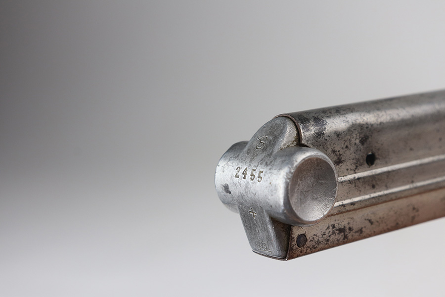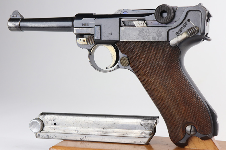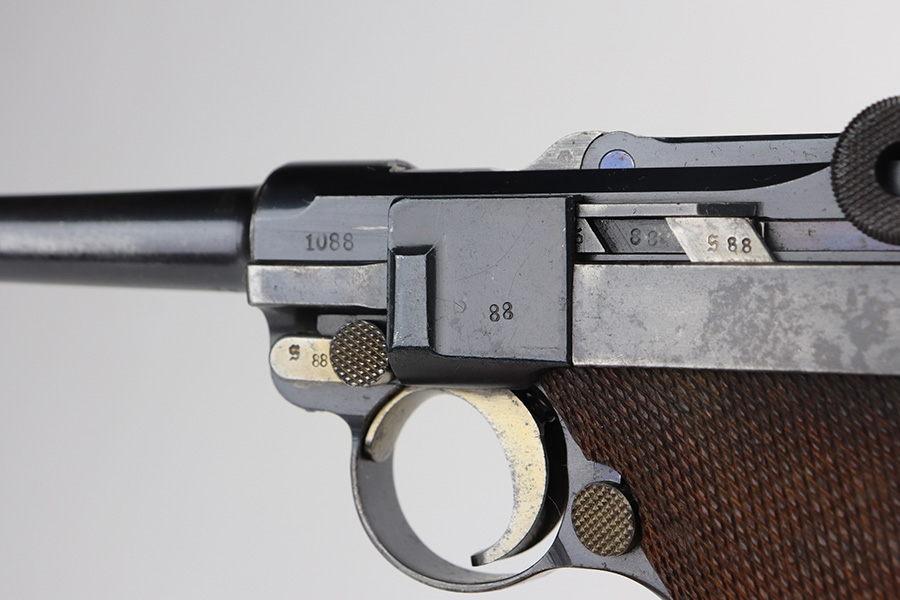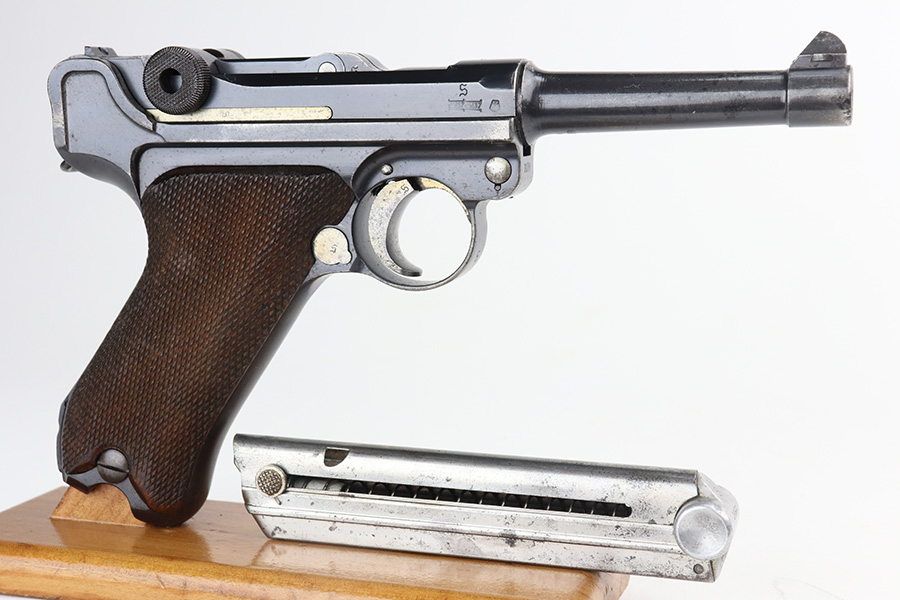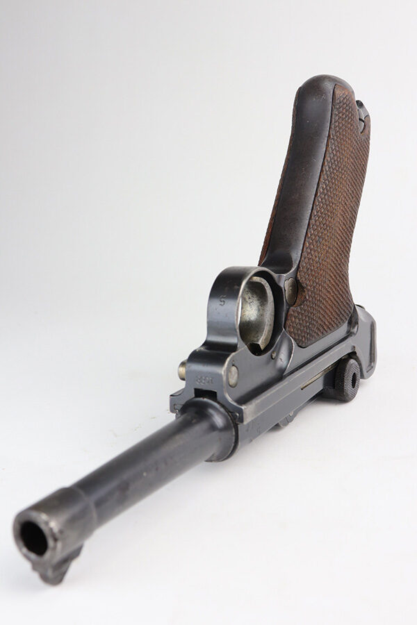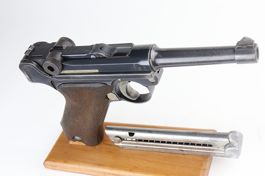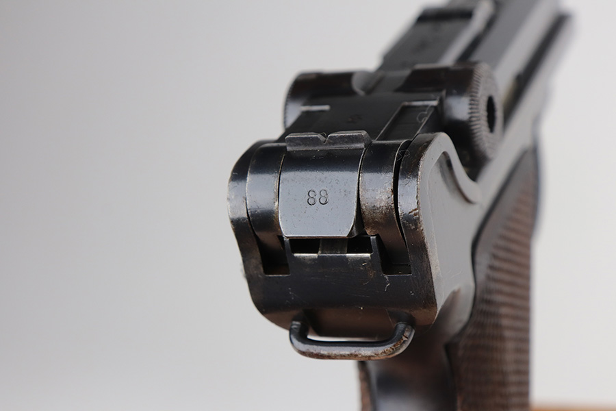 6/14/21 – This is a very nice example of a rare “K Date” Mauser Luger issued to the Nazi military in 1934. It is mostly matching, has the proper K Date military proofs throughout, and has the proper “S/42” Mauser factory code. We believe the side plate has been refinished. The rear toggle pin is not numbered. The hold open is not numbered or “S” proofed. So some parts have been replaced. The gun has retained somewhere between 85-90% of its original finish. There is very minor thinning on the straps and areas of minor wear on the left side of the frame, side plate, side rails, on the barrel, and around the muzzle. Spotty oxidation throughout, most noticeable on the straps, left side of the frame, and on the barrel. Comes with excellent matching grips and a period-correct K Date magazine that is mismatched to the gun. Excellent, shiny bore with strong rifling and some areas of minor freckling.
