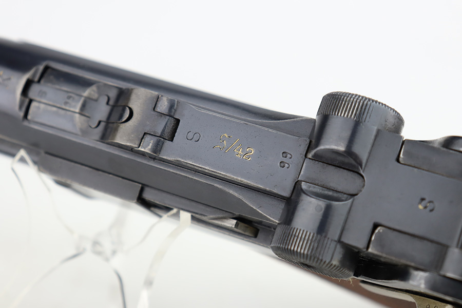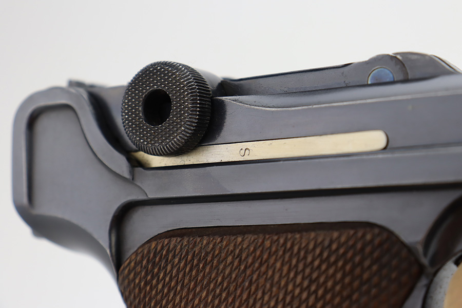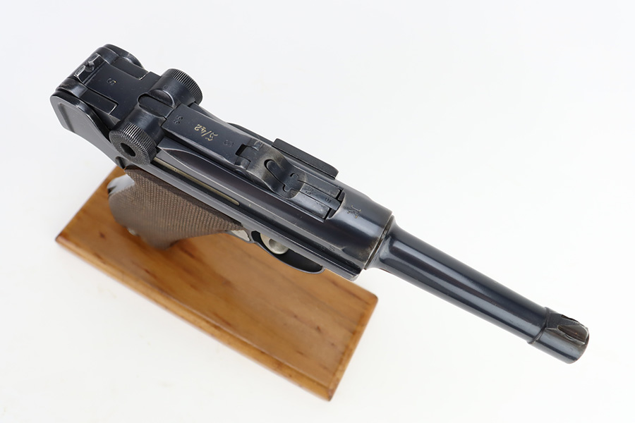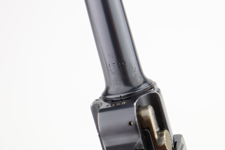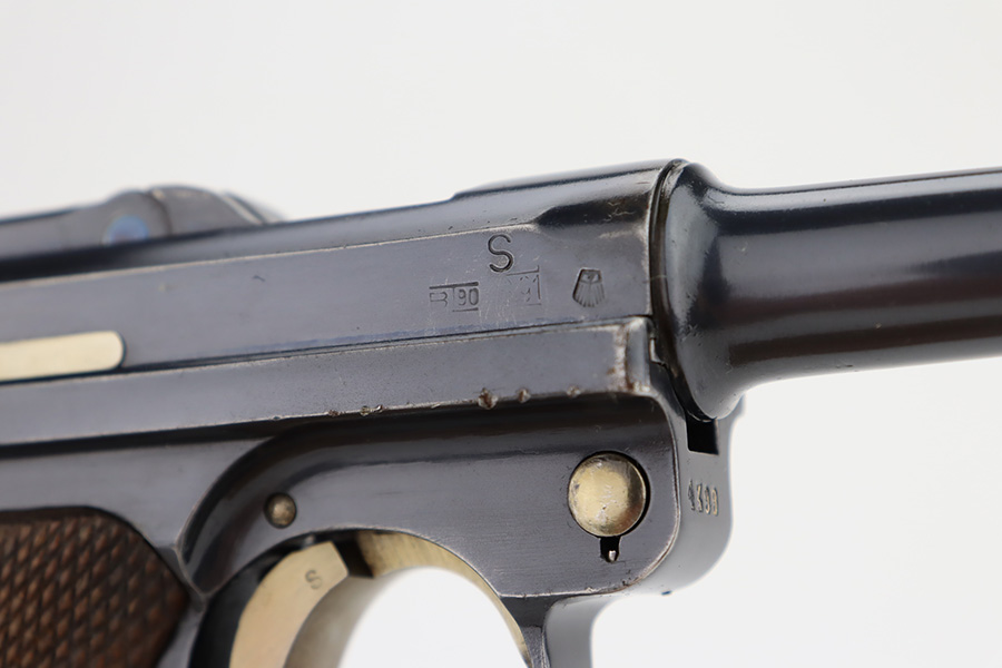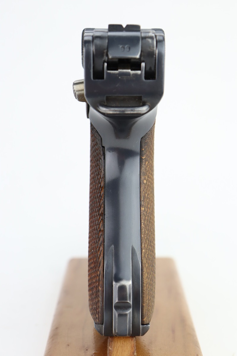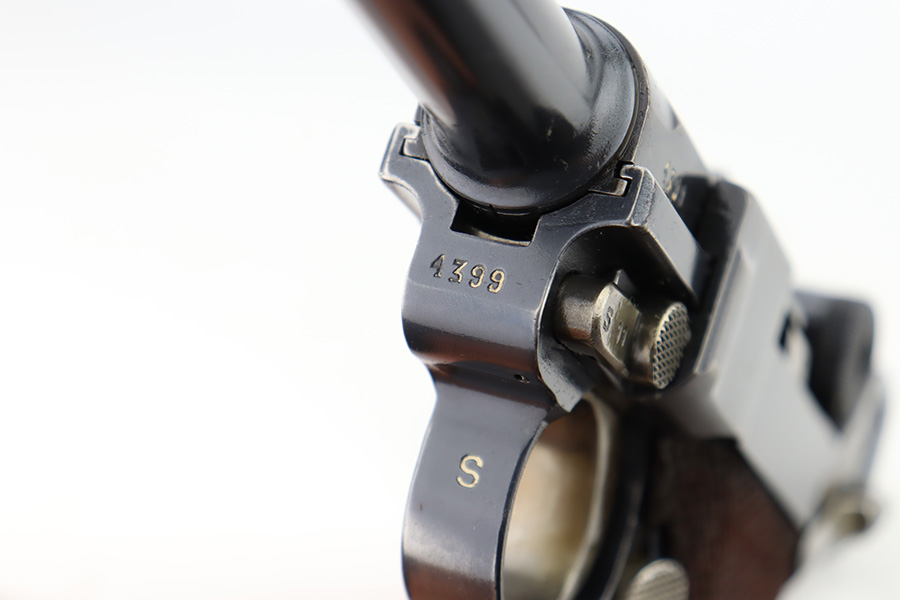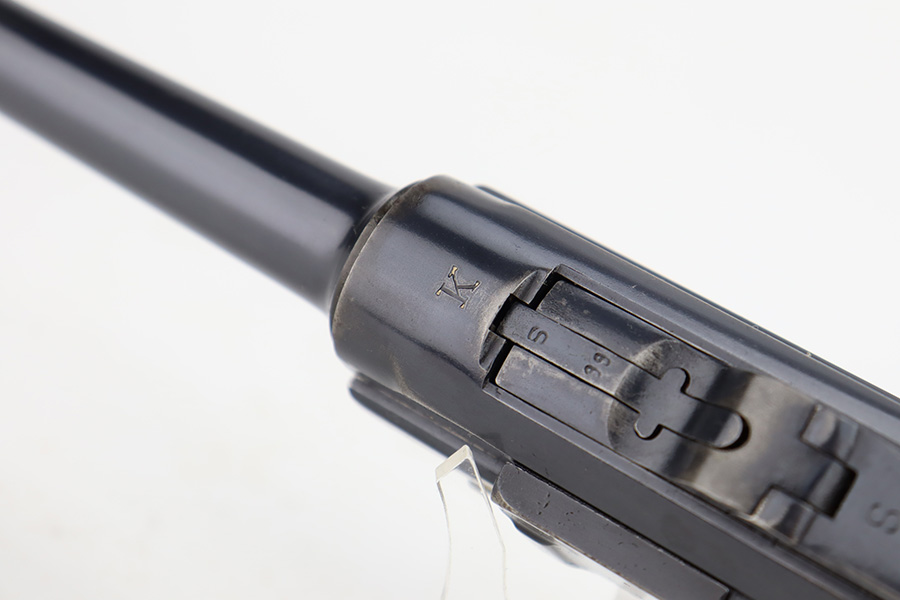 12/1/23 – This is a K Date Mauser Luger issued to the German military in 1934. All matching with the proper K Date military acceptance proofs and “S” proofs throughout. The finish rates about 97%, but we believe it has an old re-blued finish. Fitted with excellent matching-numbered wood grips. Comes with a matching-numbered magazine that has been force-matched. The bore is poor with obvious pitting throughout.
