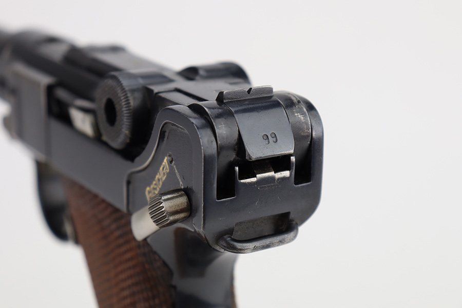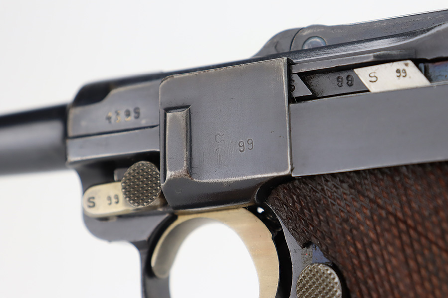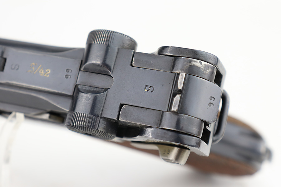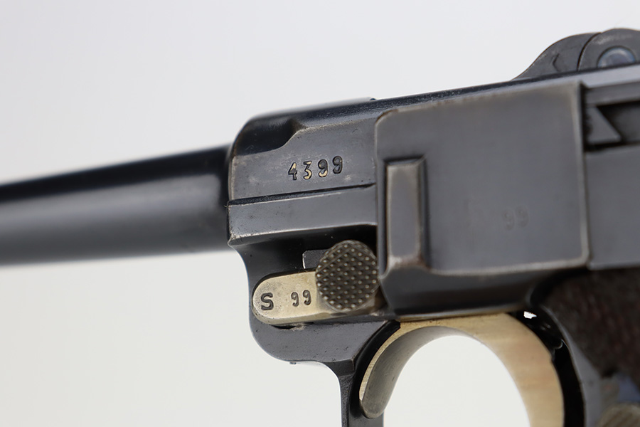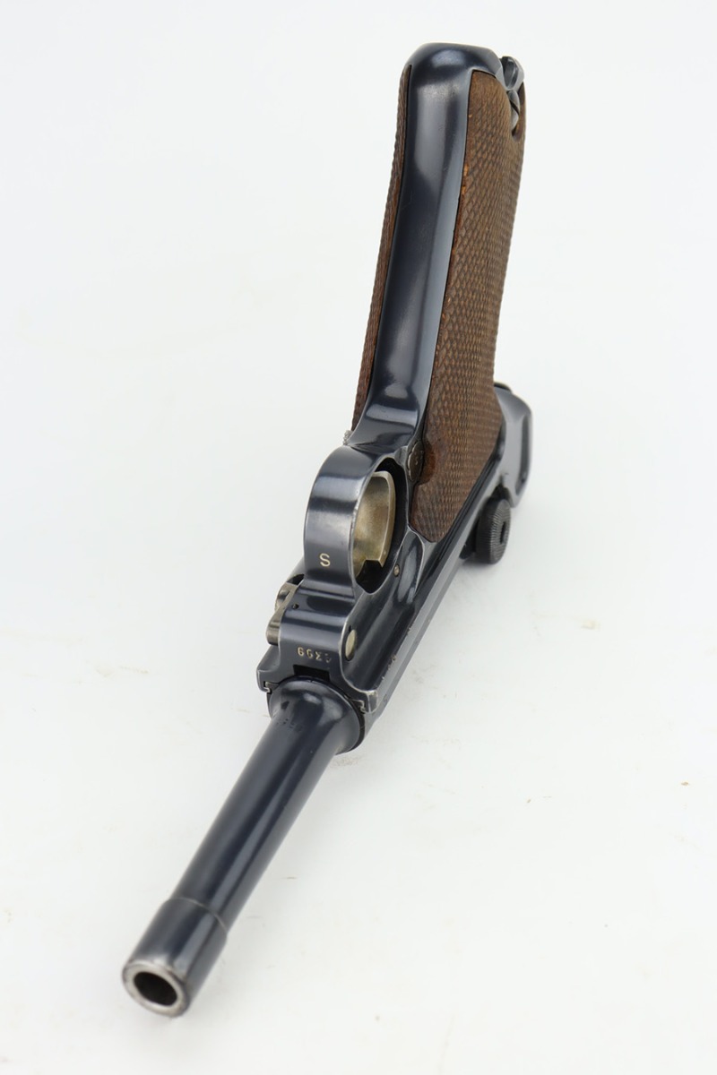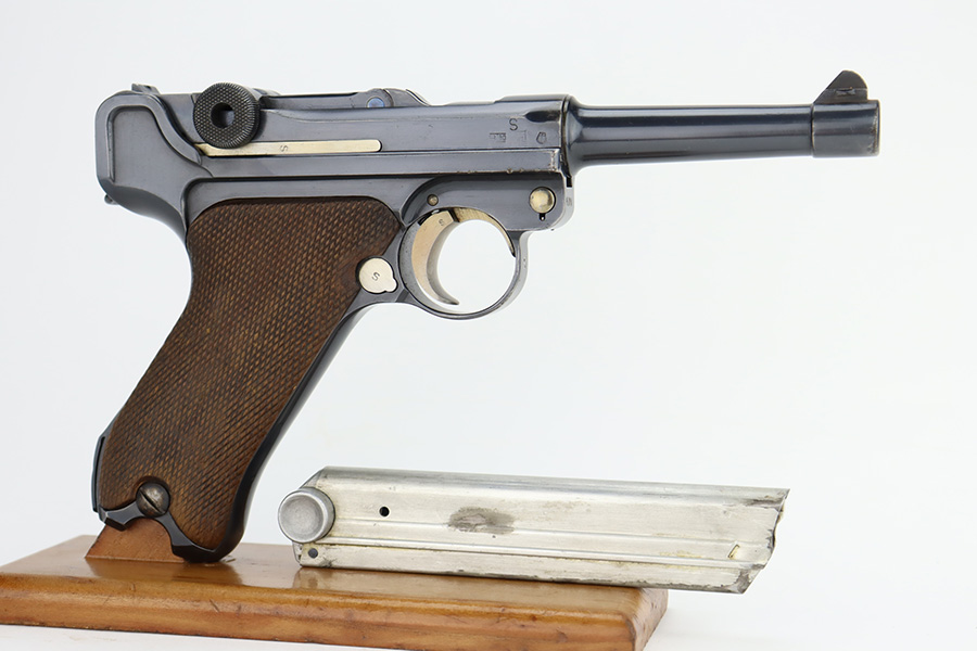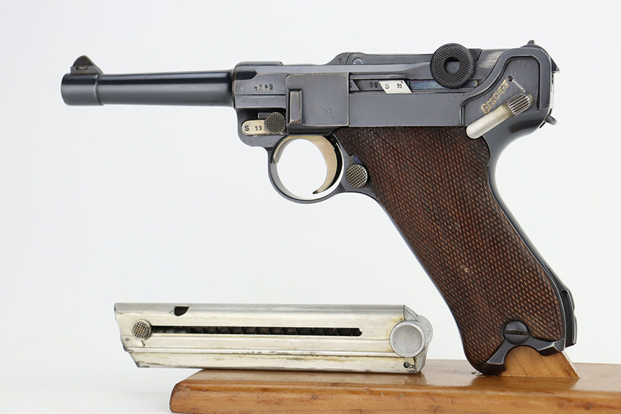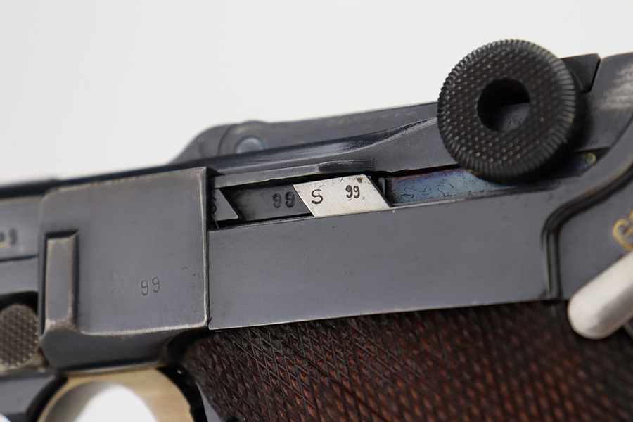 12/1/23 – This is a K Date Mauser Luger issued to the German military in 1934. All matching with the proper K Date military acceptance proofs and “S” proofs throughout. The finish rates about 97%, but we believe it has an old re-blued finish. Fitted with excellent matching-numbered wood grips. Comes with a matching-numbered magazine that has been force-matched. The bore is poor with obvious pitting throughout.