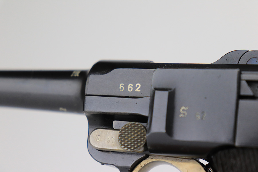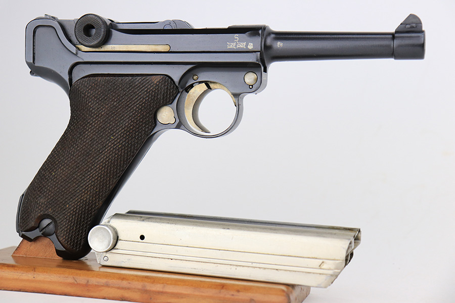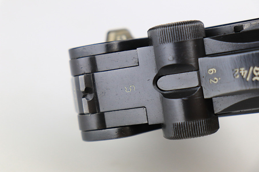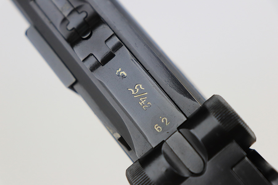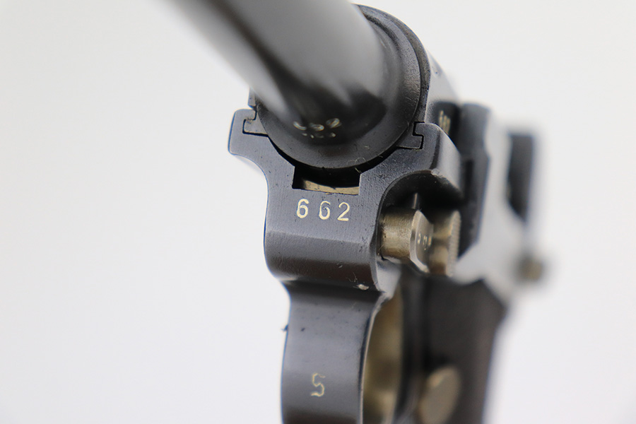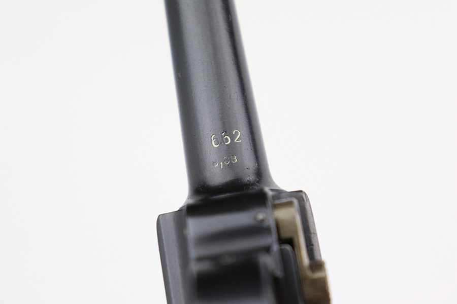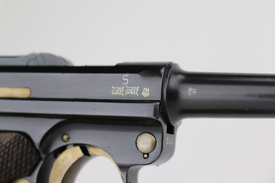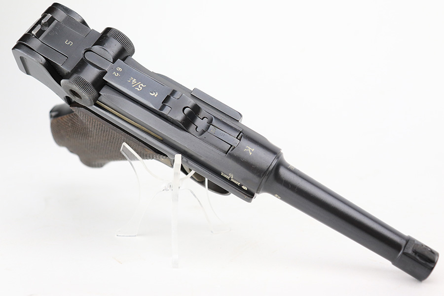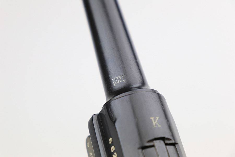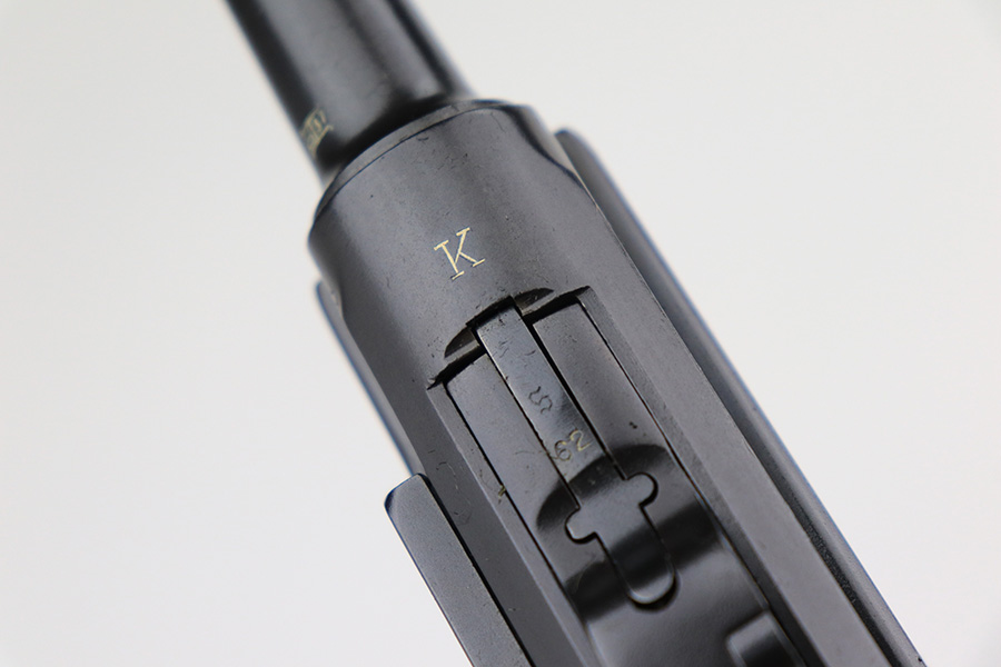 6/15/23 – This is an excellent example of a “K Date” Mauser Luger issued to the Nazi military in 1934. It is all matching and has the proper K Date military acceptance proofs. This one has been completely professionally restored, so the finish is beautiful essentially no signs of wear. Fitted with excellent matching-numbered wood grips. Comes with one original matching-numbered magazine (the one with the “+”) and one force-matched magazine. The rifling in the bore is fairly worn with tiny pitting throughout.